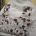 D Tussar Silk Kantha Stole – Off-White, Hand-Embroidered Floral Vines in Magenta, Yellow, Green & Brown