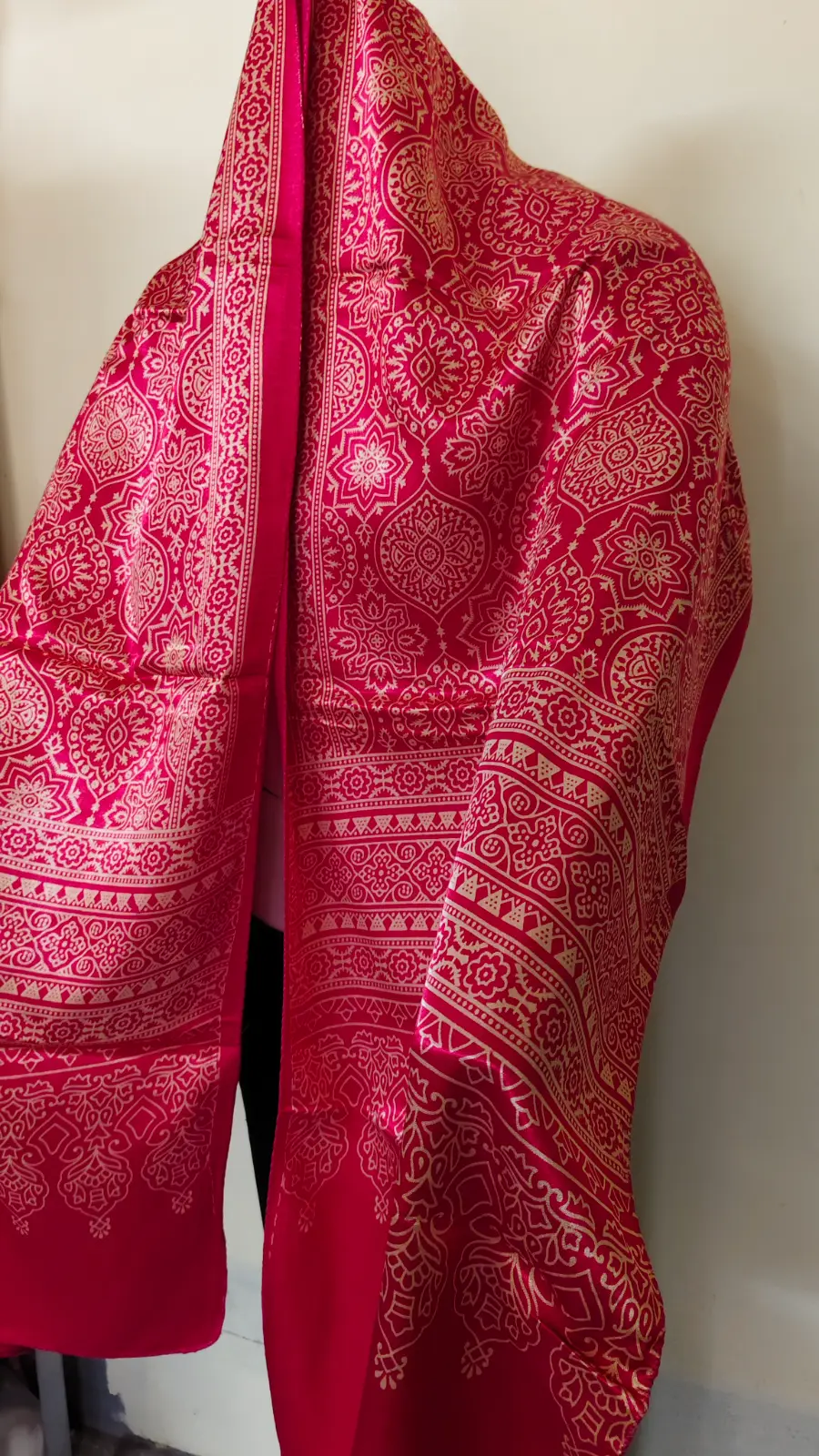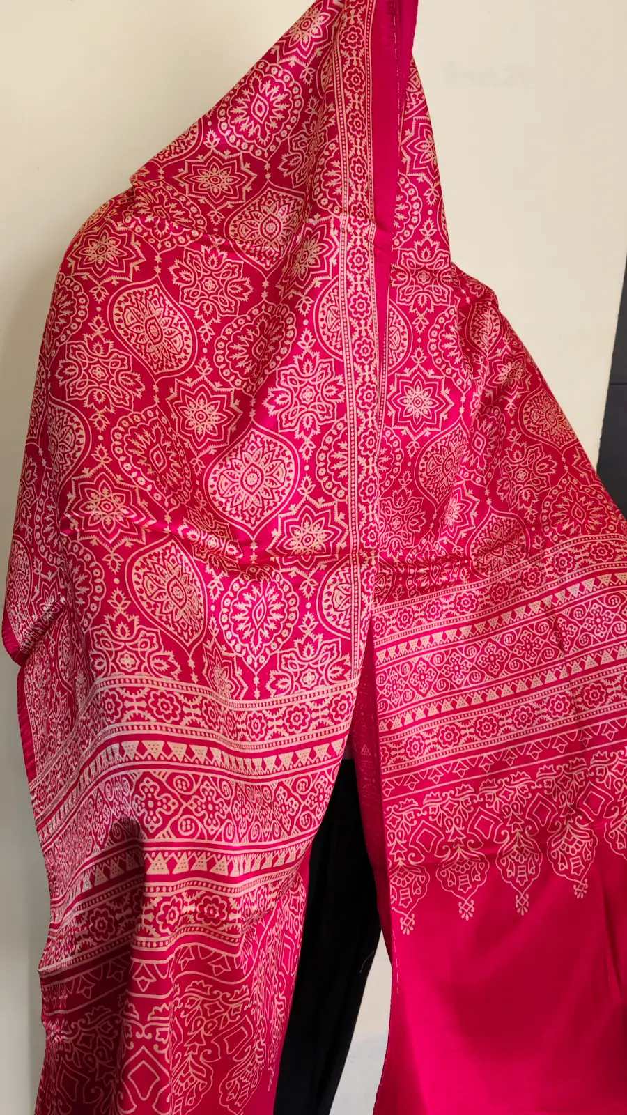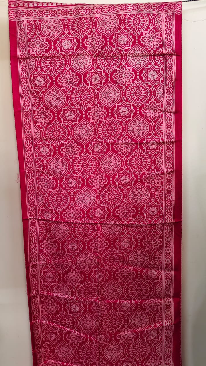 This piece features a bright pink base with lotus-inspired mandala & paisley motifs, completed with a fine ornamental border on both ends. Perfect for elevating both everyday and festive outfits — from cotton kurtis to silk sarees.
