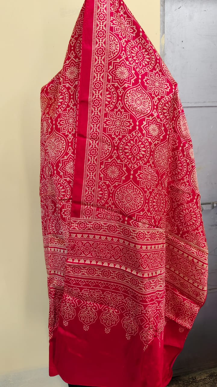 A graceful Mashru Modal Silk stole crafted with traditional Ajrakh handblock printing using natural and resist dyes. The fabric feels feather-soft, has a gentle sheen, and drapes beautifully on the shoulders.