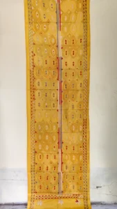 The geometric motif pattern in classic Yellow and white tones reflects the centuries-old Ajrakh craft tradition, dyed using natural or artisan-developed dyes.