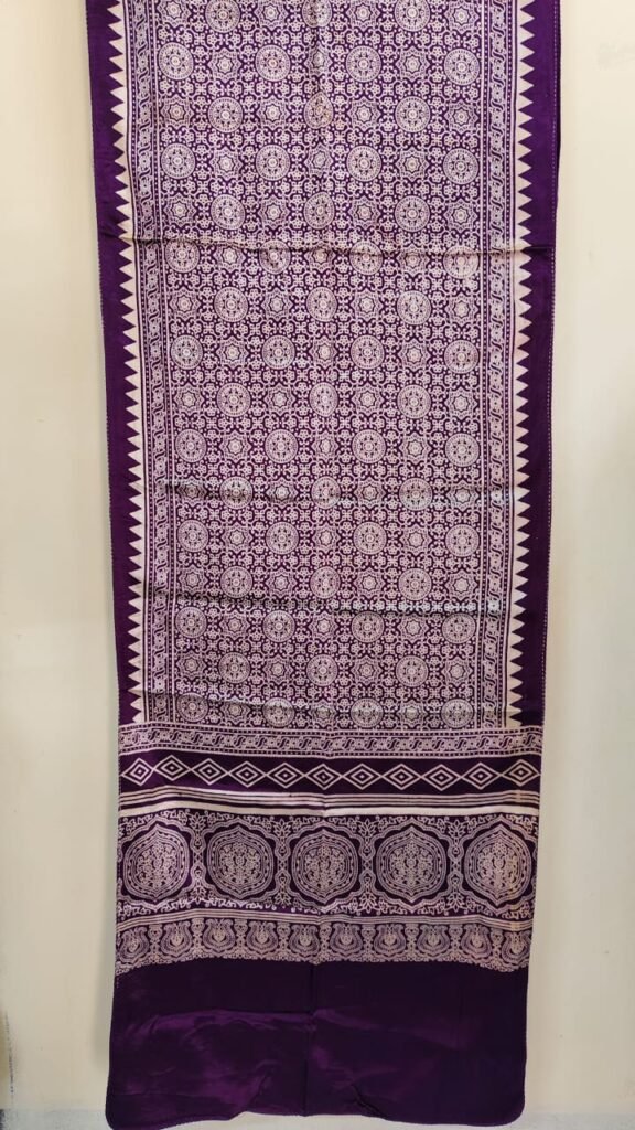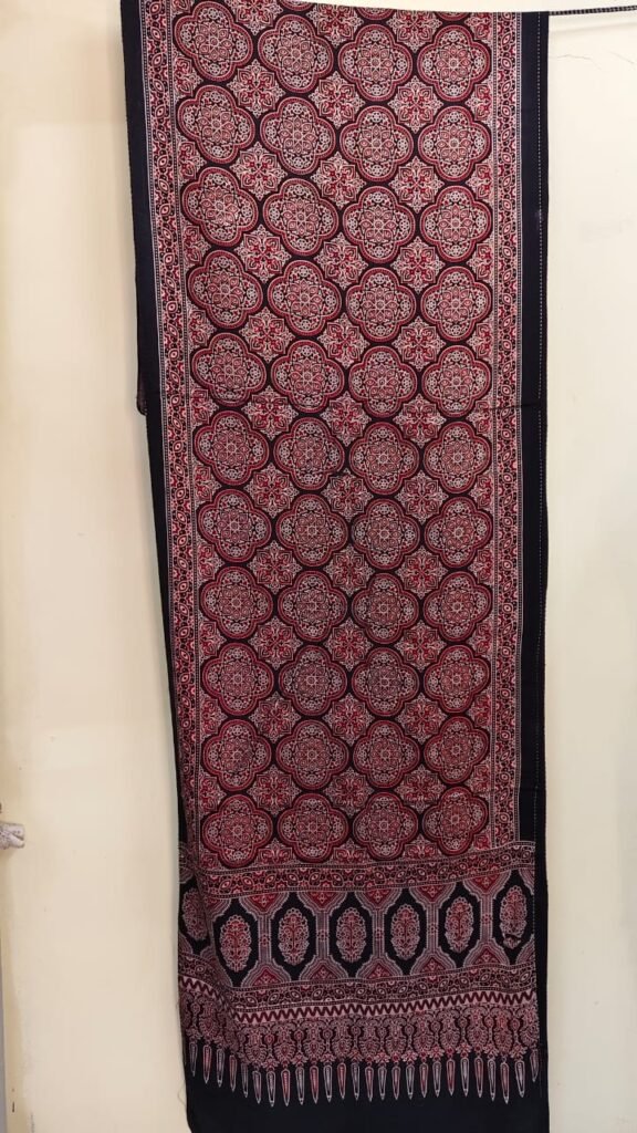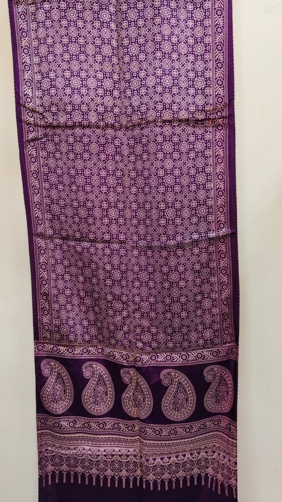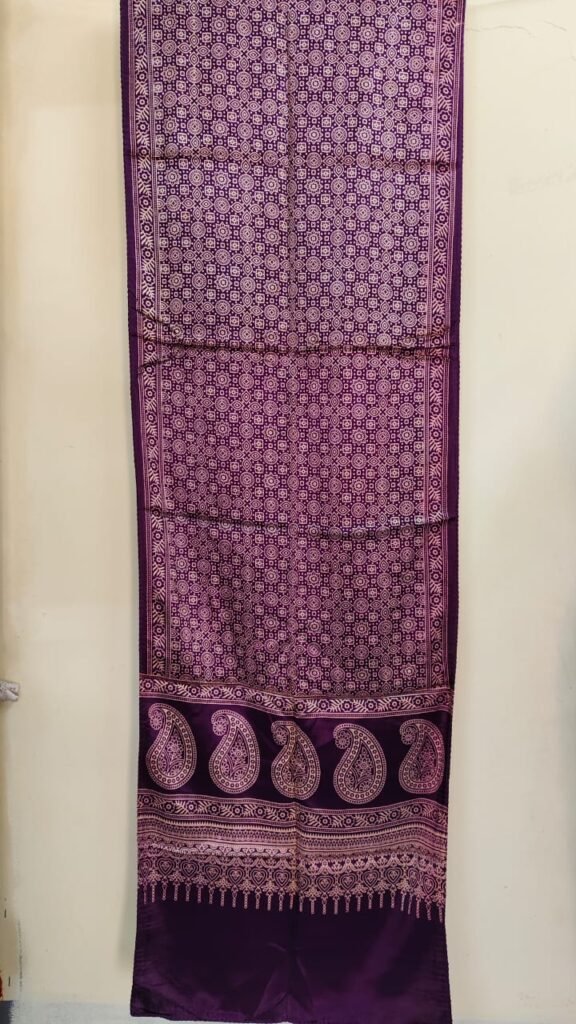 Mashru Modal Silk stole featuring traditional Ajrakh handblock printing, crafted by artisans of Kutch.