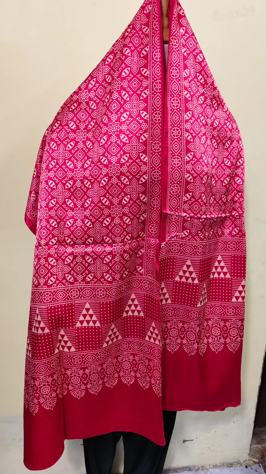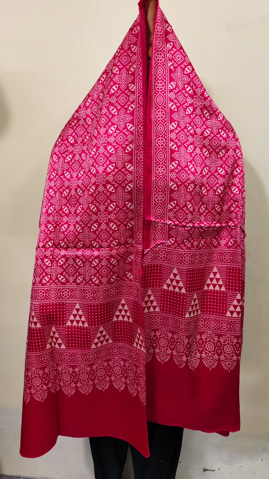 A luxurious Mashru Modal Silk stole featuring traditional Ajrakh handblock printing, crafted by artisans of Kutch.