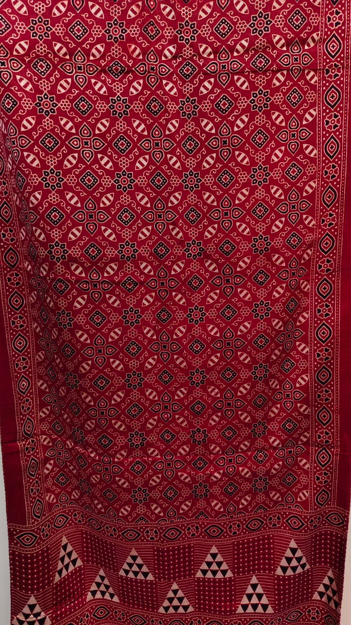 The geometric motif pattern in classic red, black and white tones reflects the centuries-old Ajrakh craft tradition, dyed using natural or artisan-developed dyes.