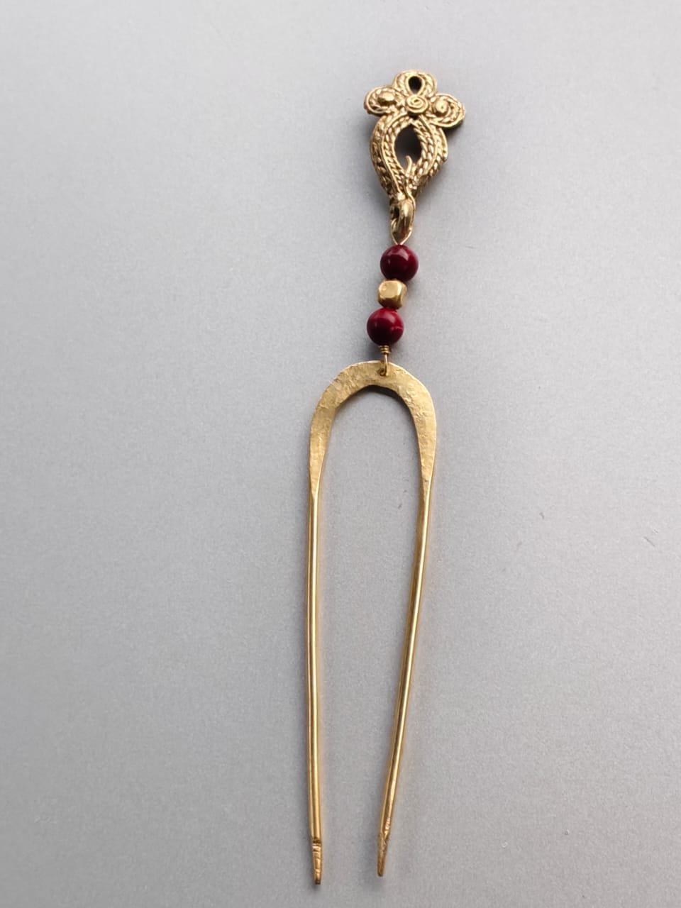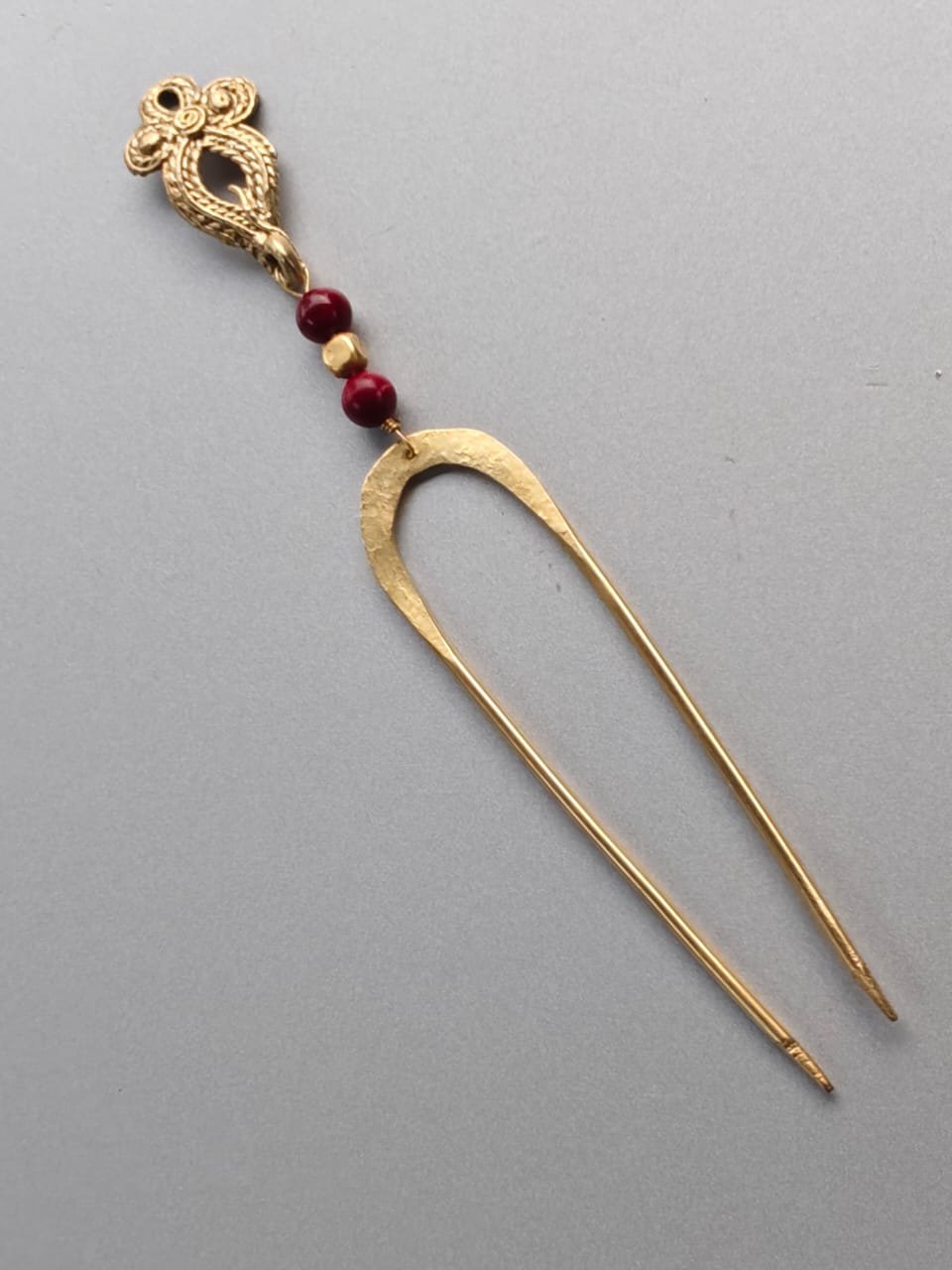 Antique Style Brass Hair Pin (Handcrafted with Red Beads)