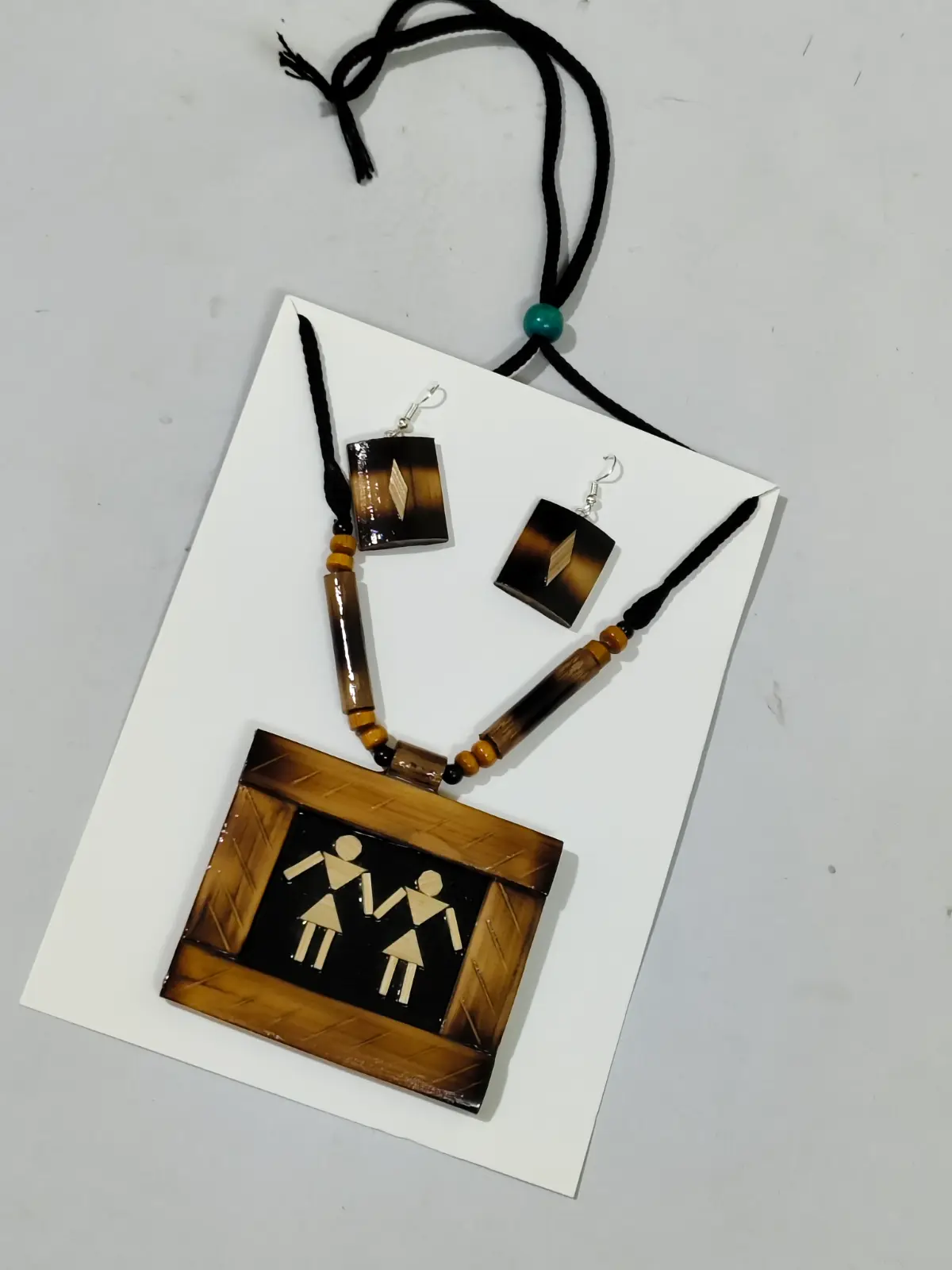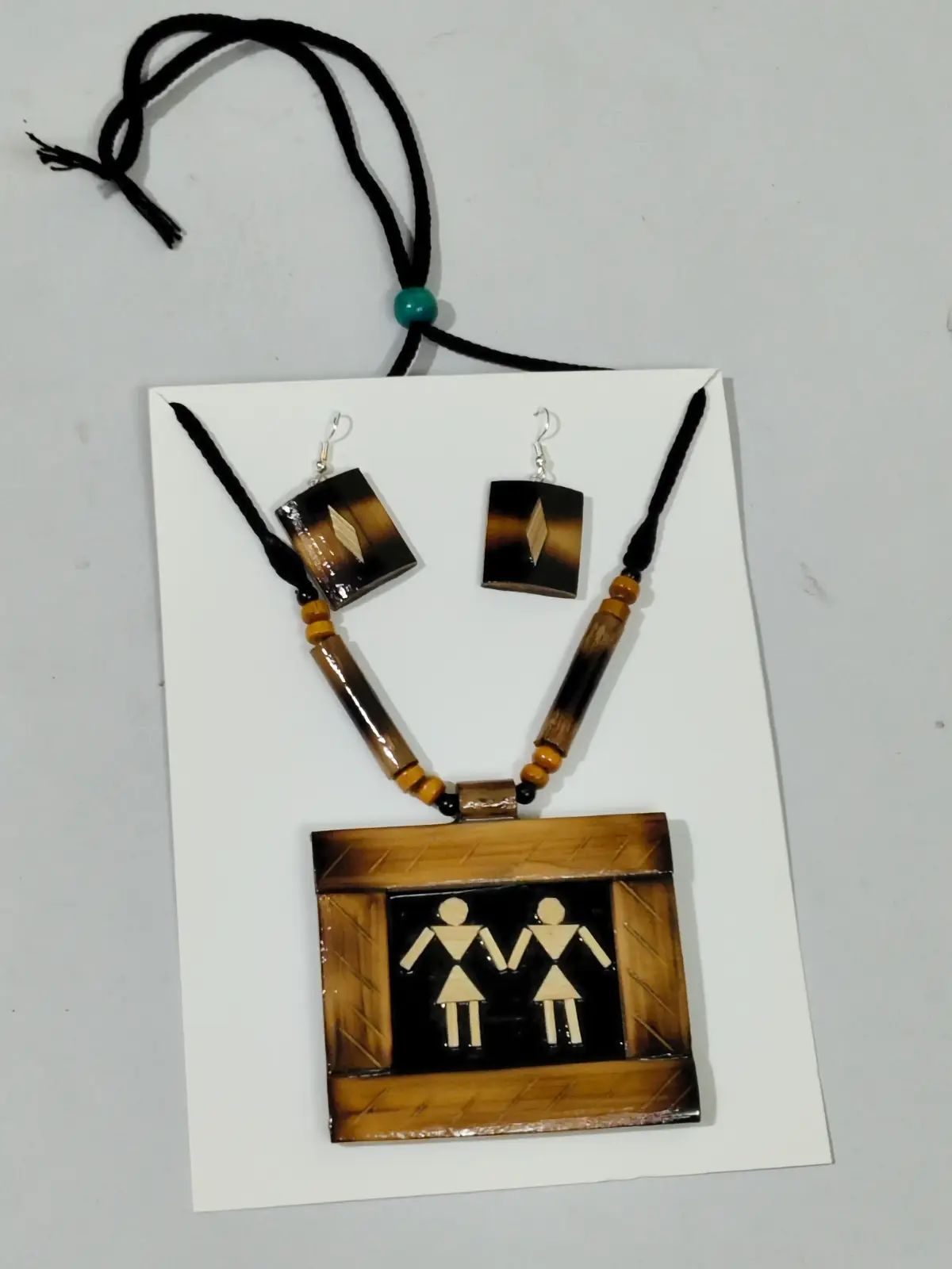 This elegant jewellery set is handcrafted from natural bamboo, showcasing traditional artisan craftsmanship and eco-friendly materials. The warm brown bamboo tones with black cord detailing create a unique rustic look, while the pendant features a charming tribal couple motif that highlights folk-inspired artistry. The set includes a statement necklace with a rectangular bamboo pendant and a matching pair of lightweight earrings. Comfortable to wear and perfect for ethnic outfits, casual gatherings, or cultural events. Each piece is carefully handmade, making every set slightly unique.