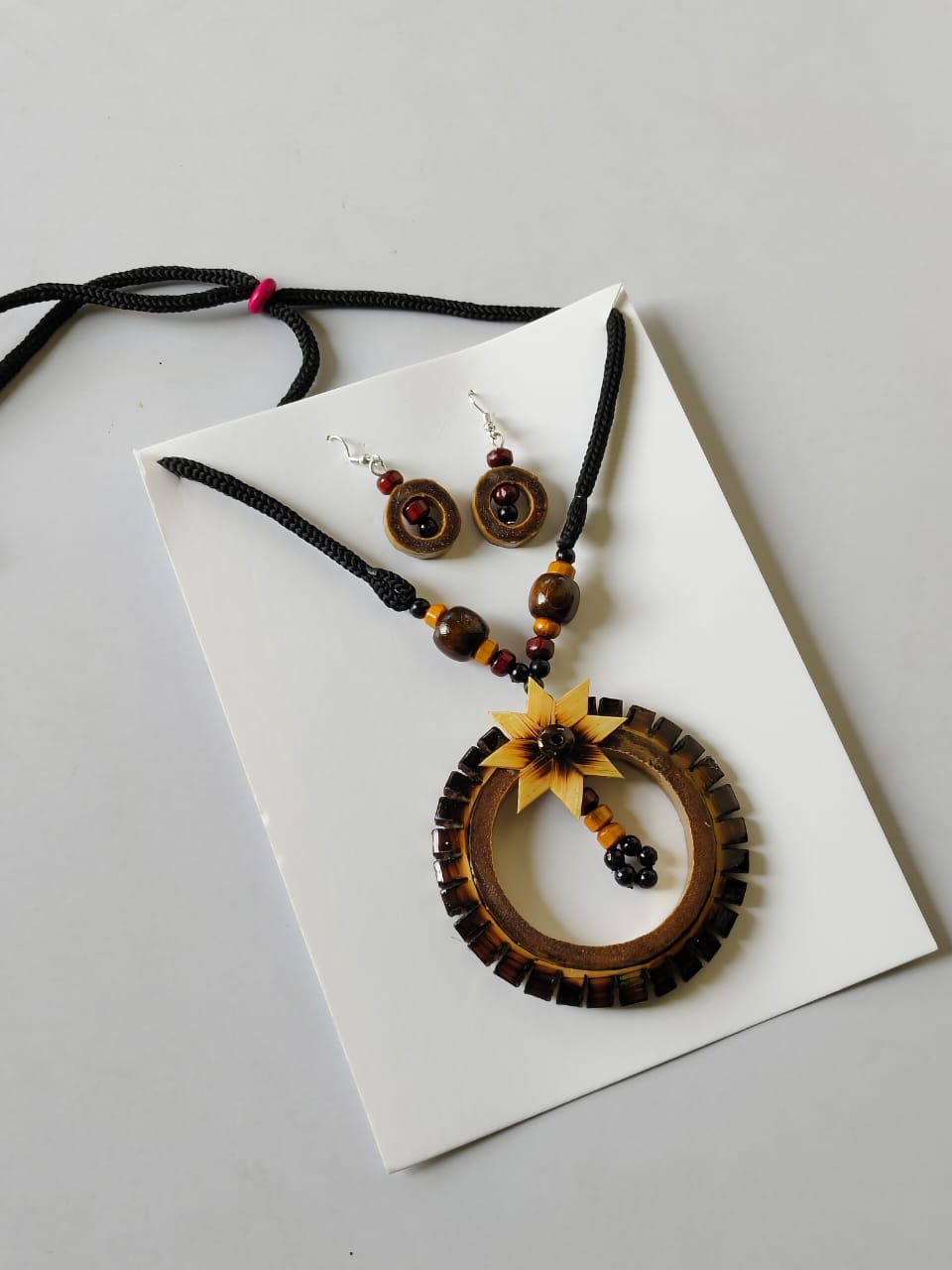 This handcrafted jewellery set features a circular bamboo pendant decorated with a finely carved floral star motif at the center. The matching earrings are designed in a natural seed-inspired shape, polished with warm brown tones for an earthy, tribal charm. Lightweight, skin-friendly, and easy to pair, this set suits sarees, kurtis, handloom outfits, and Indo-boho fusion wear.