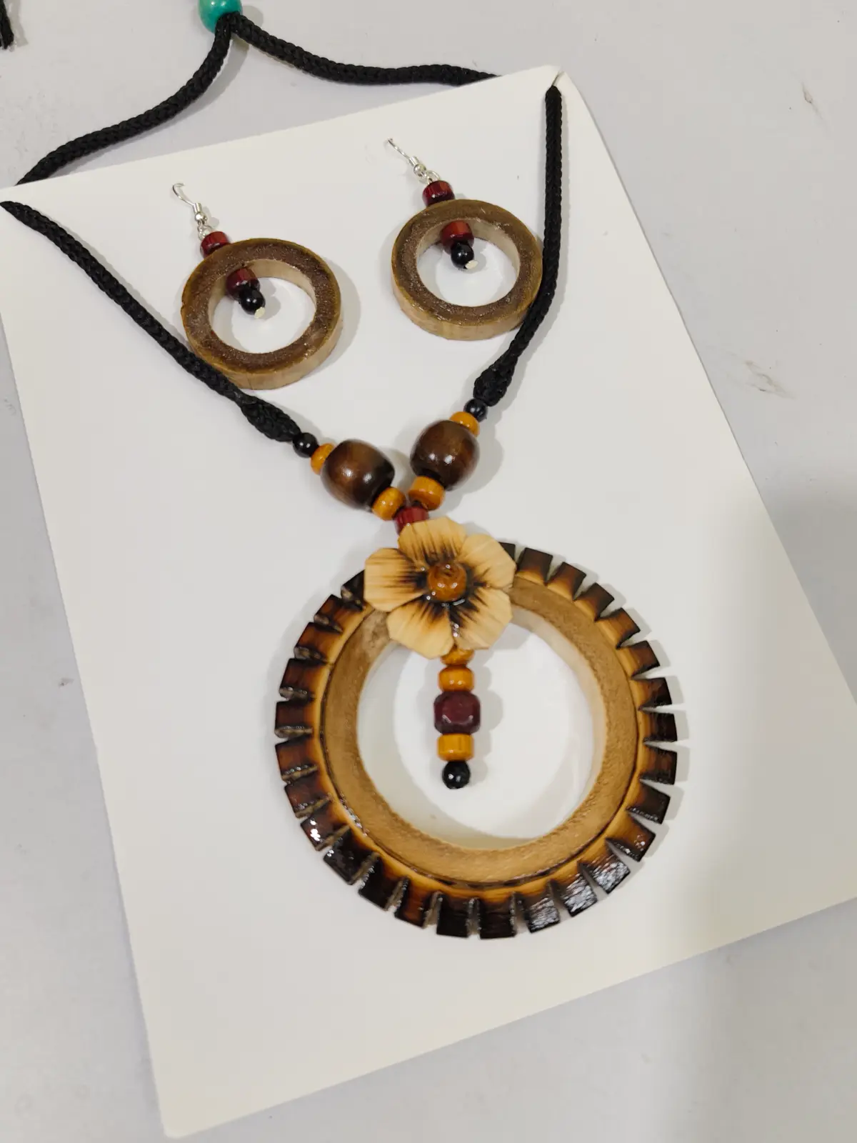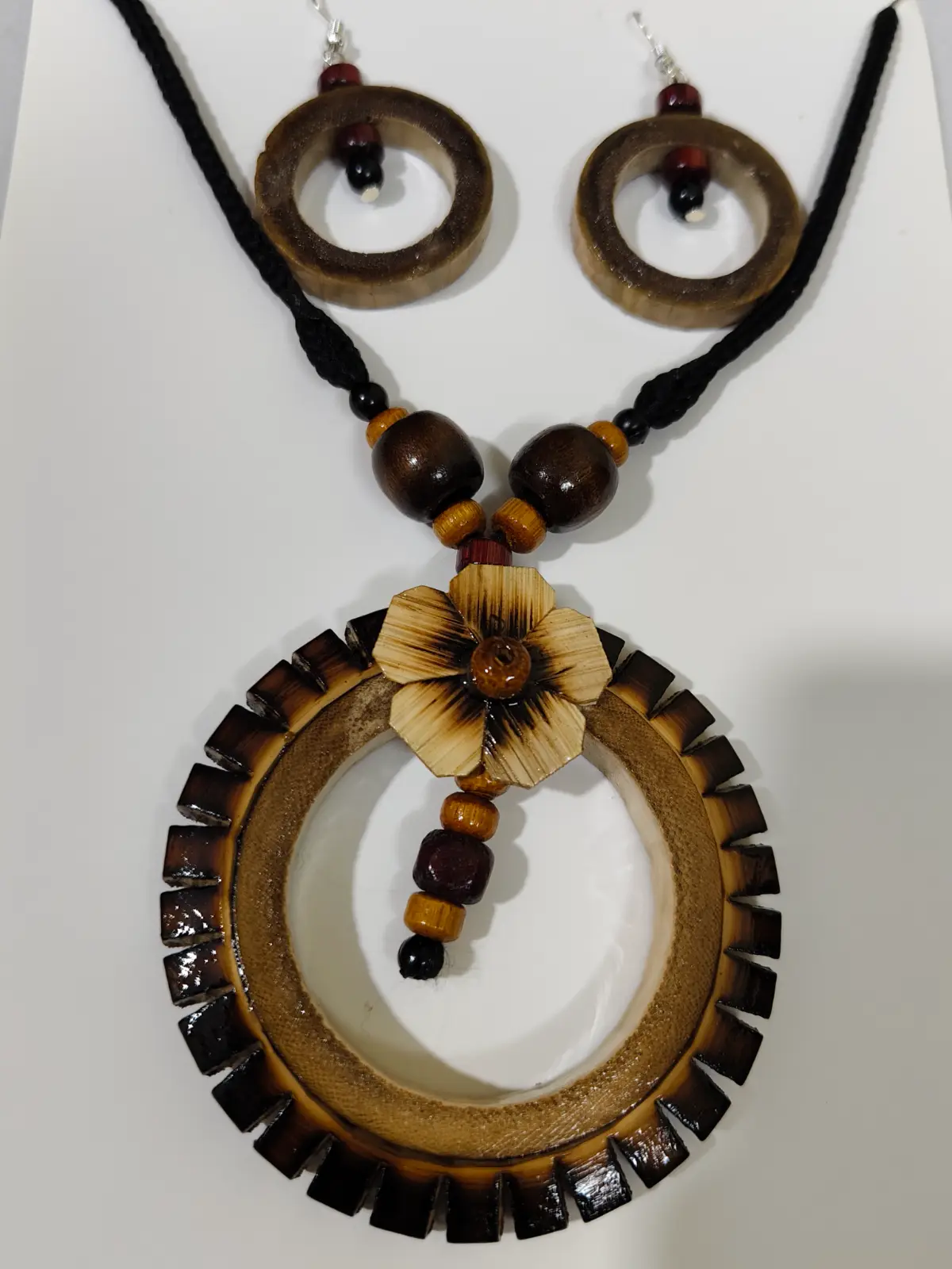 This handcrafted jewellery set features a circular bamboo pendant decorated with a finely carved floral star motif at the center. The matching earrings are designed in a natural seed-inspired shape, polished with warm brown tones for an earthy, tribal charm. Lightweight, skin-friendly, and easy to pair, this set suits sarees, kurtis, handloom outfits, and Indo-boho fusion wear.