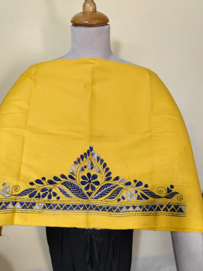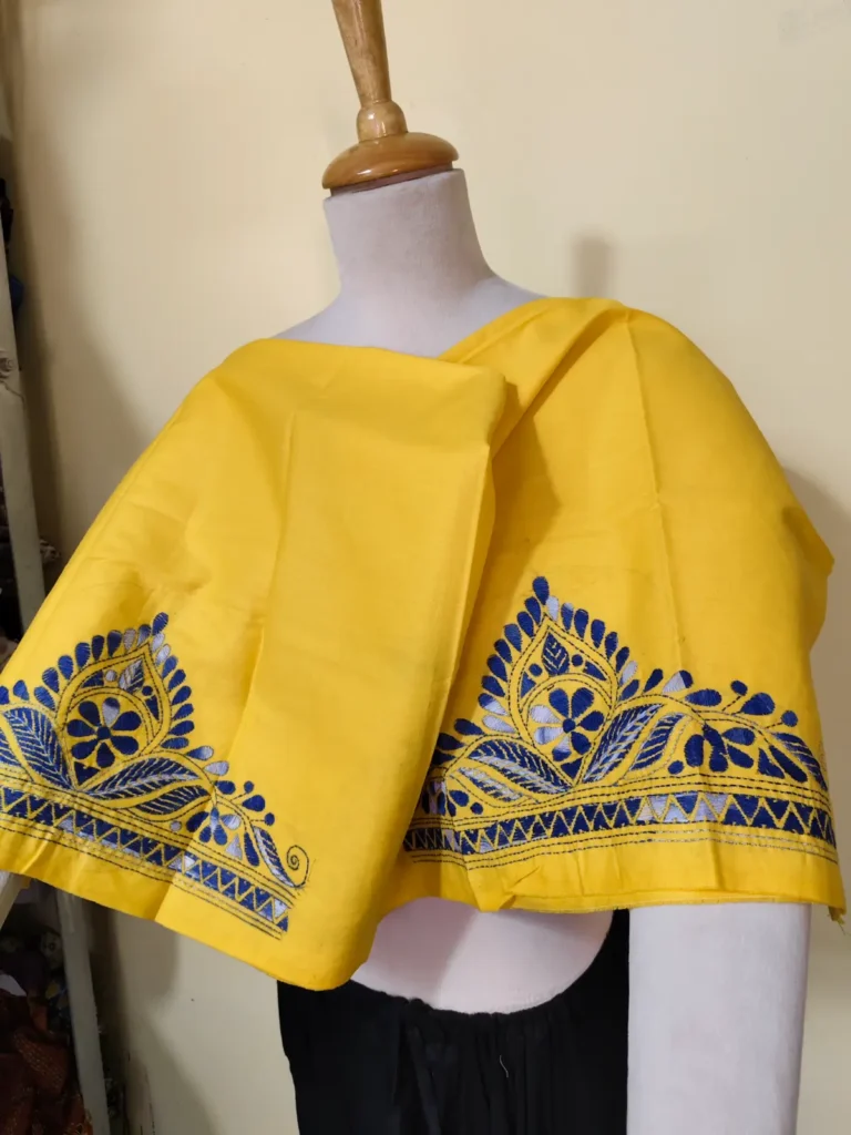 This elegant handcrafted Kantha stitch blouse fabric is made from soft pure cotton in a soothing beige tone. Adorned with yellow floral embroidery and green leaf motifs, it reflects the traditional artistry of Bengal artisans. The neat stitch lines at the bottom give the fabric a refined, symmetrical look—perfect for pairing with sarees, skirts, or fusion outfits.