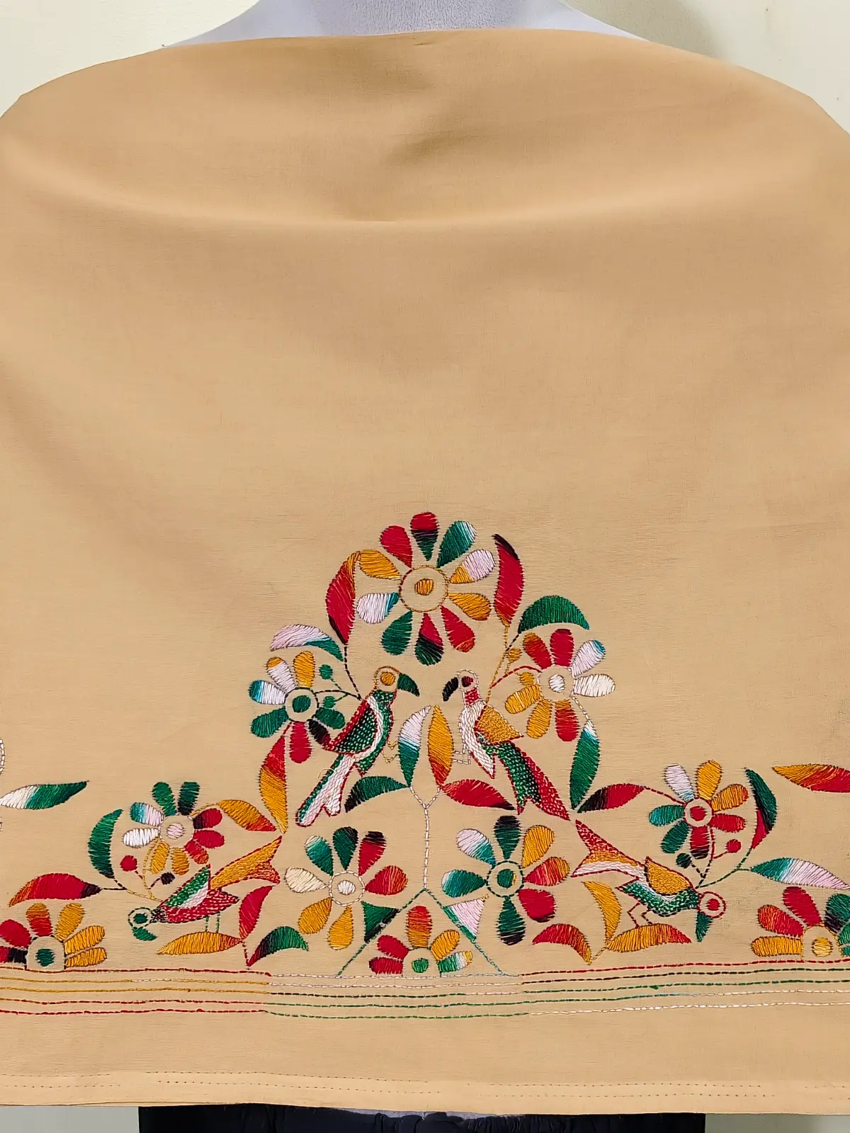 Add elegance and charm to your ethnic wear by adorning this beautiful beige cotton blouse with hand embroidered Kantha stitch work. The design showcases vibrant birds, floral designs and leafy vines in a stunning blend of multi-coloured thread work, creating a nature-inspired masterpiece.