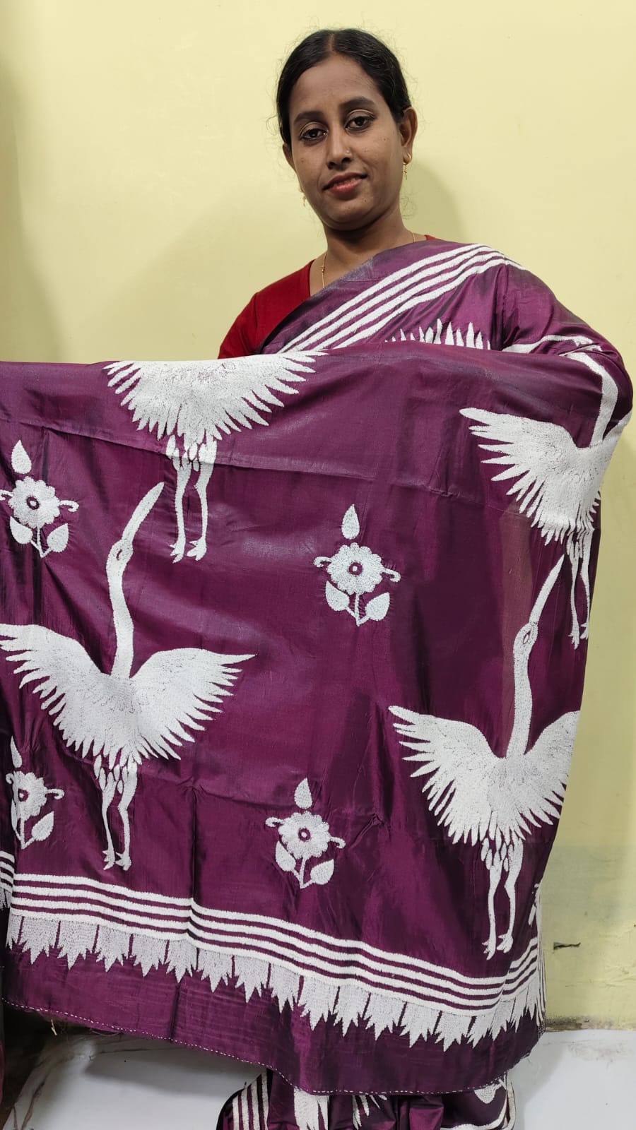 A beautifully crafted Art Silk saree featuring traditional Bengal Kantha stitch embroidery, hand-worked with precision. The saree showcases elegant white crane motifs, floral elements, and fine stitch detailing across the drape. The smooth Art Silk base offers a soft, glossy finish, while the intricate threadwork adds richness and cultural charm. Perfect for festive occasions, cultural events, and special celebrations. Each saree is artisan-made, ensuring uniqueness in every piece.