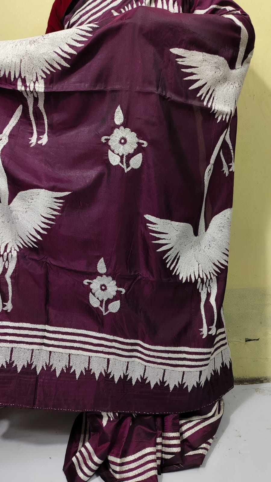 Bengal Kantha Stitch Art Silk Saree – White Crane Motif (Hand-Embroidered)