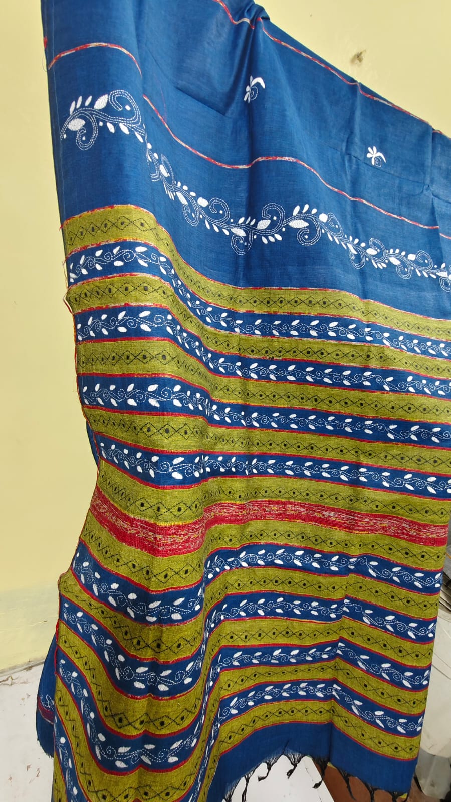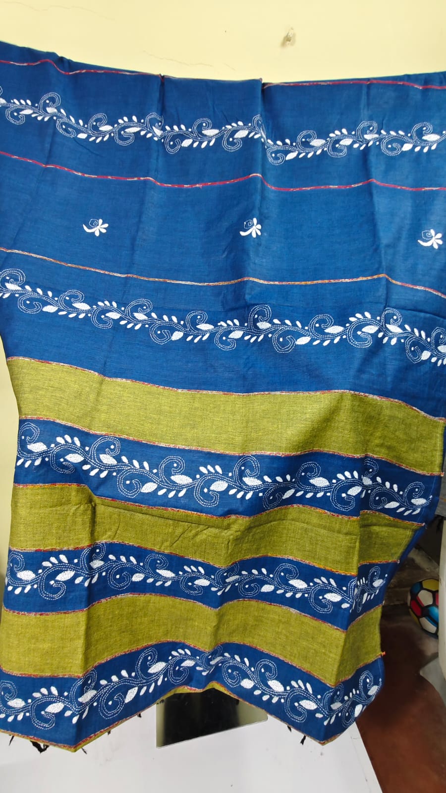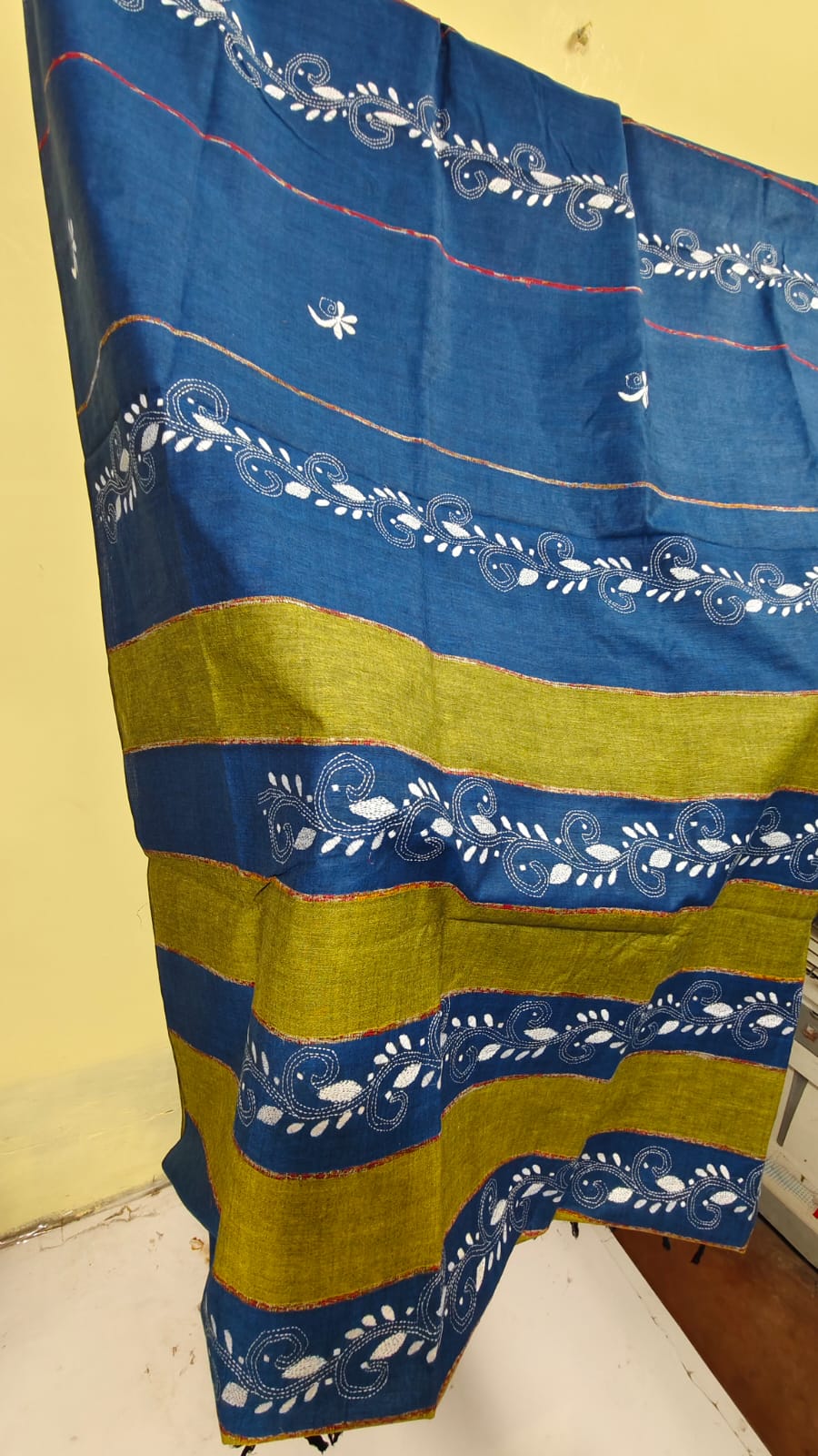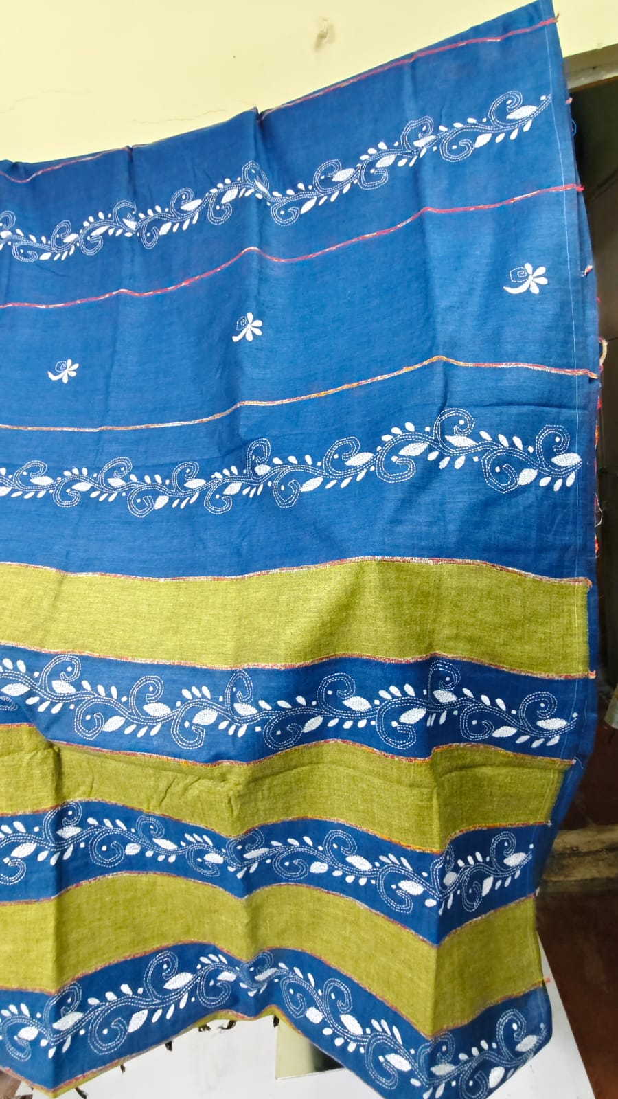 Bengal Kantha Stitch Khadi Cotton Saree – Royal blue color