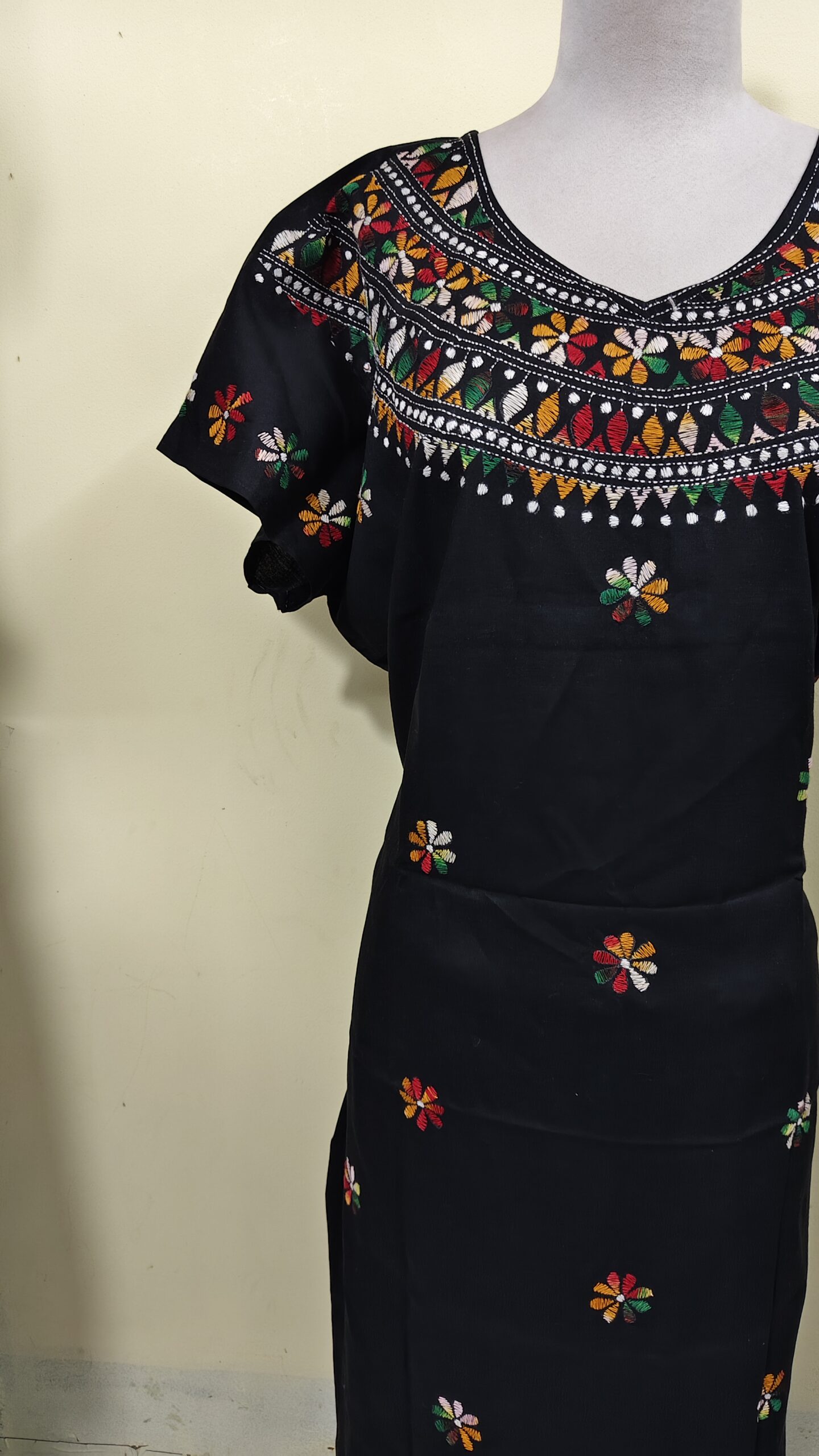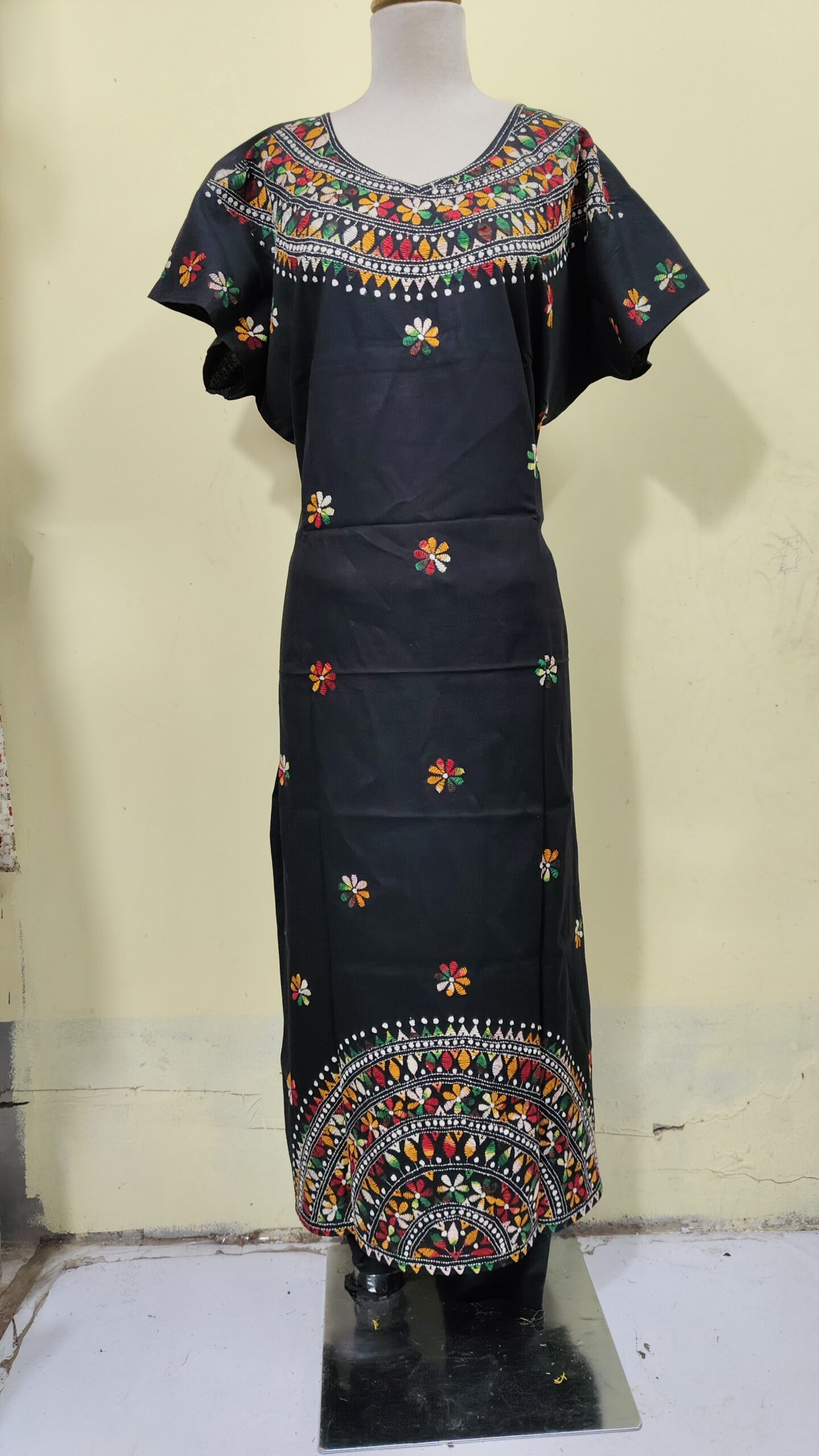 Black Color Cotton Kantha Stitch Kaftan Nighty for Women