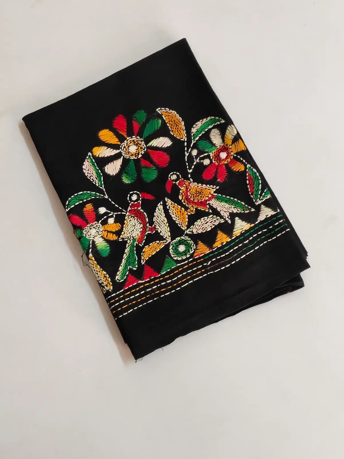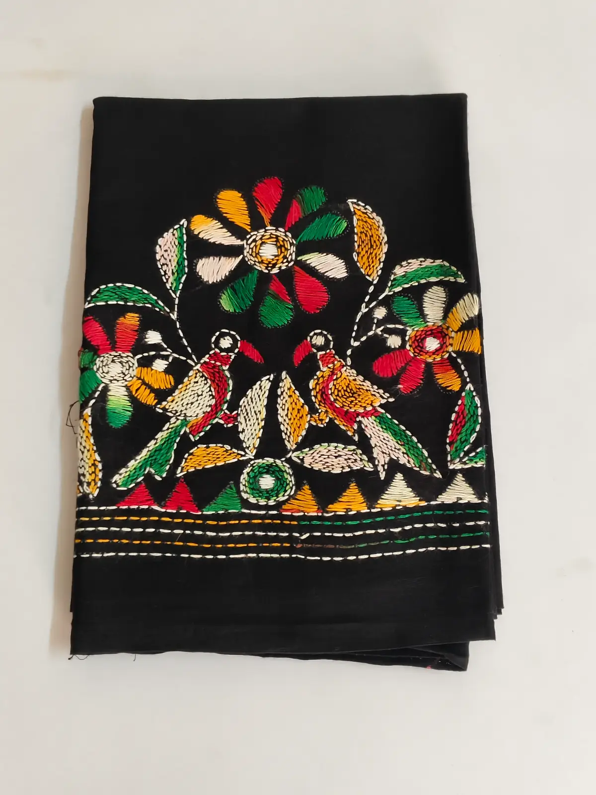 Black Kantha Stitch Blouse Piece – Flower and bird motifs