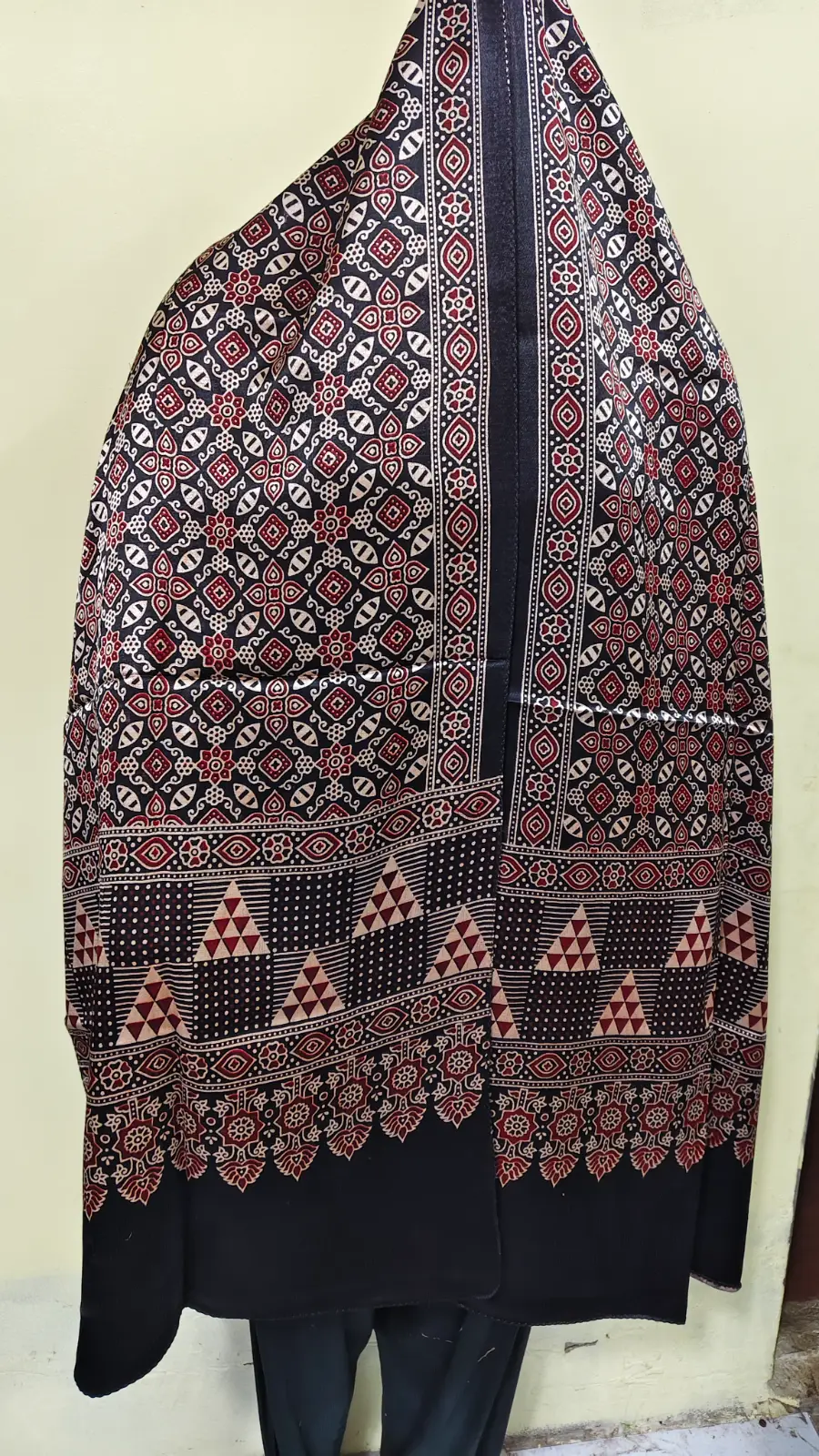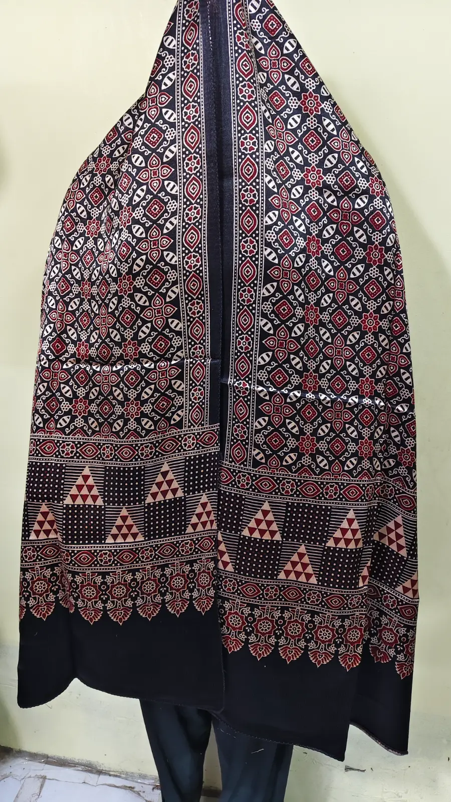A luxurious Mashru Modal Silk stole featuring traditional Ajrakh handblock printing, crafted by artisans of Kutch.