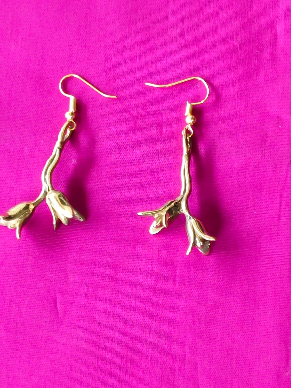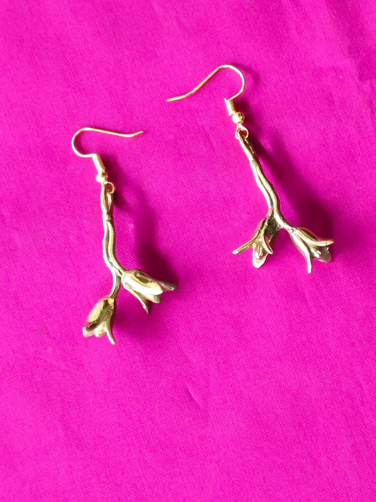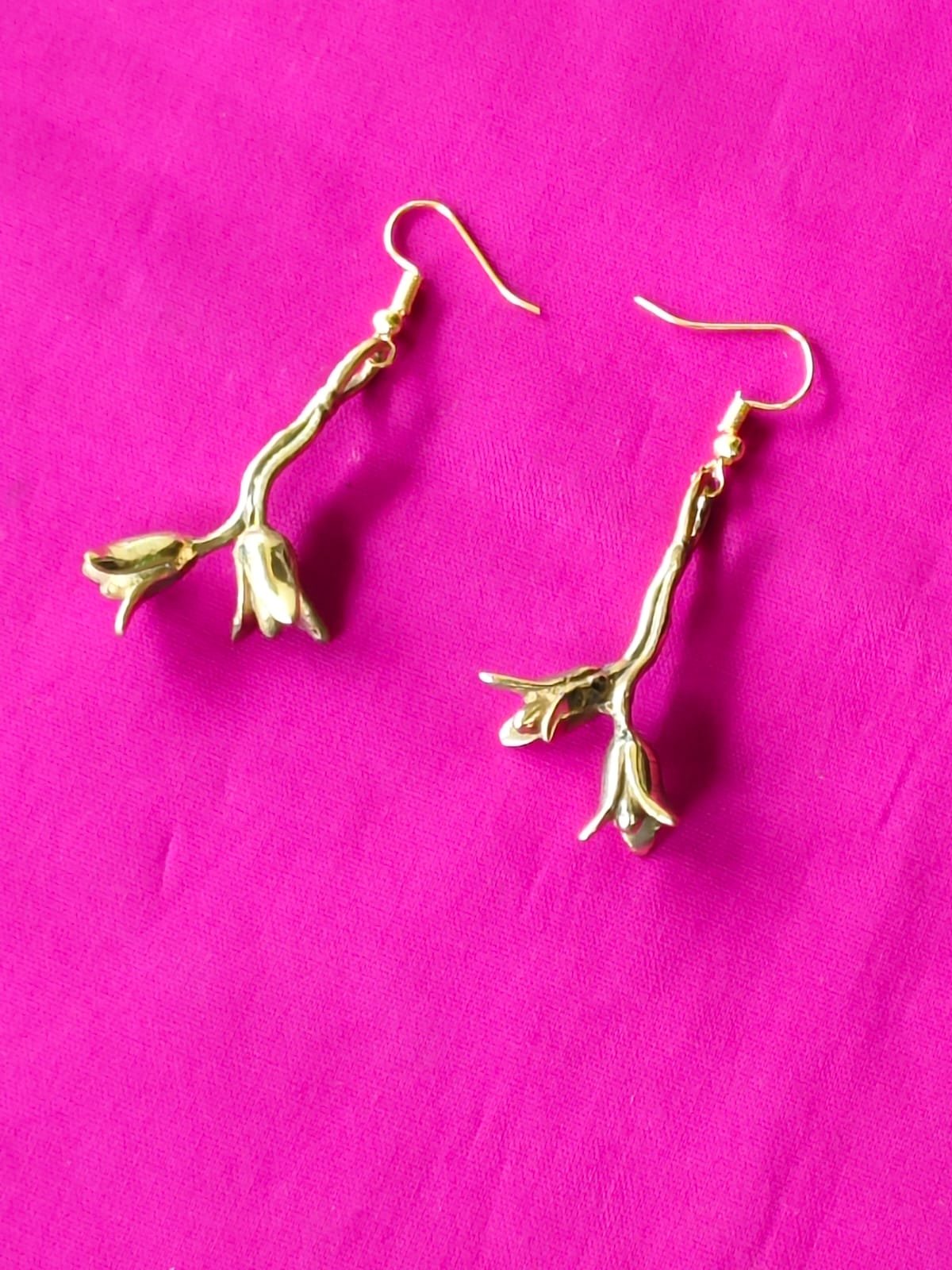 Handcrafted brass earrings shaped like delicate twigs with budding flowers. Lightweight, antique-gold finish with easy fish-hook wear—subtle movement and a natural, sculptural look that pairs with both ethnic and contemporary outfits.