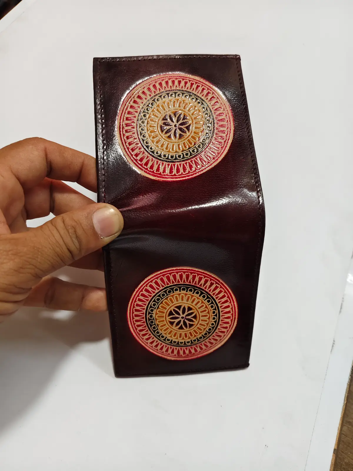 This elegant handcrafted leather wallet in classic black features a beautifully embossed circular design, blending tradition with modern style. Made from high-quality leather, it ensures durability and sophistication, making it a perfect everyday accessory.