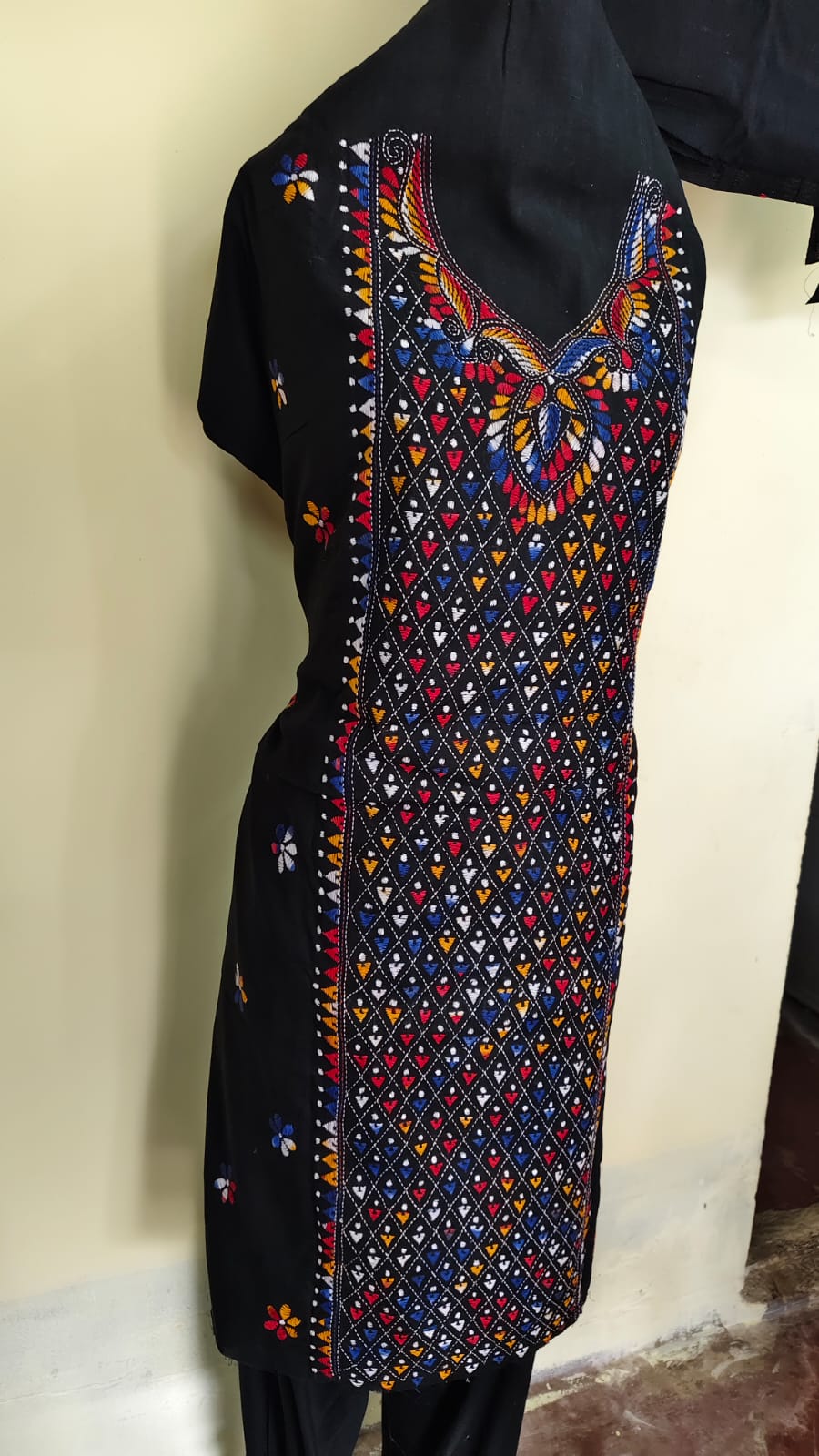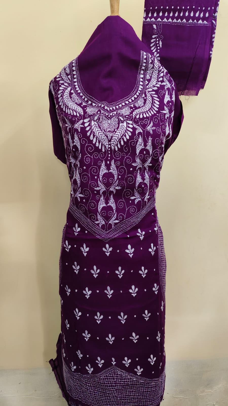 ✅Enhance your ethnic charm with this beautifully handcrafted Kantha stitch 3-piece salwar suit dress material set designed for comfort, elegance and versatility. This unstitched set features a top, bottom and dupatta made of 100% cotton, adorned with intricate Kantha stitch embroidery and traditional Kantha stitch patterns.