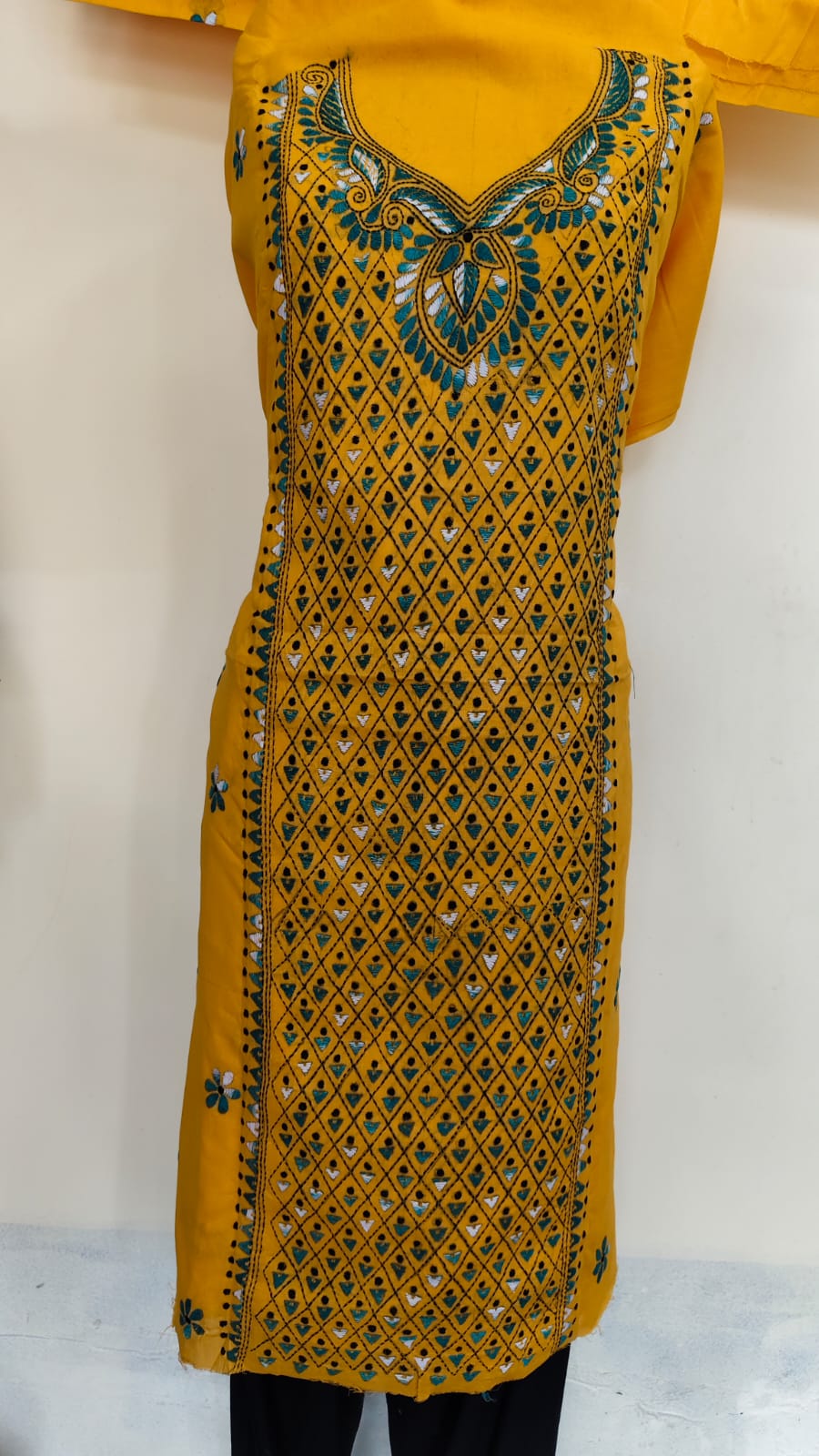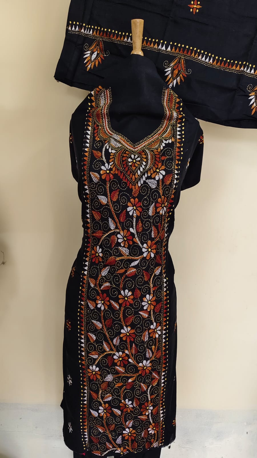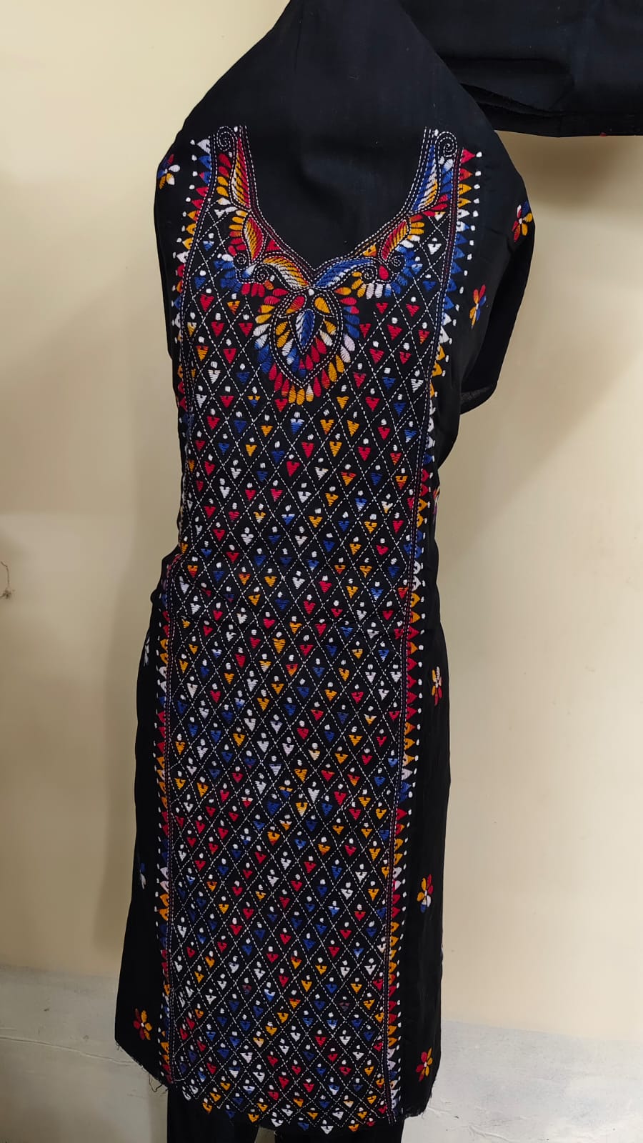 Handcrafted: Cotton Kantha Stitch Salwar Suit Material 3-piece Set, Unstitched Top: 2.5 M, Bottom: 2.5M, Dupatta: 2M, Total length:- 7M, Width: 36 inches (Net Quantity 1 piece set)