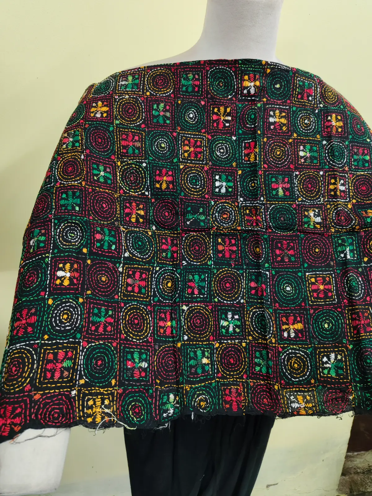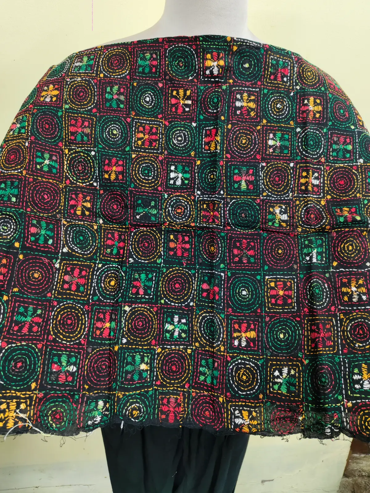 Soft cotton fabric embellished with traditional Bengal Kantha hand embroidery.