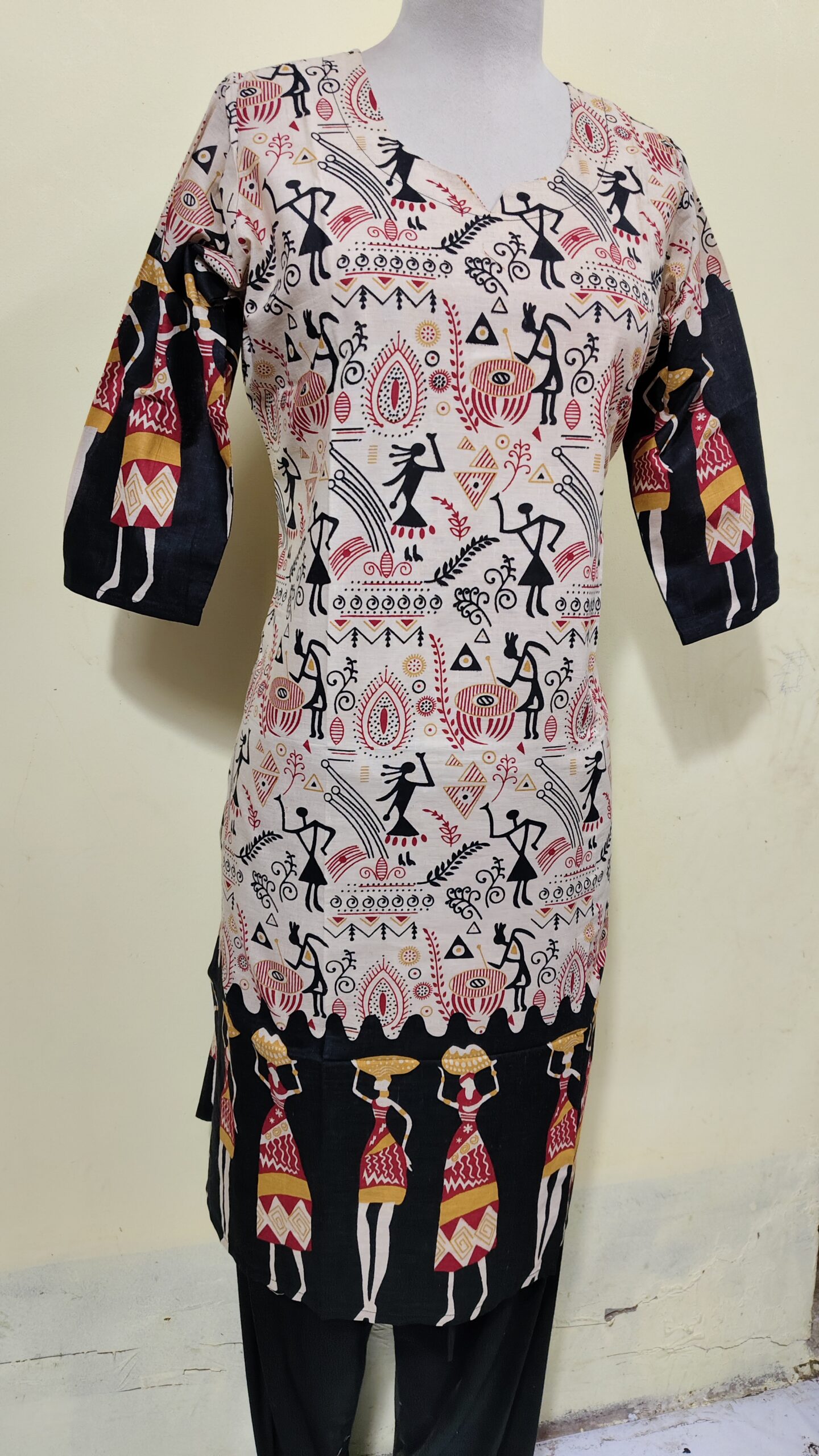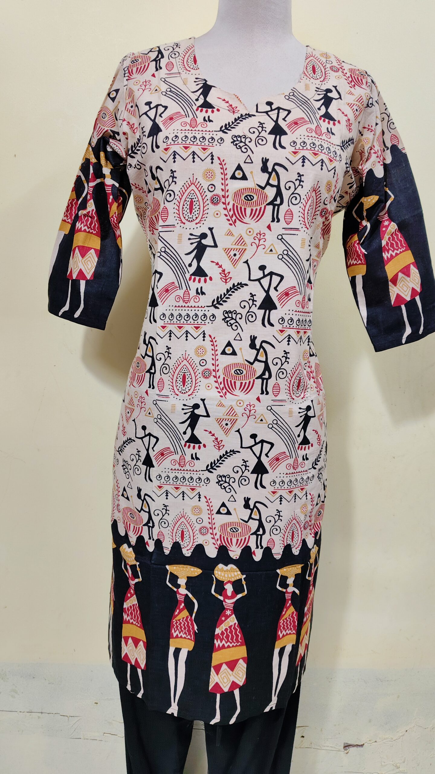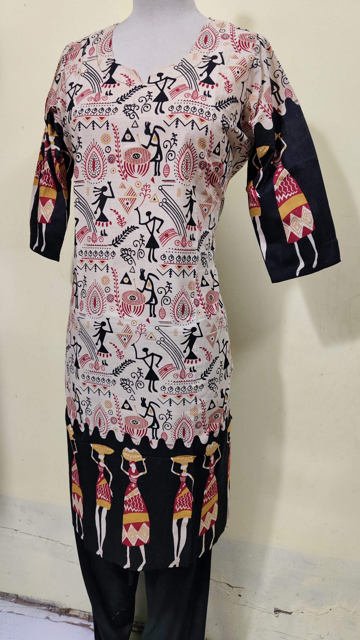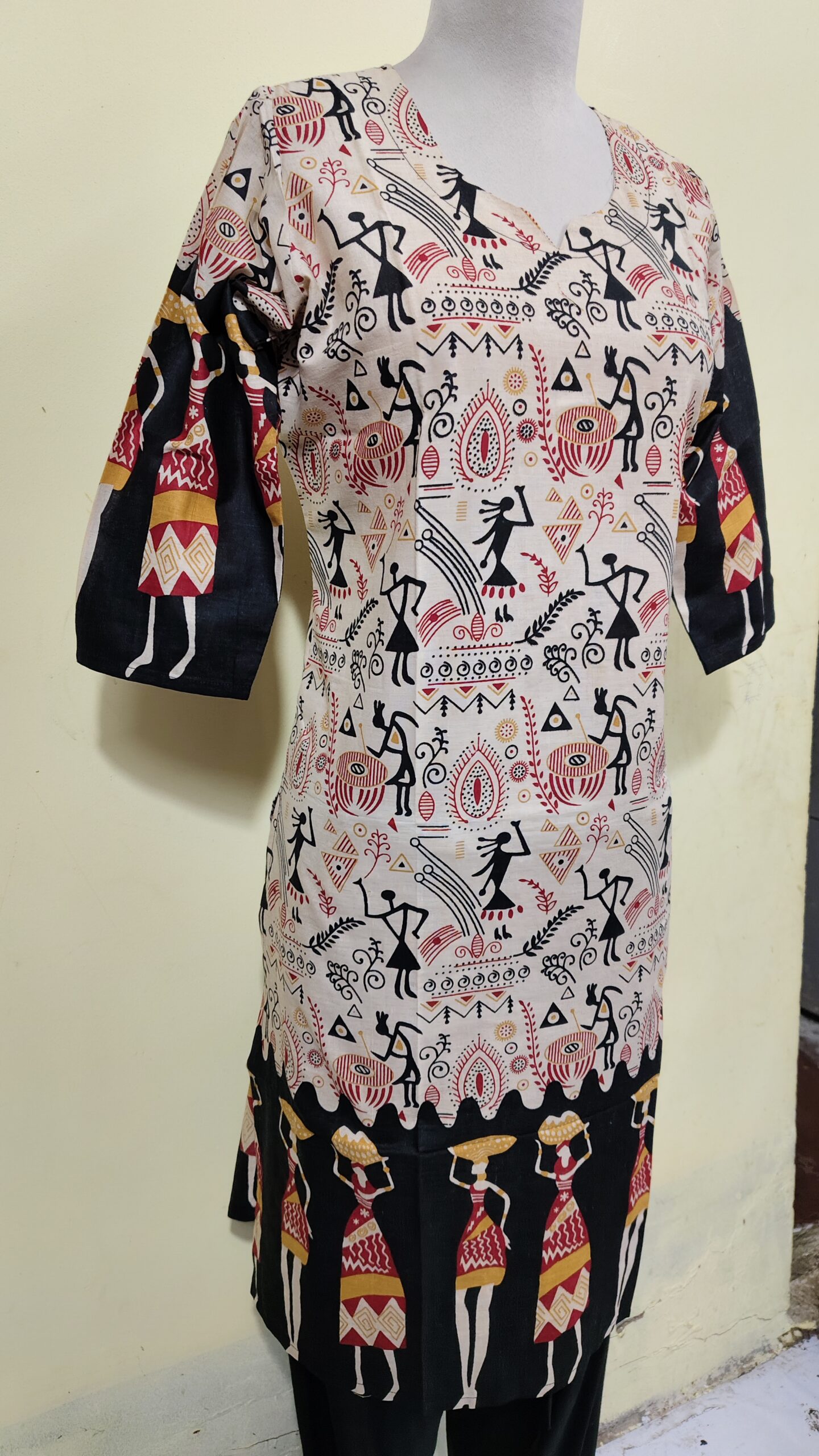 This stylish cotton kurti is crafted from soft, breathable cotton fabric and features vibrant Warli art–inspired prints across the body. The design combines off-white, black, and red motifs with tribal figures and geometric patterns that give it a unique ethnic character. It is designed with contrast black sleeves featuring colorful tribal artwork and a decorative scalloped hem that adds a modern touch. Comfortable and lightweight, this kurti is perfect for everyday wear, casual outings, or cultural gatherings. Each piece carries a handcrafted-inspired artistic look that makes it stand out. For best care, gentle hand-wash and dry in shade, and iron on reverse side.