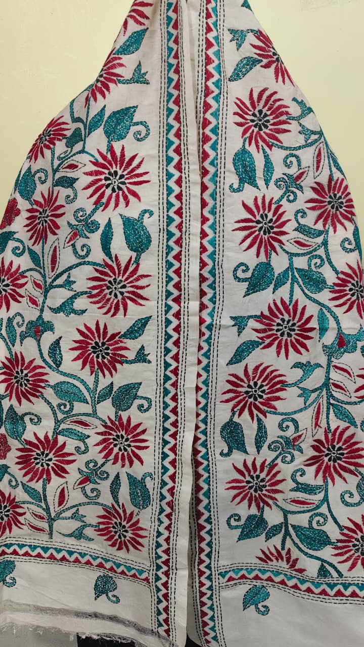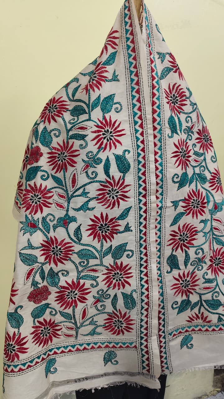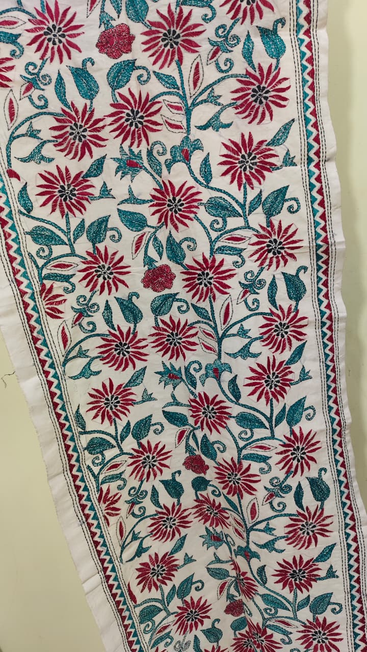 This is a premium soft de tussar silk stole, enriched with delicate hand kantha embroidery.
