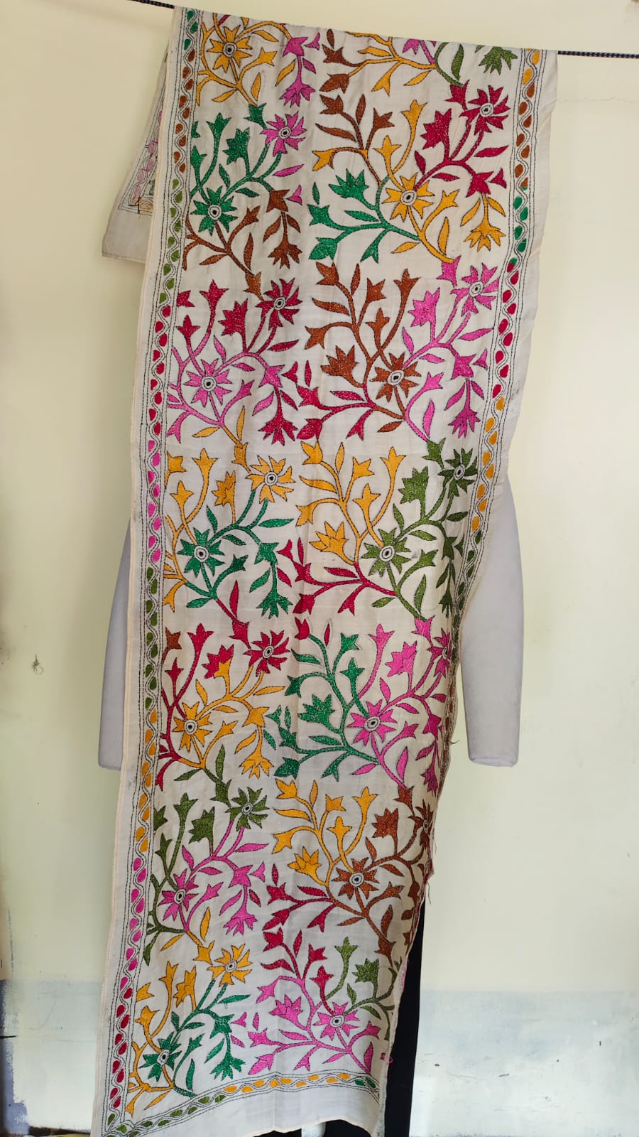 D Tussar Silk Kantha Stole – Off-White, Hand-Embroidered Floral Vines in Magenta, Yellow, Green & Brown