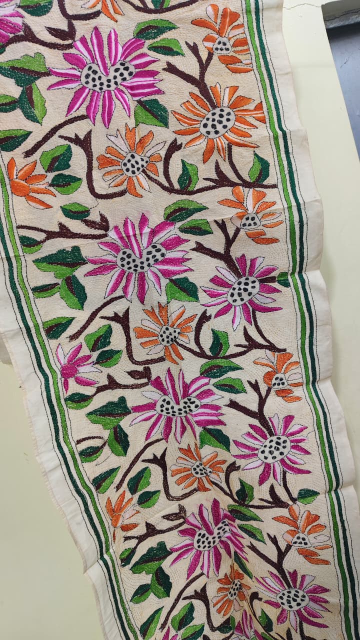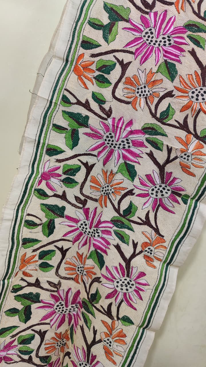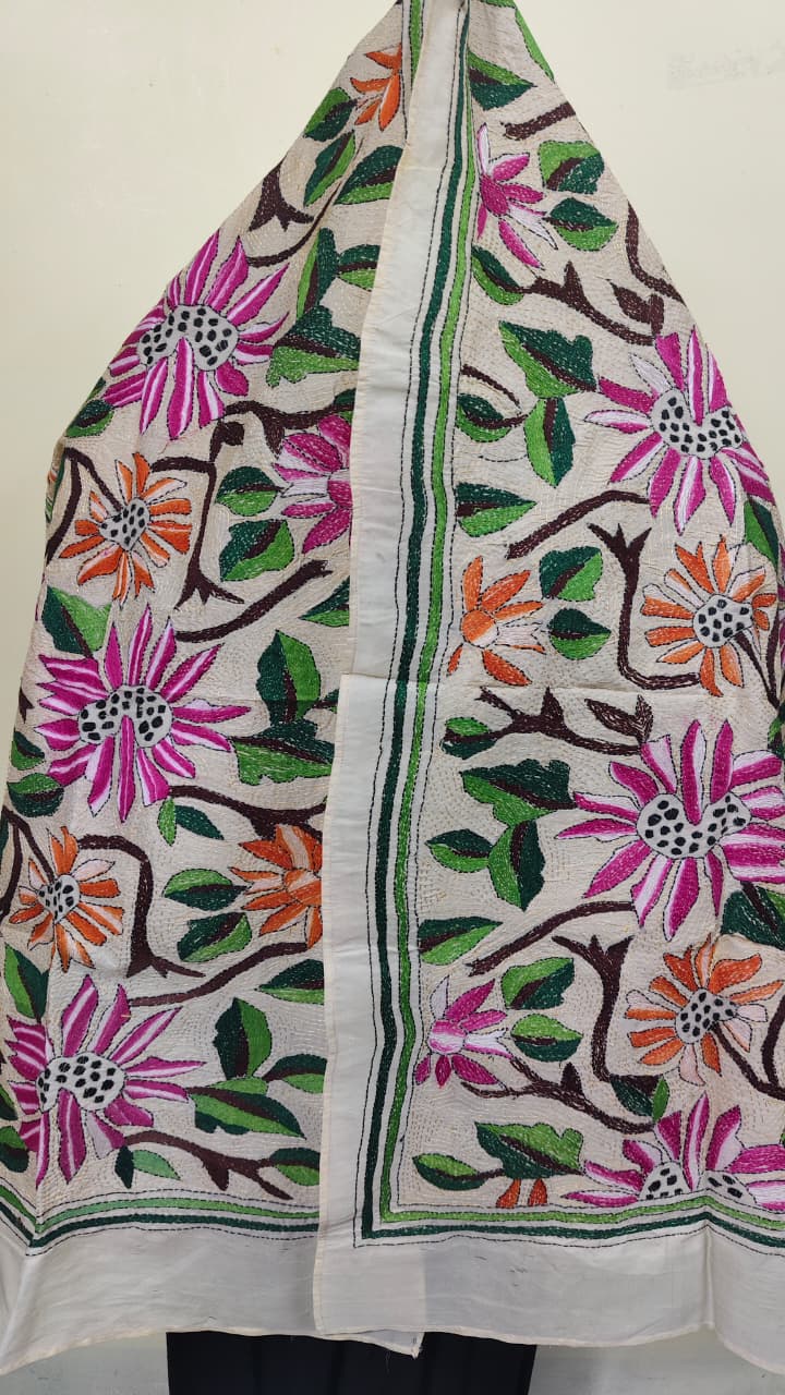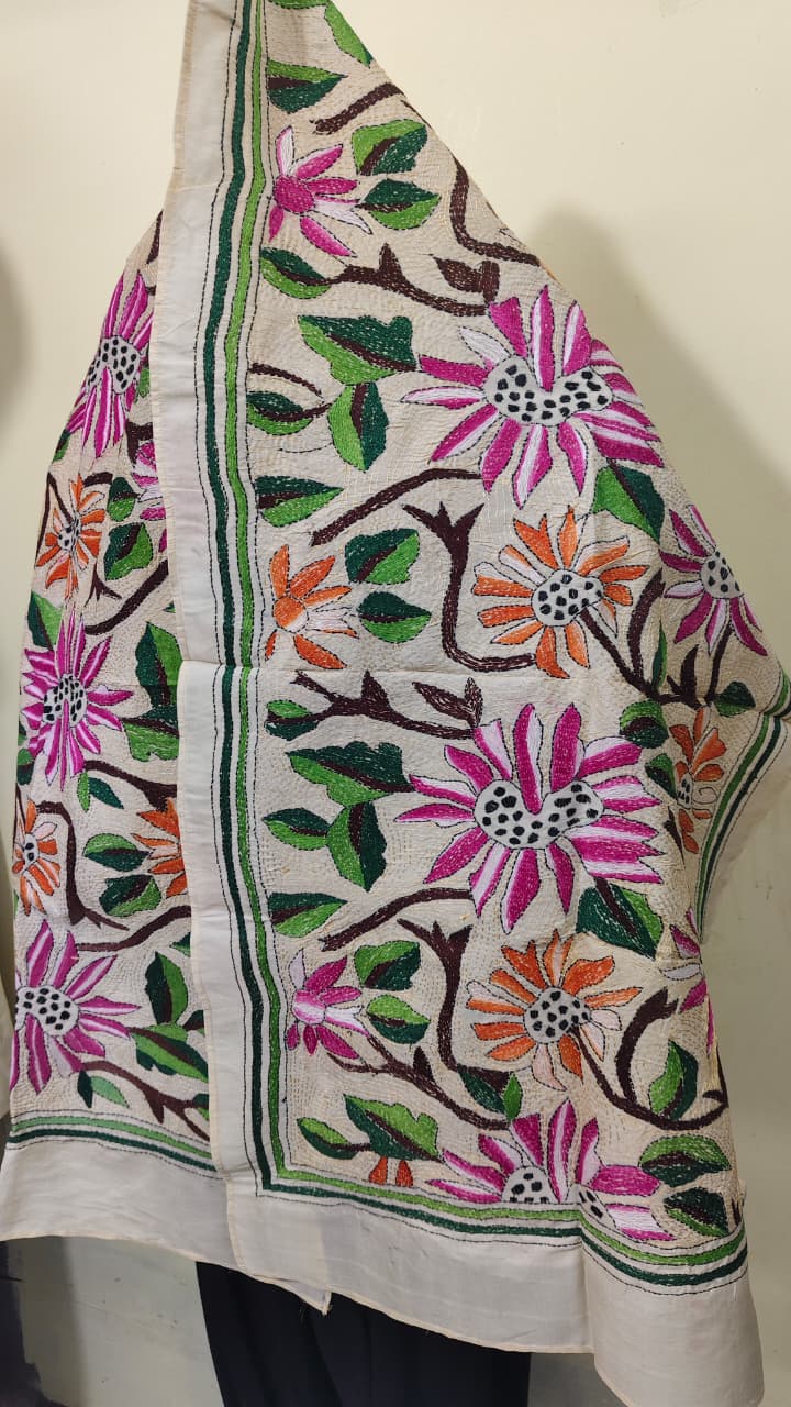 D Tussar Silk Kantha Stole – Off-White, Multicolor Floral