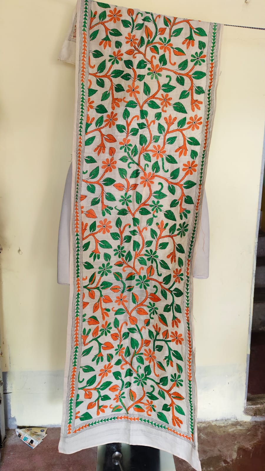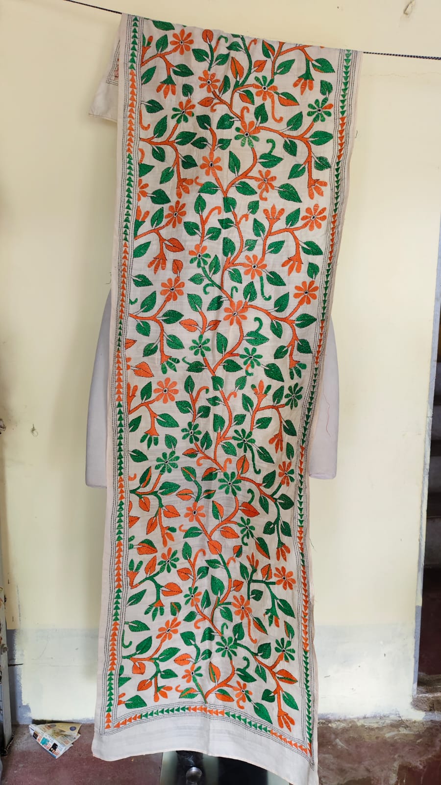 D Tussar Silk Kantha Stole β Off-White with Orange & Green Floral Vines