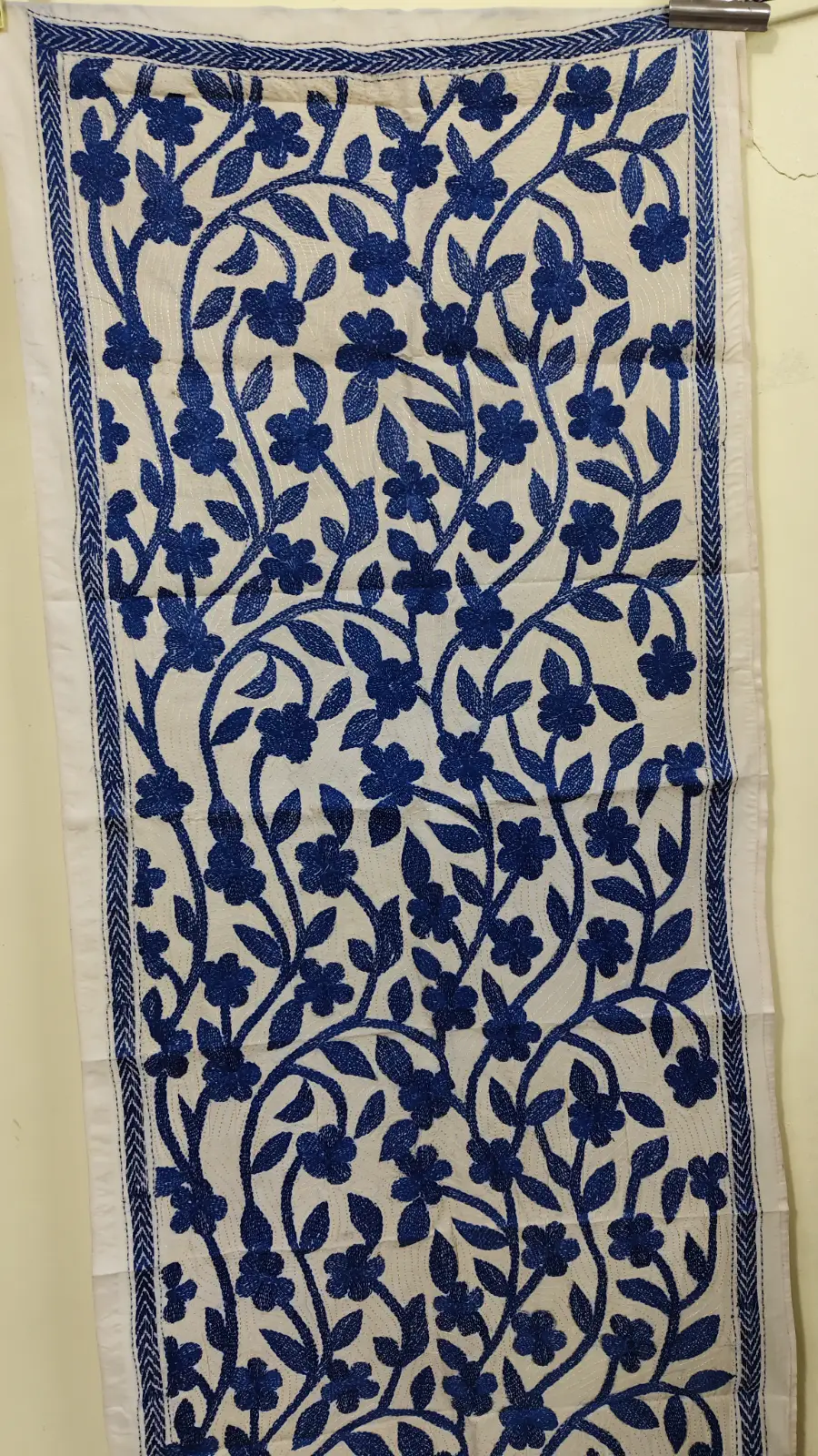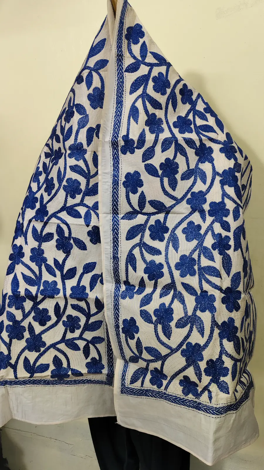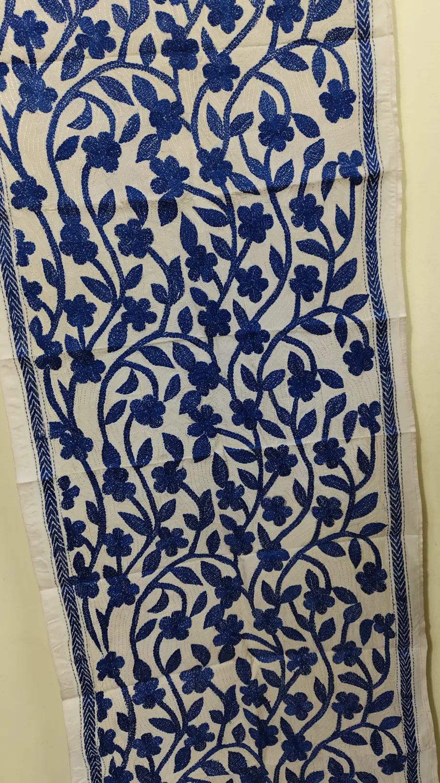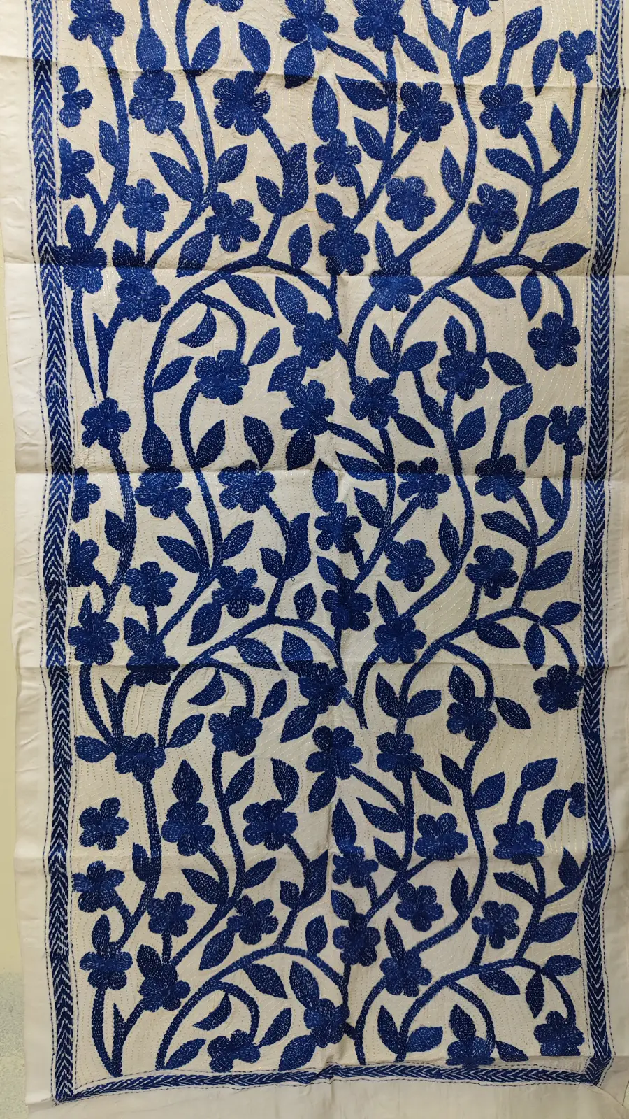 D Tussar Silk Kantha Stole – Off-White with Blue color Yarn Work