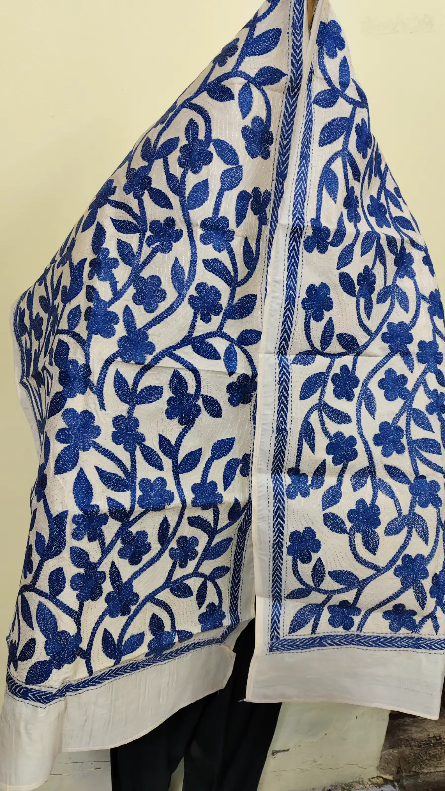 This is a premium soft de tussar silk stole, enriched with delicate hand kantha embroidery.