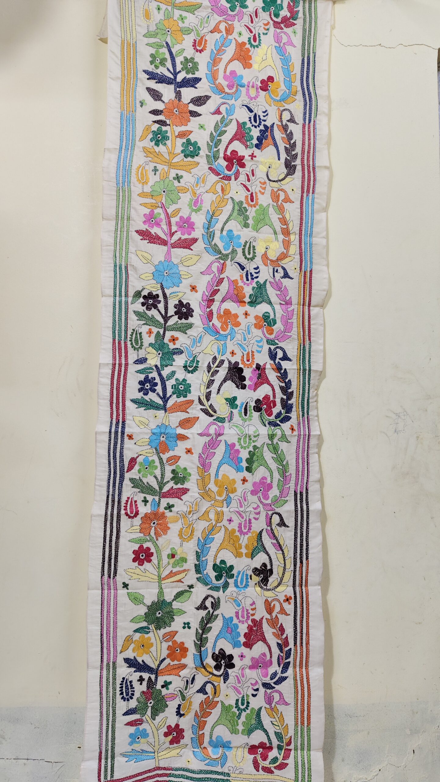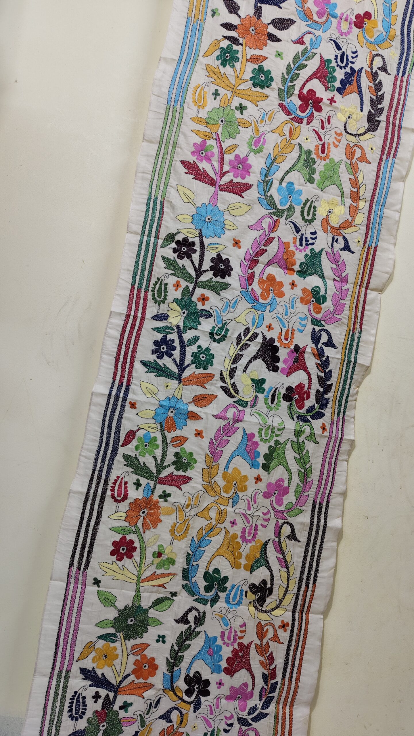 This elegant Tussar Silk Kantha Stole is crafted from premium quality silk and adorned with intricate hand-embroidered floral and vine motifs. The off-white base is beautifully enhanced with vibrant multicolor threadwork, creating a rich and lively traditional look.