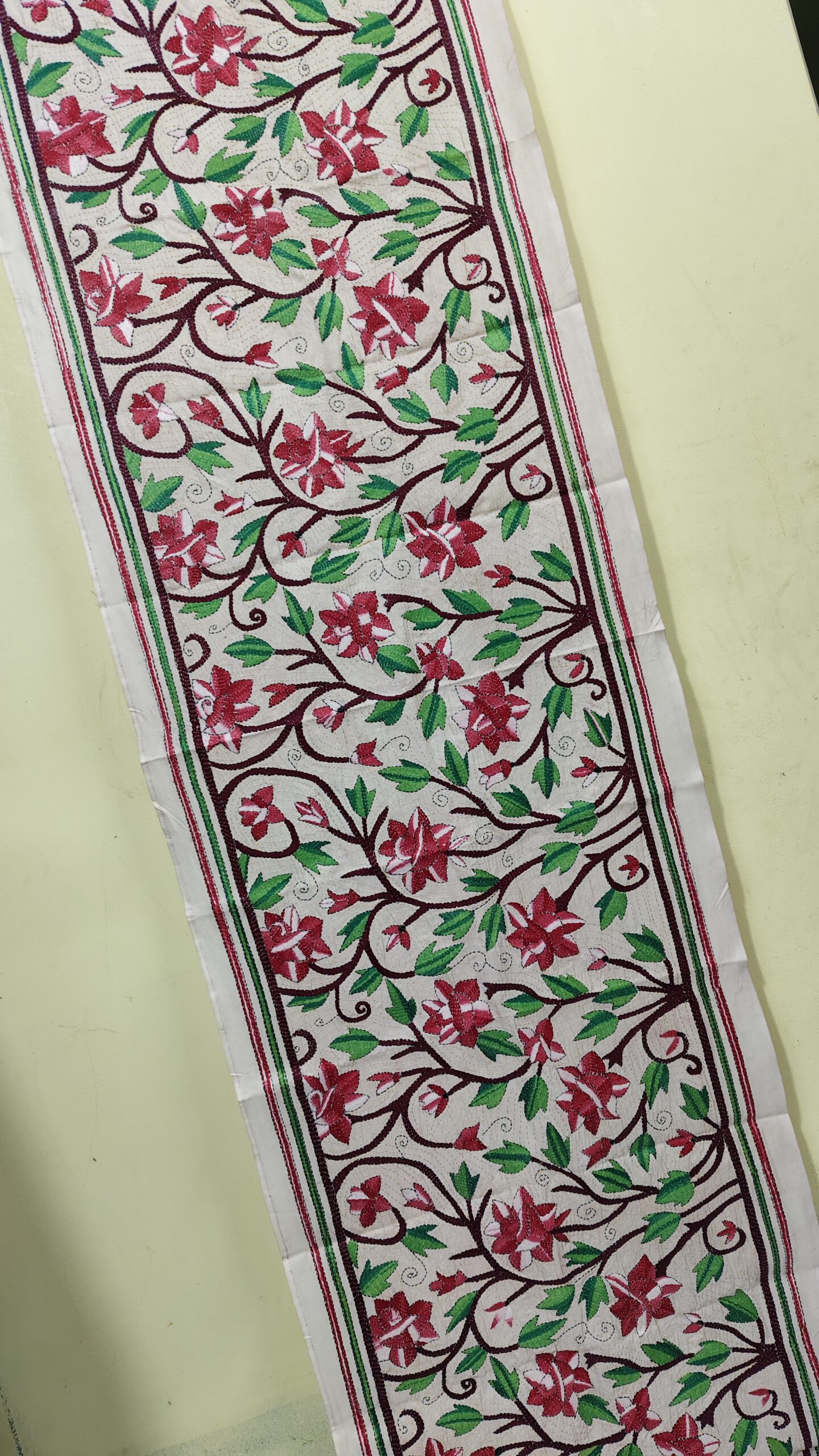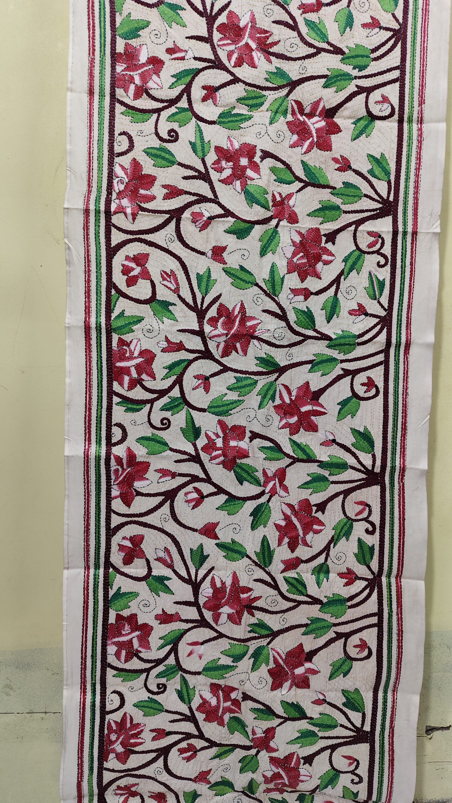 D Tussar Silk Kantha Stole with Red Floral Vine Embroidery