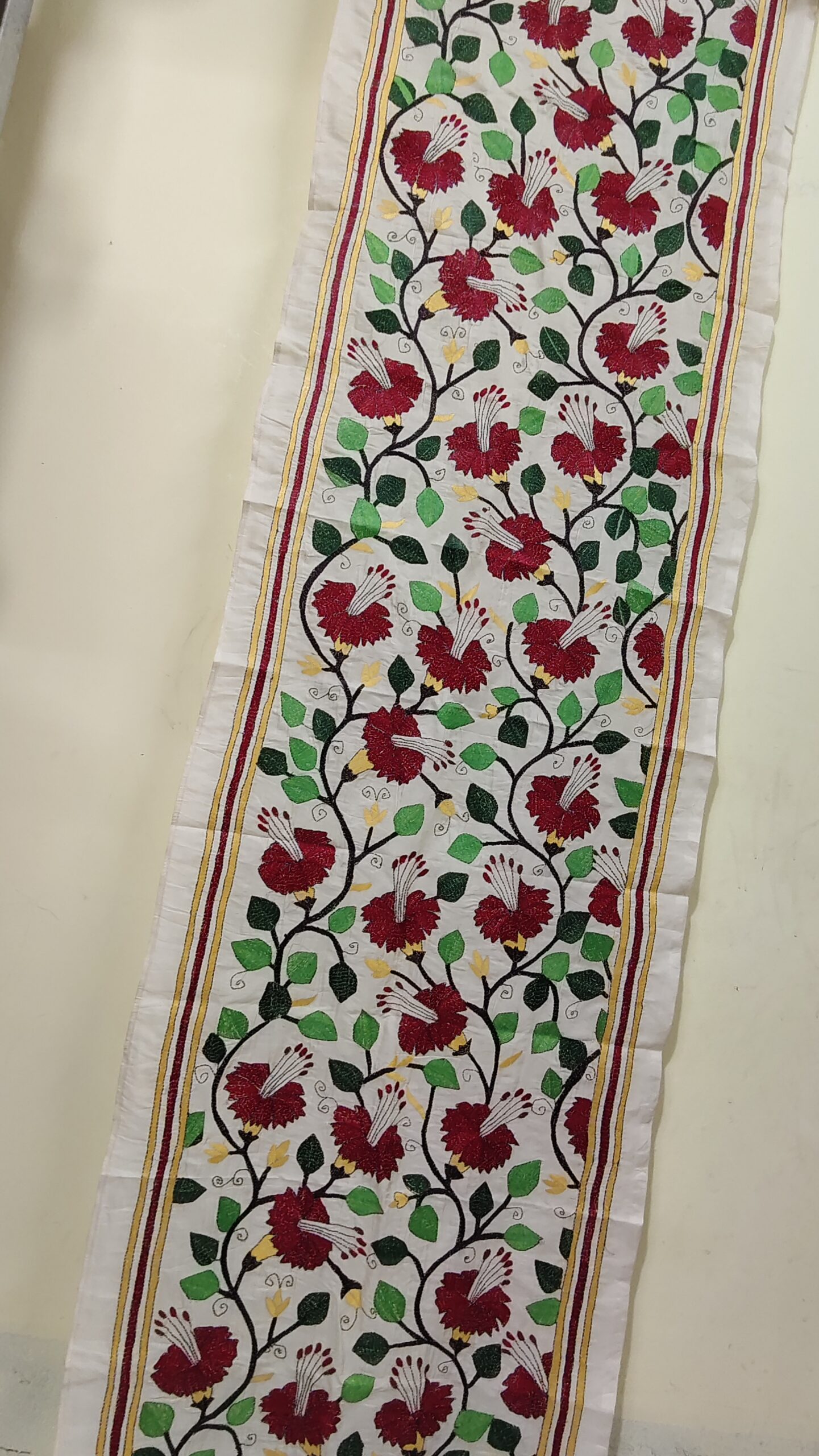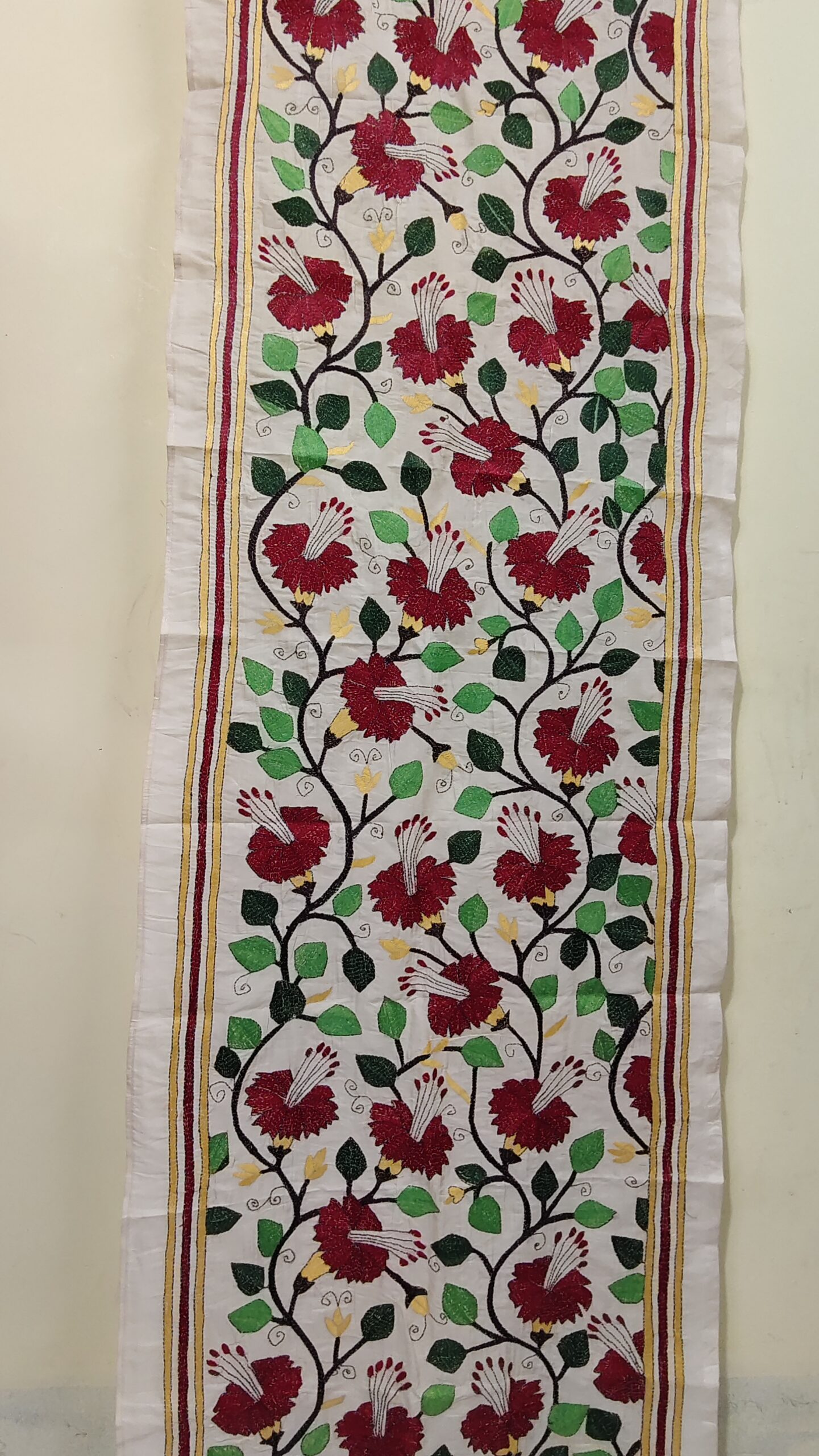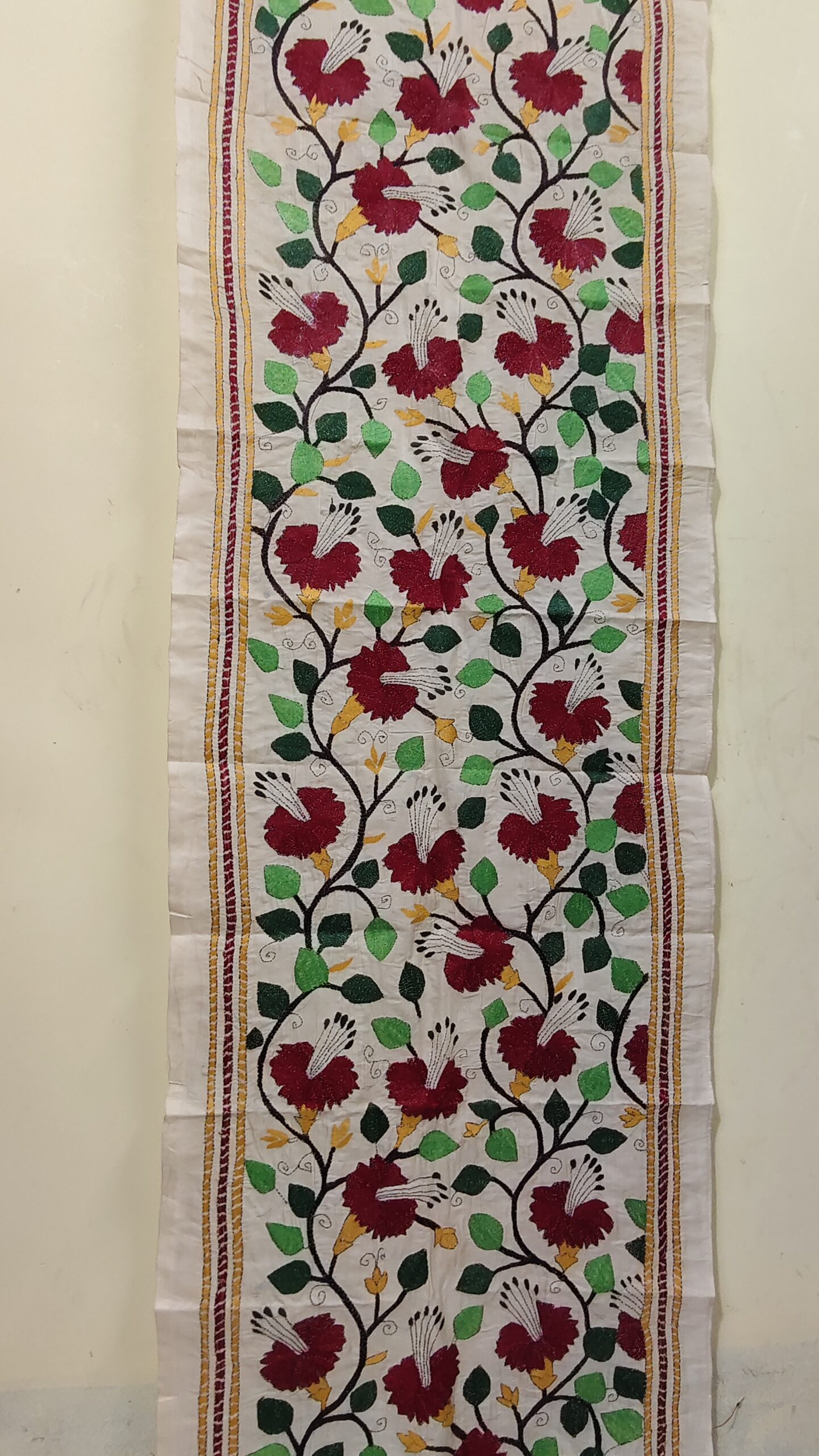 D Tussar Silk Kantha Stole with Red Green Floral Vine Embroidery