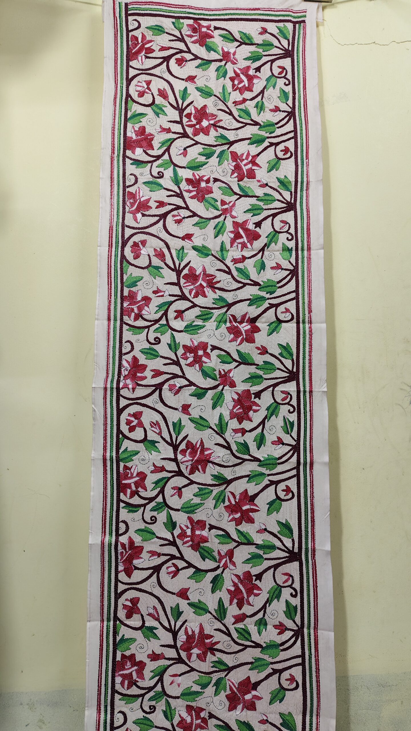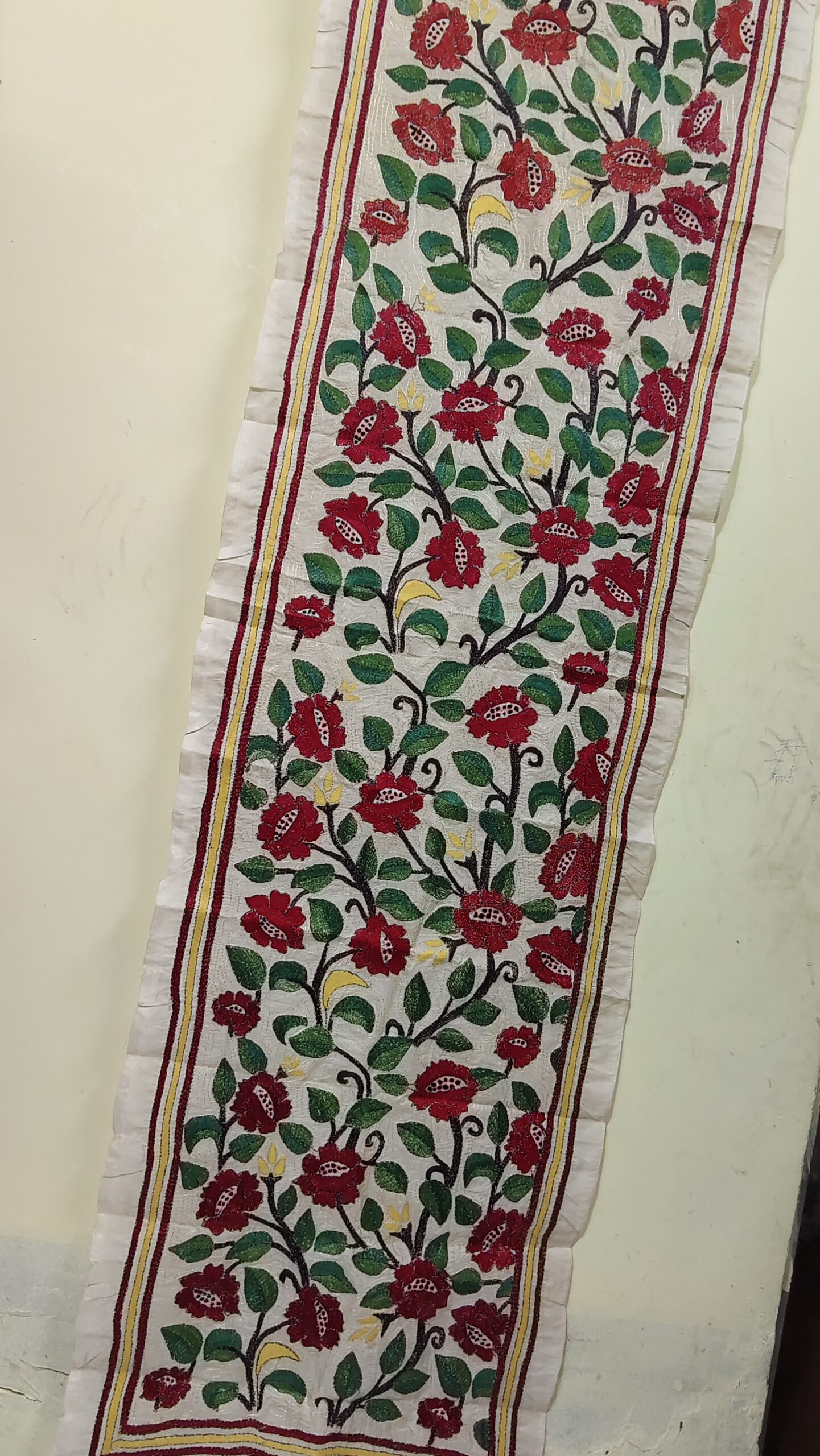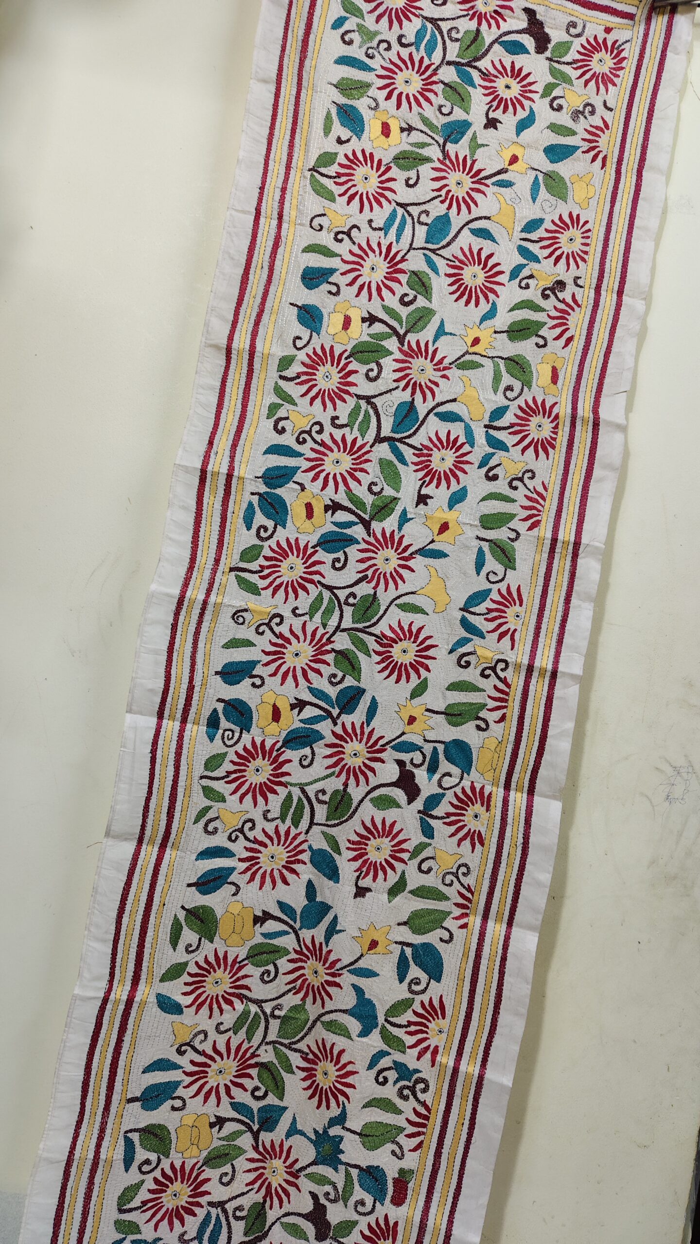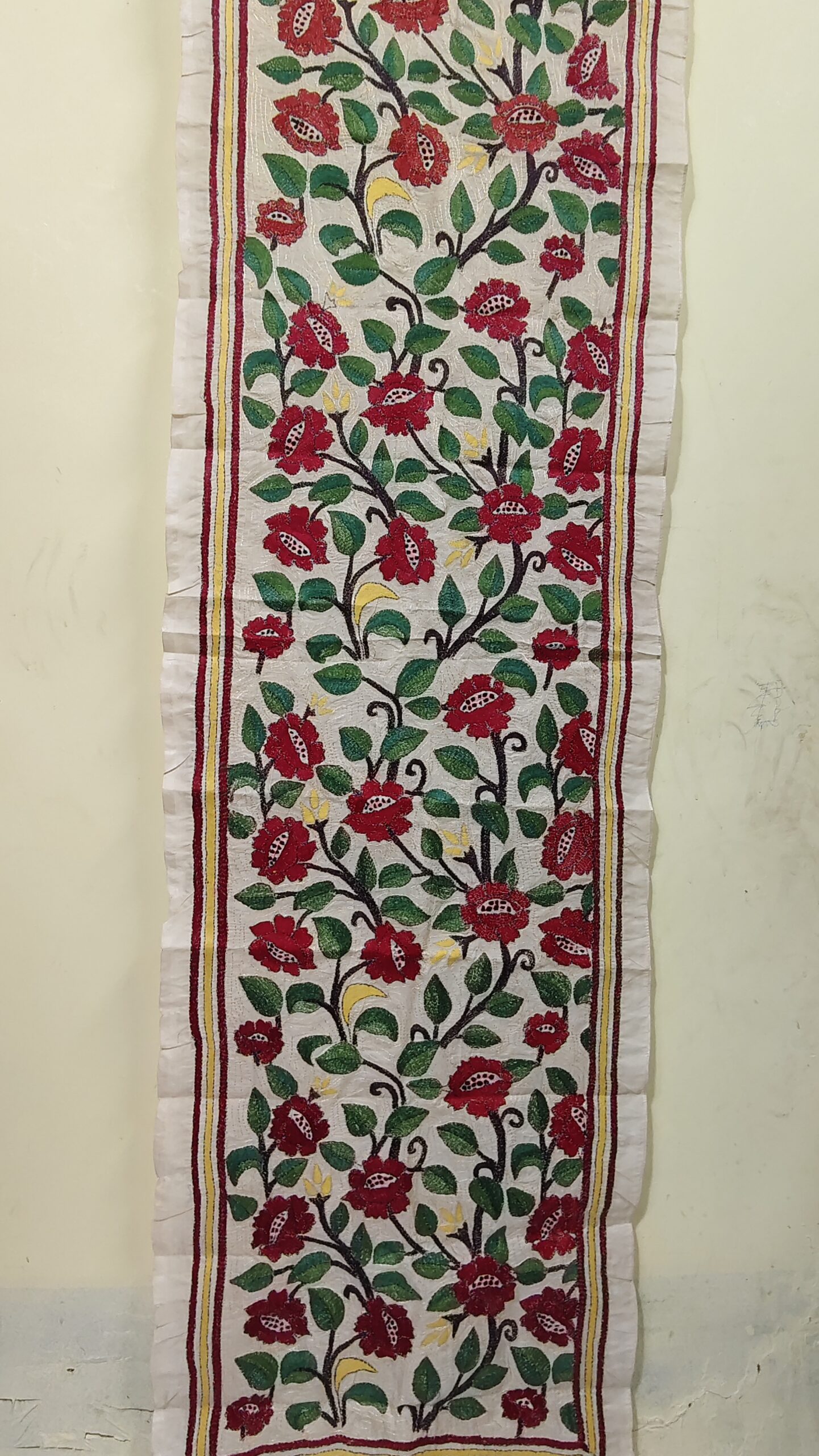 D Tussar Silk Kantha Stole with Red Green Floral Vine Embroidery