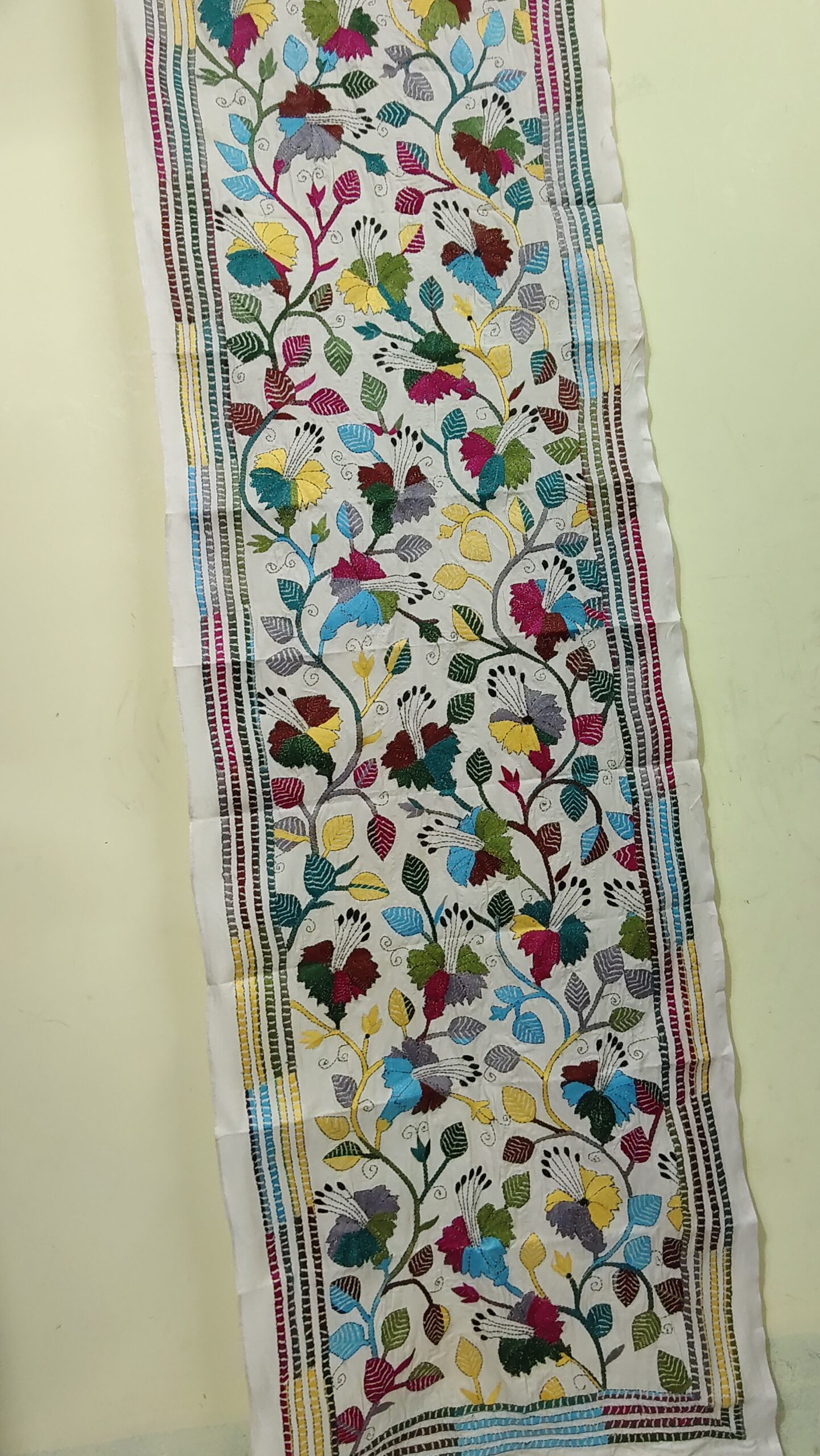 D Tussar Silk Multicolor Floral Kantha Stitch Stole β Elegant Ethnic Dupatta (Off-White Base)
