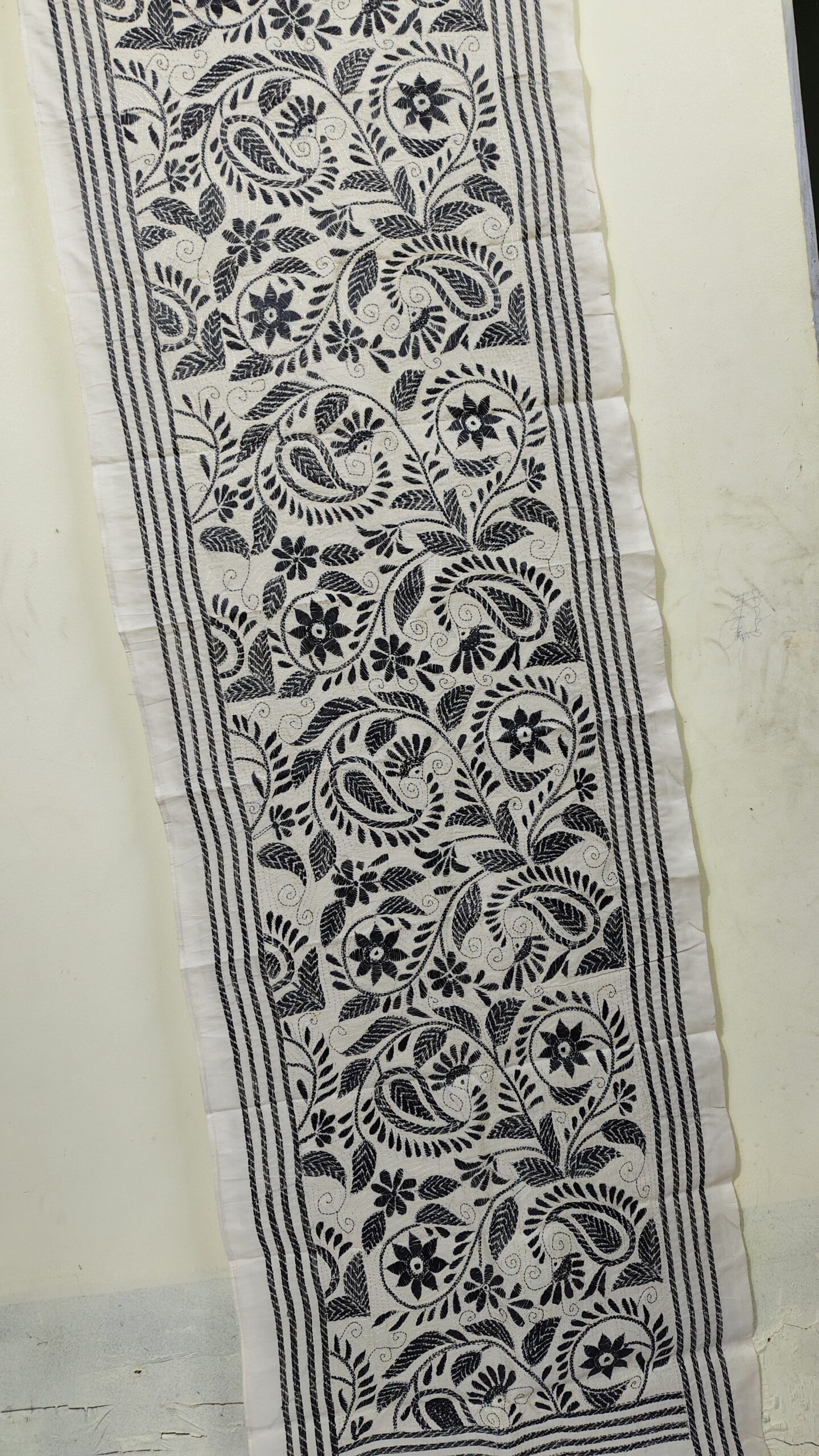Add a touch of elegance to your wardrobe with this premium Tussar silk Kantha stole, beautifully adorned with intricate multicolor floral embroidery. Crafted by skilled artisans, this stole showcases traditional Kantha stitch work on a rich off-white base, bringing together heritage craftsmanship and modern style.