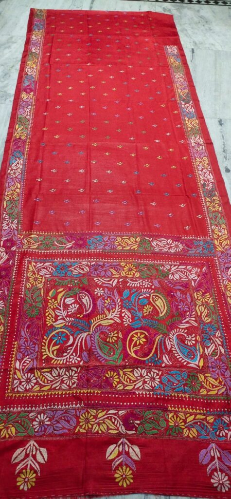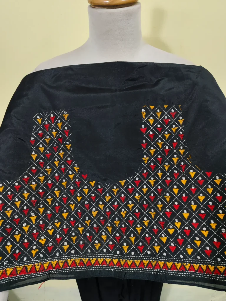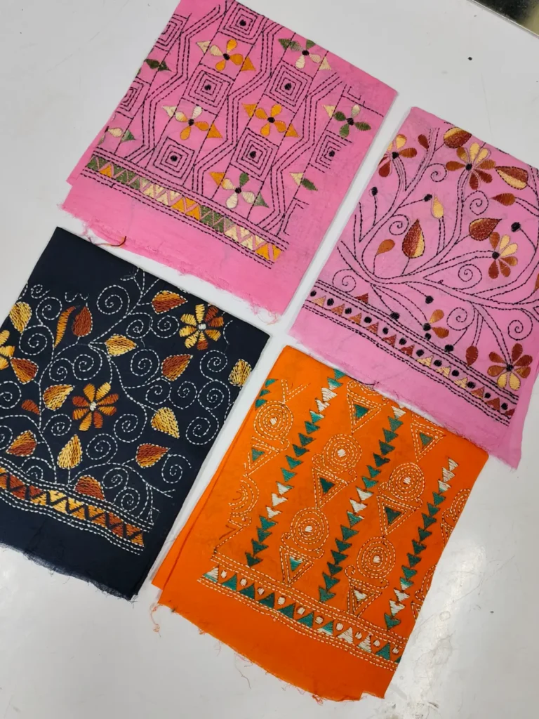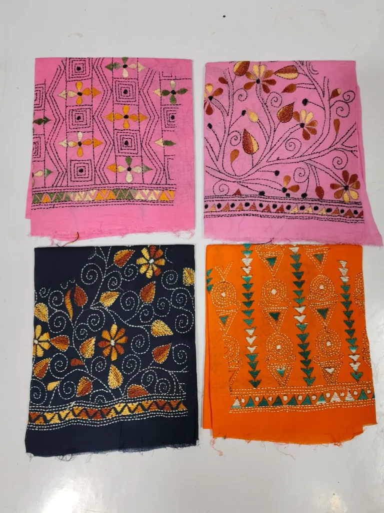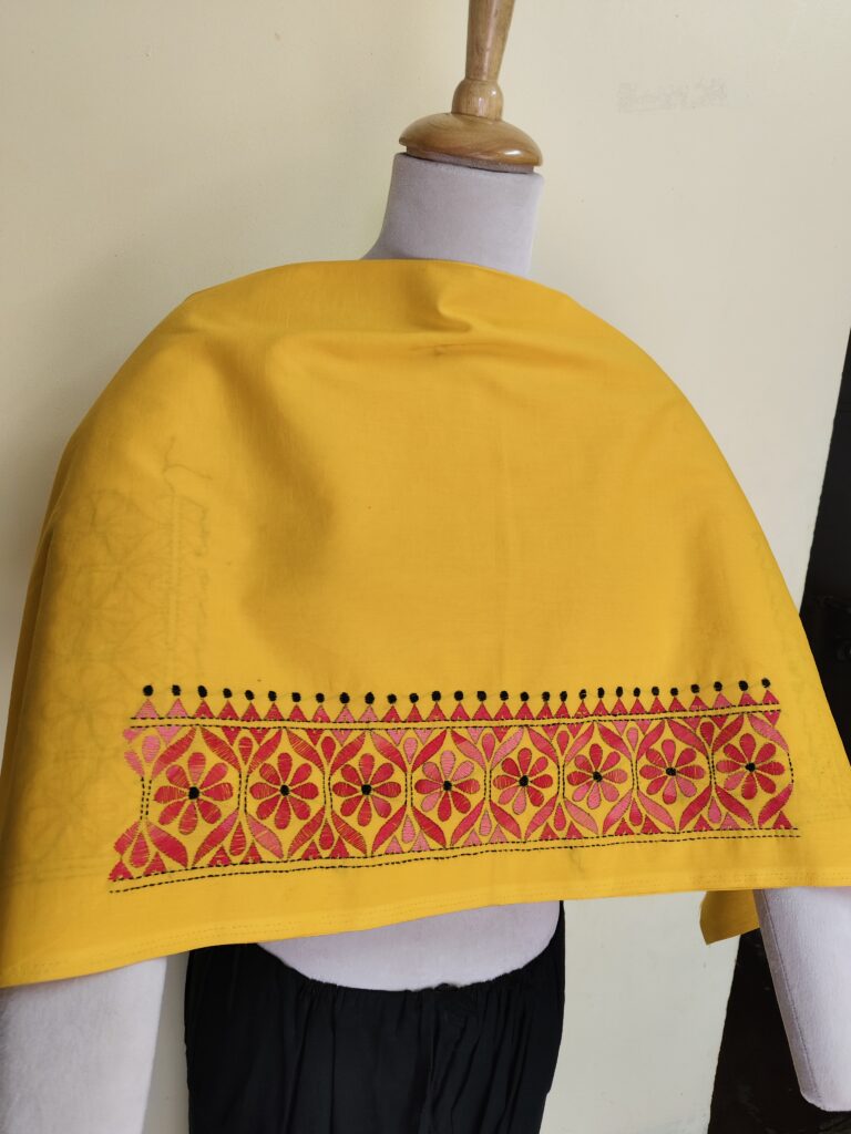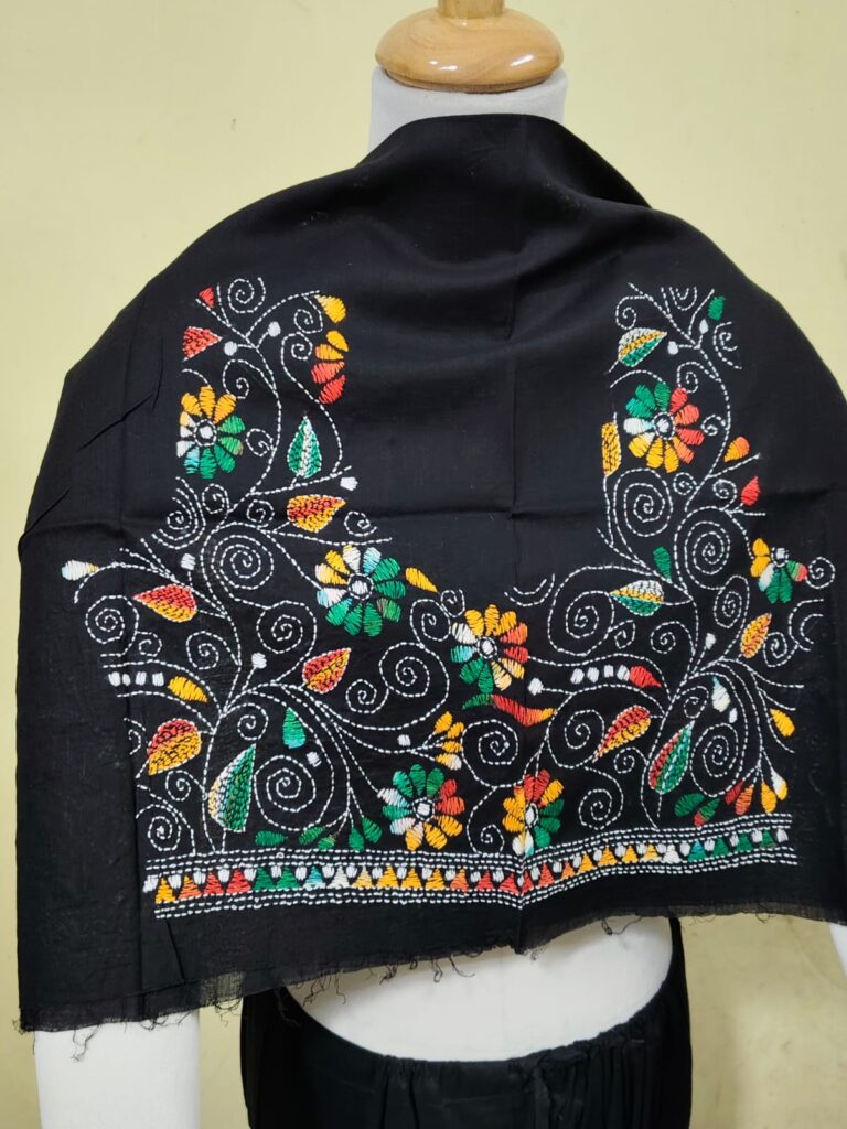 legant piece of hand-embroidered art, this Dark Cyan Silk Kantha Stitch Stole showcases intricate floral dot motifs in bright Black and Pink threads. The small circular pattern adds texture and richness to the vibrant silk fabric, while the corner floral bootas give it a regal finish. A versatile accessory for both festive and formal occasions.