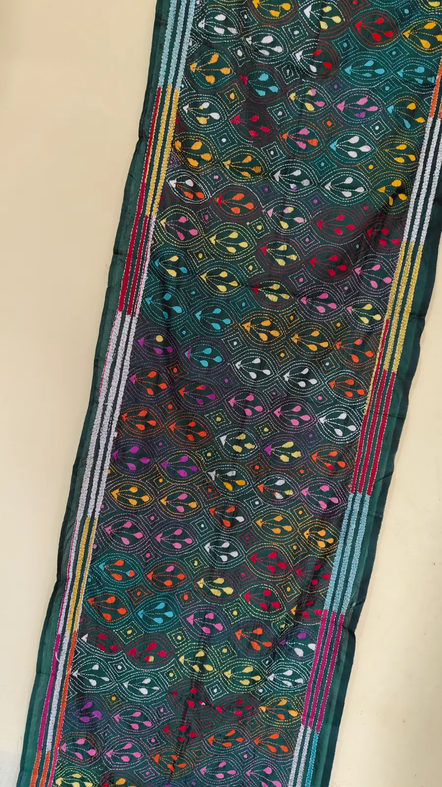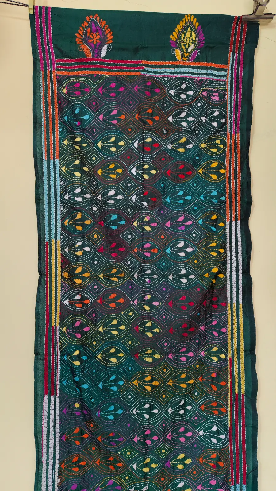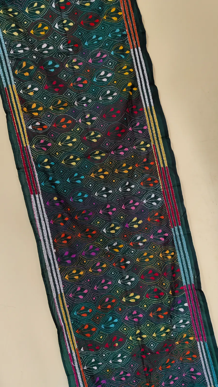 Made from soft and smooth silk, this elegant stole showcases detailed hand-done Kantha stitch work across the entire fabric. The rich dark green base is beautifully enhanced with vibrant multicolor floral and eye-shaped motifs, creating a lively yet graceful look. Fine geometric Kantha patterns in the background add depth and texture, while the contrasting striped borders complete the design with a refined finish. Lightweight and comfortable, it is perfect for festive gatherings, cultural events, or statement everyday styling. Each piece is handcrafted by skilled artisans, making every stole unique in its stitch pattern and color placement.