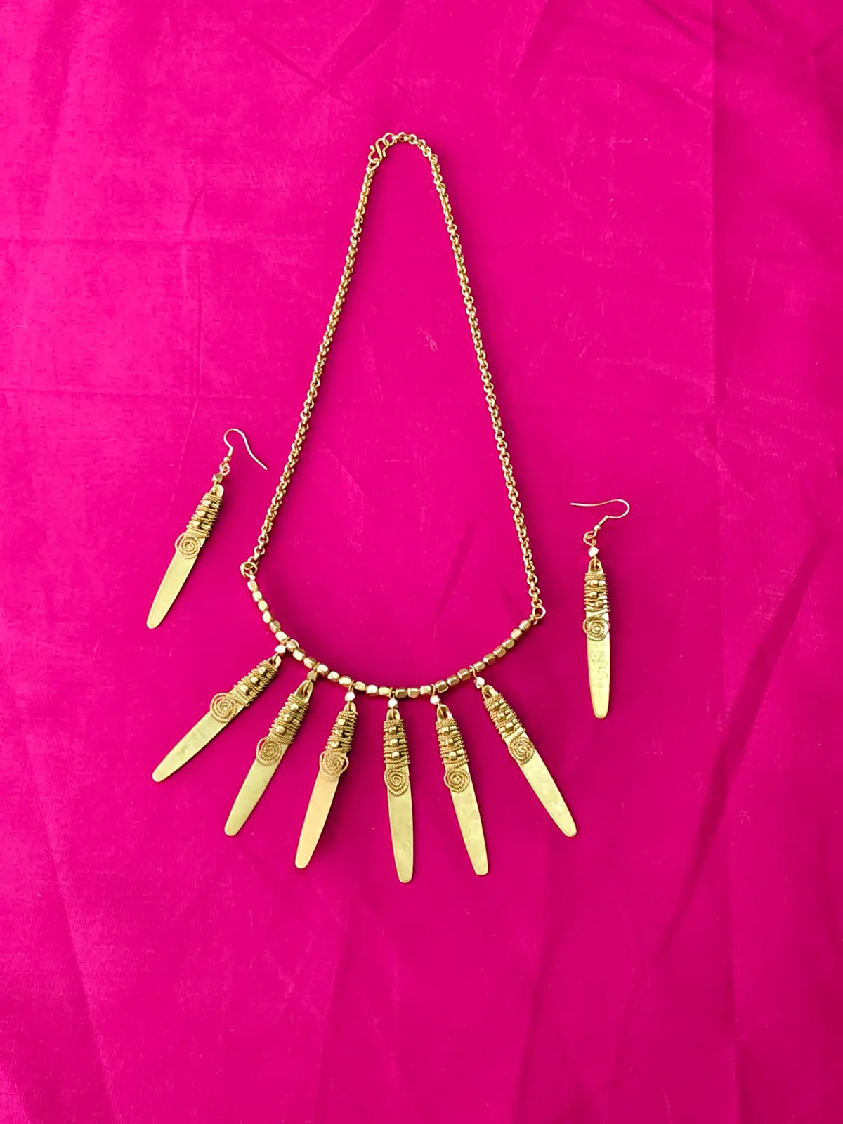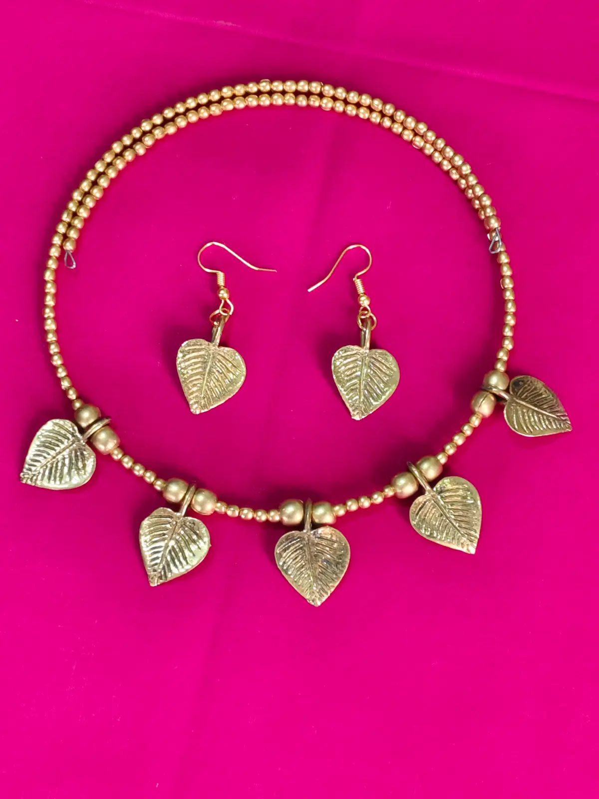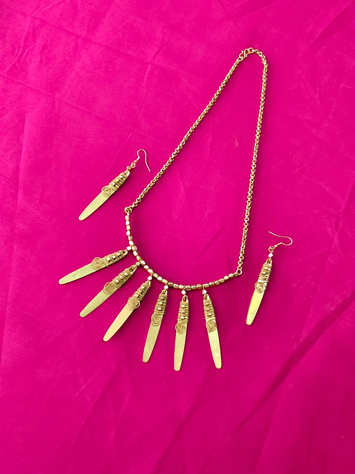 A stunning necklace set with handmade brass tribal ball pendants inspired by traditional Dokra art. Paired with matching earrings, this set brings an elegant touch of ethnic beauty to any outfit. Made using the ancient lost wax casting method, which showcases intricate textures and fine craftsmanship.
