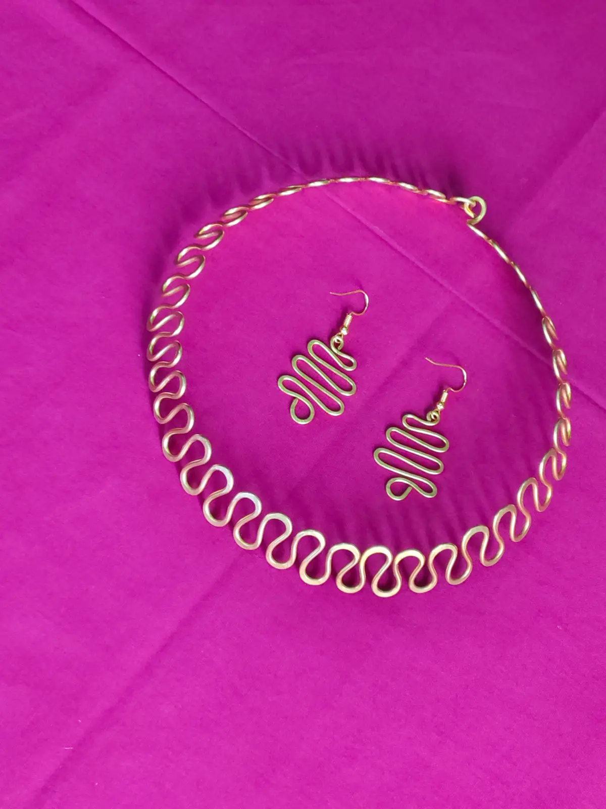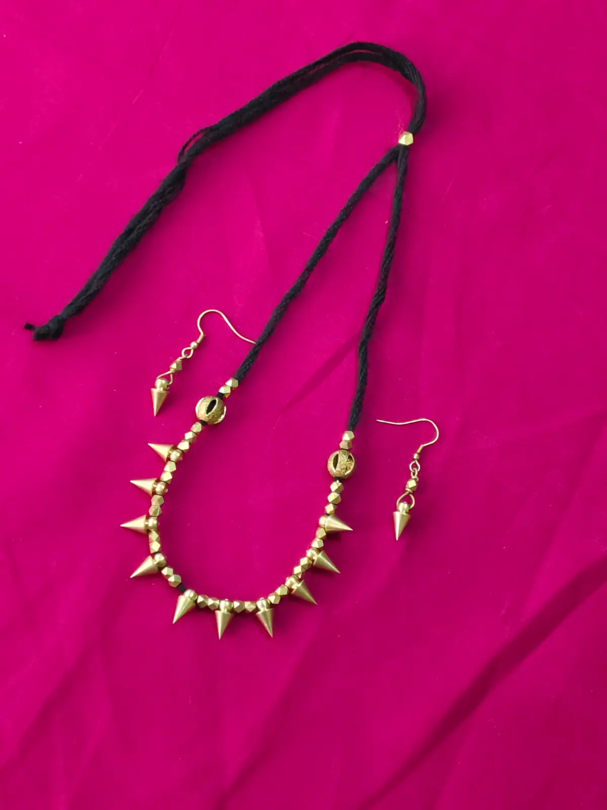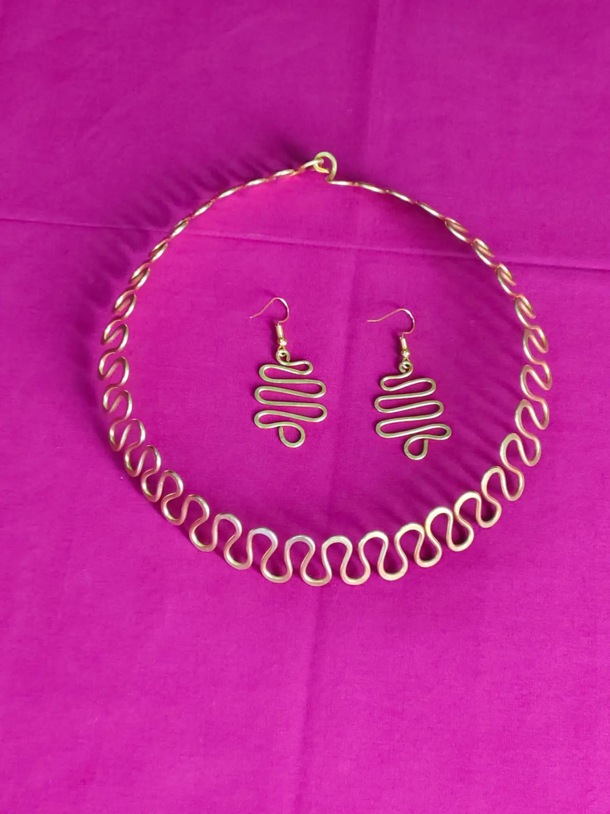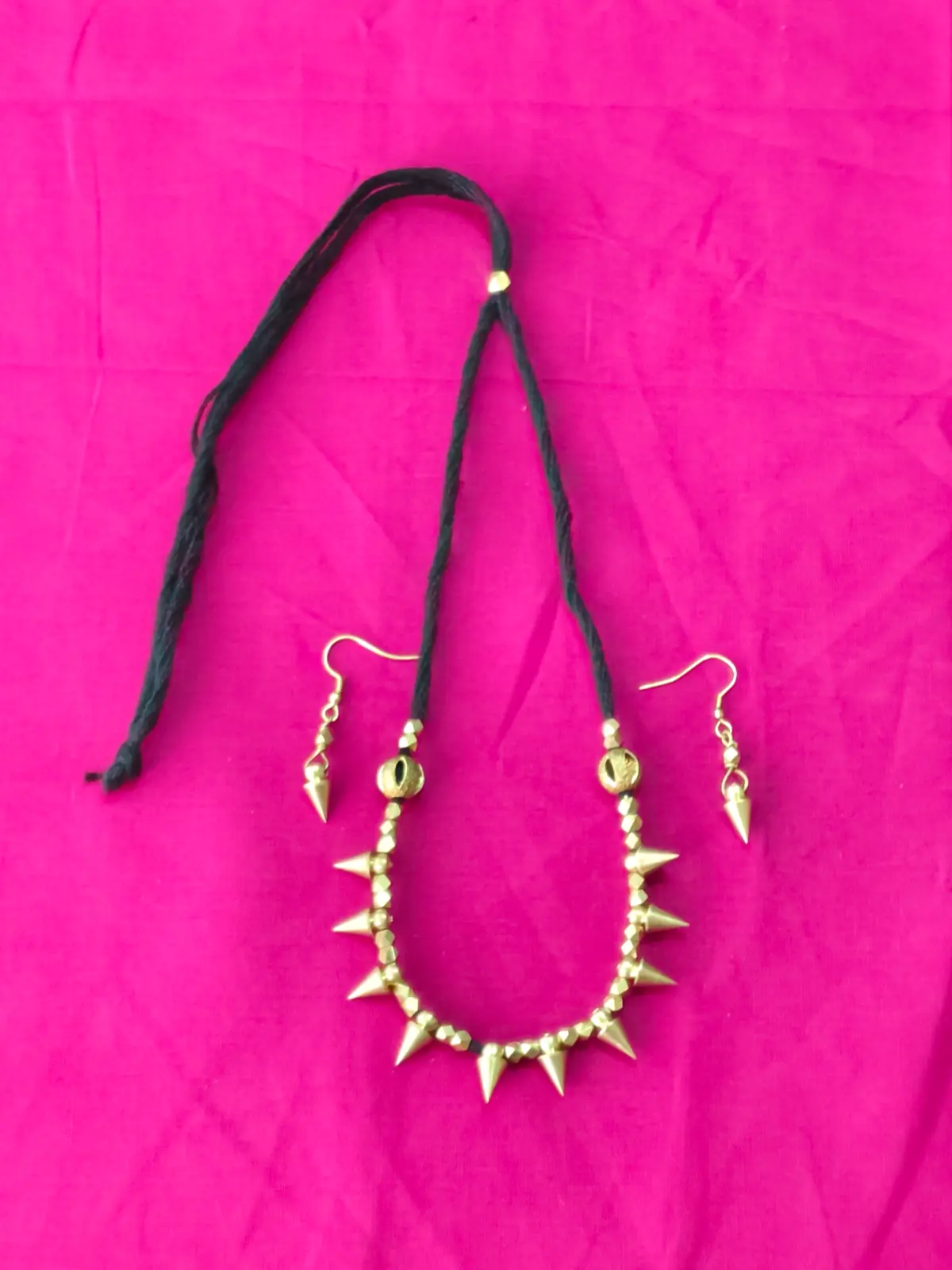 A stunning necklace set with handmade brass tribal ball pendants inspired by traditional Dokra art. Paired with matching earrings, this set brings an elegant touch of ethnic beauty to any outfit. Made using the ancient lost wax casting method, which showcases intricate textures and fine craftsmanship.