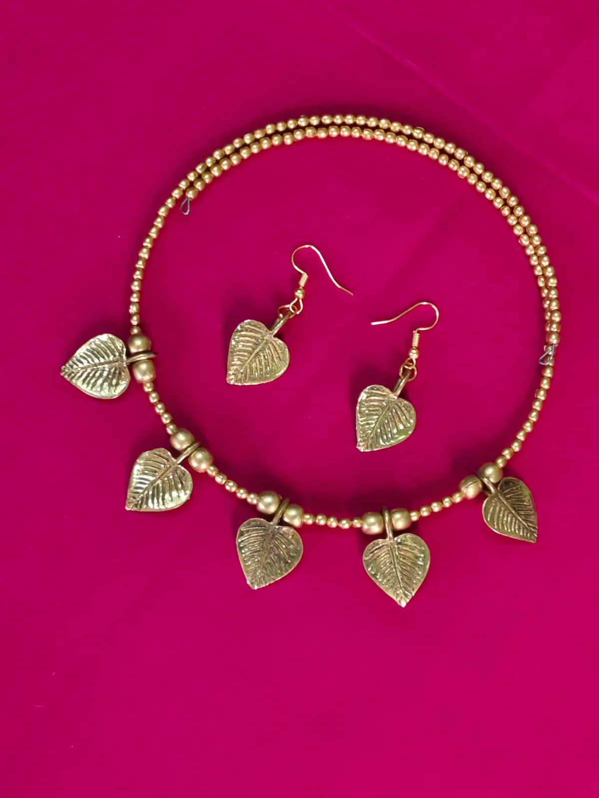 A stunning necklace set featuring handcrafted brass leaf pendants inspired by traditional dokra artistry. Paired with matching earrings, this set brings an elegant touch of ethnic beauty to any ensemble. Each leaf motif is made using the ancient lost-wax casting method, showcasing intricate textures and fine workmanship.