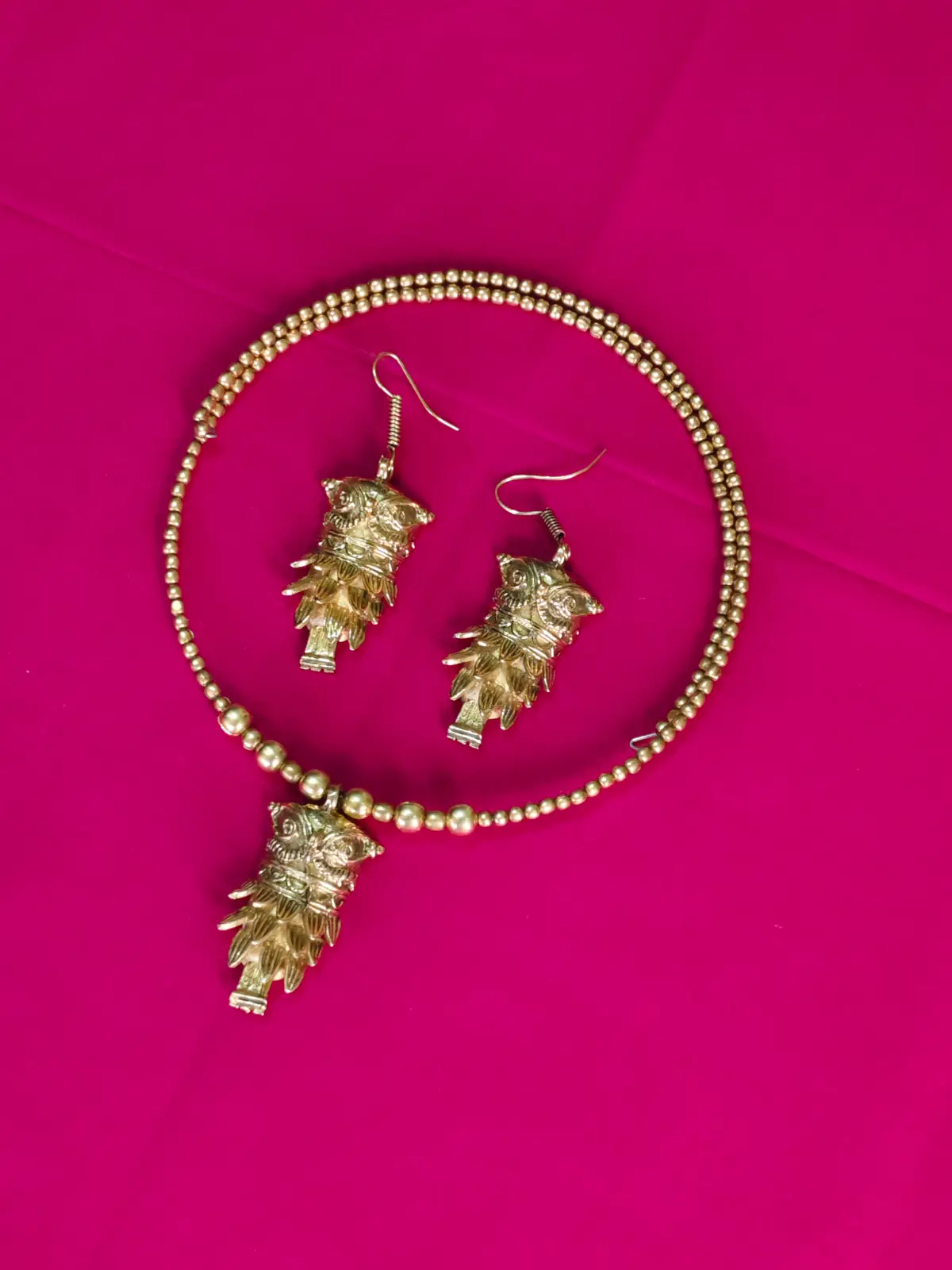 A stunning necklace set featuring a handcrafted brass tribal owl motif pendant inspired by traditional Dokra art. Paired with matching earrings, this set brings an elegant touch of ethnic beauty to any outfit. Each leaf motif is crafted using the ancient lost wax casting method, showcasing intricate textures and exquisite craftsmanship.