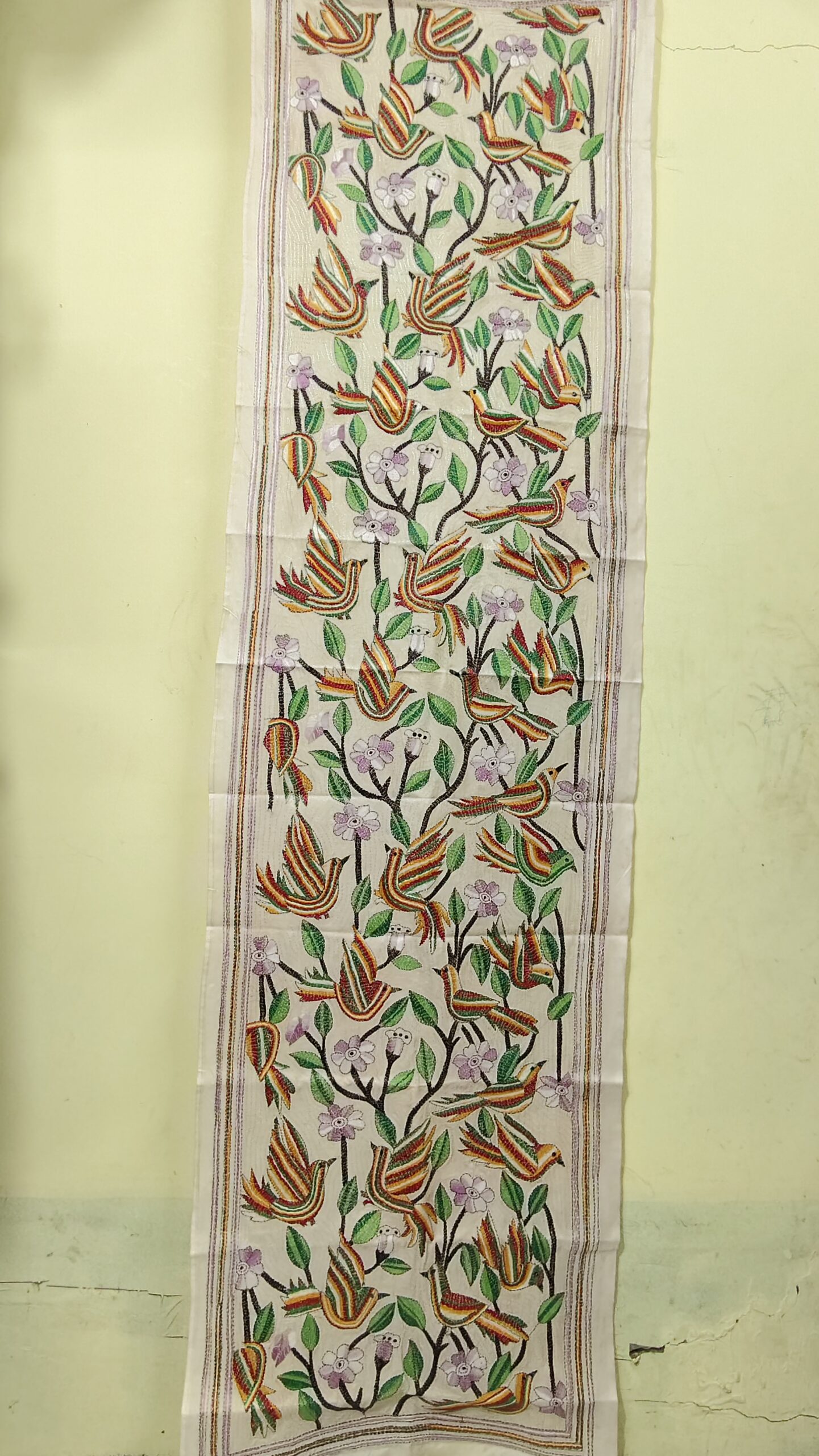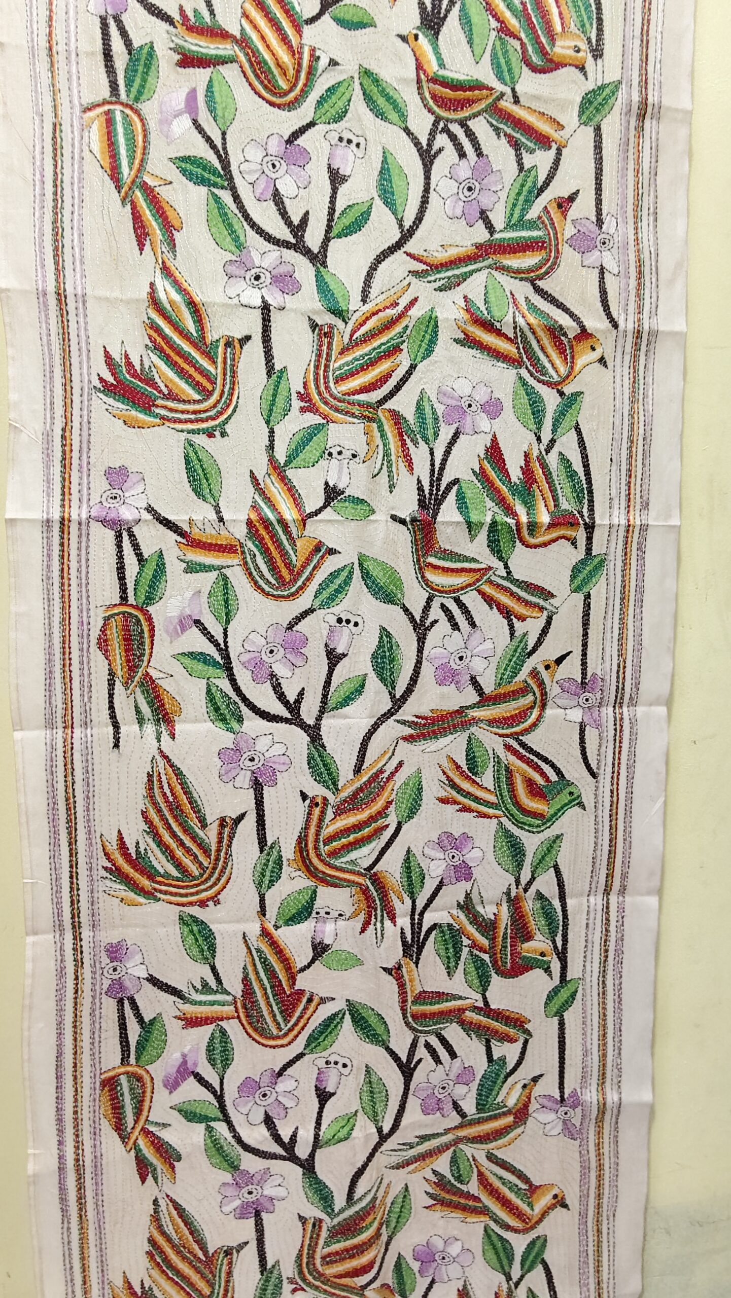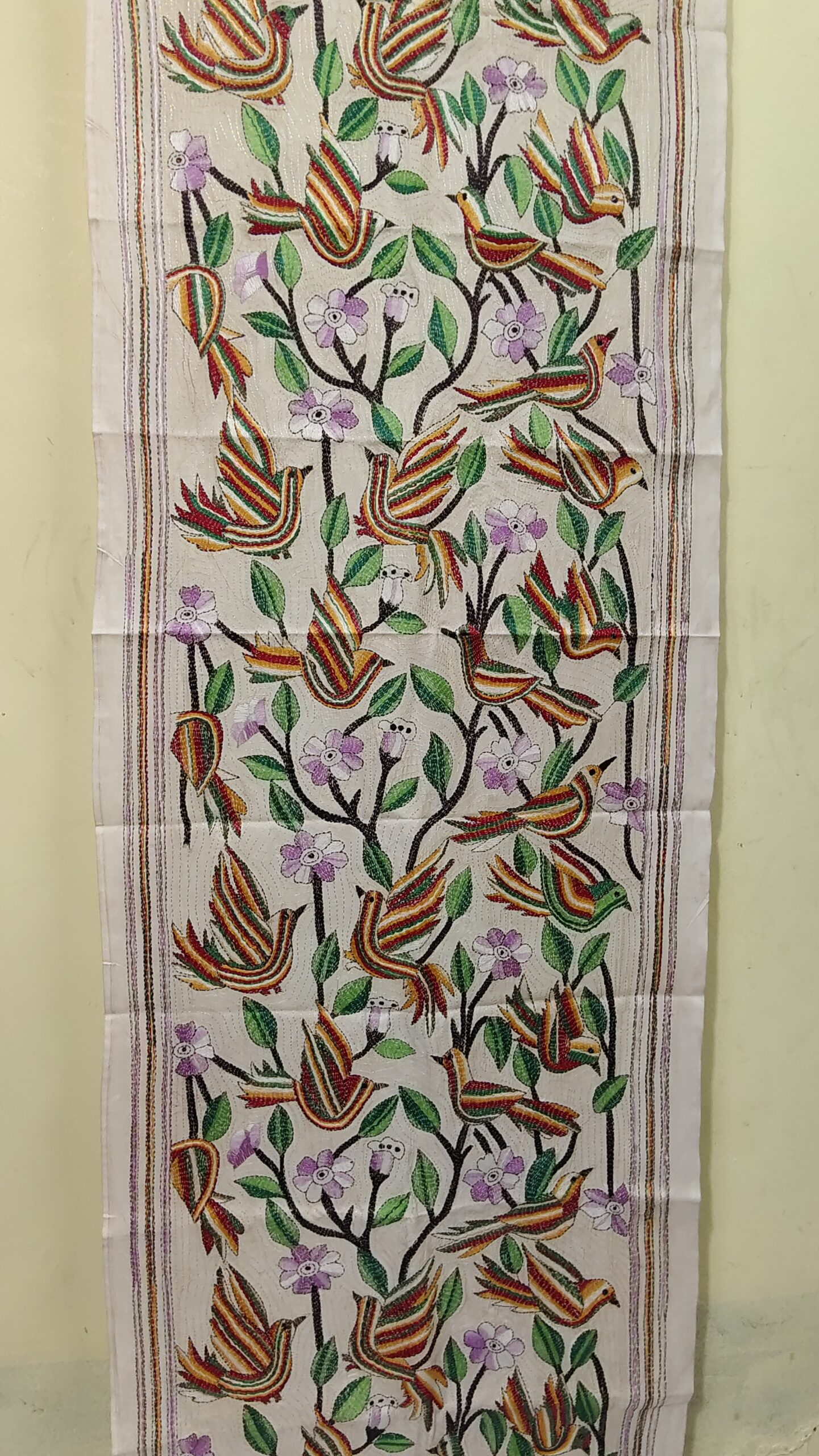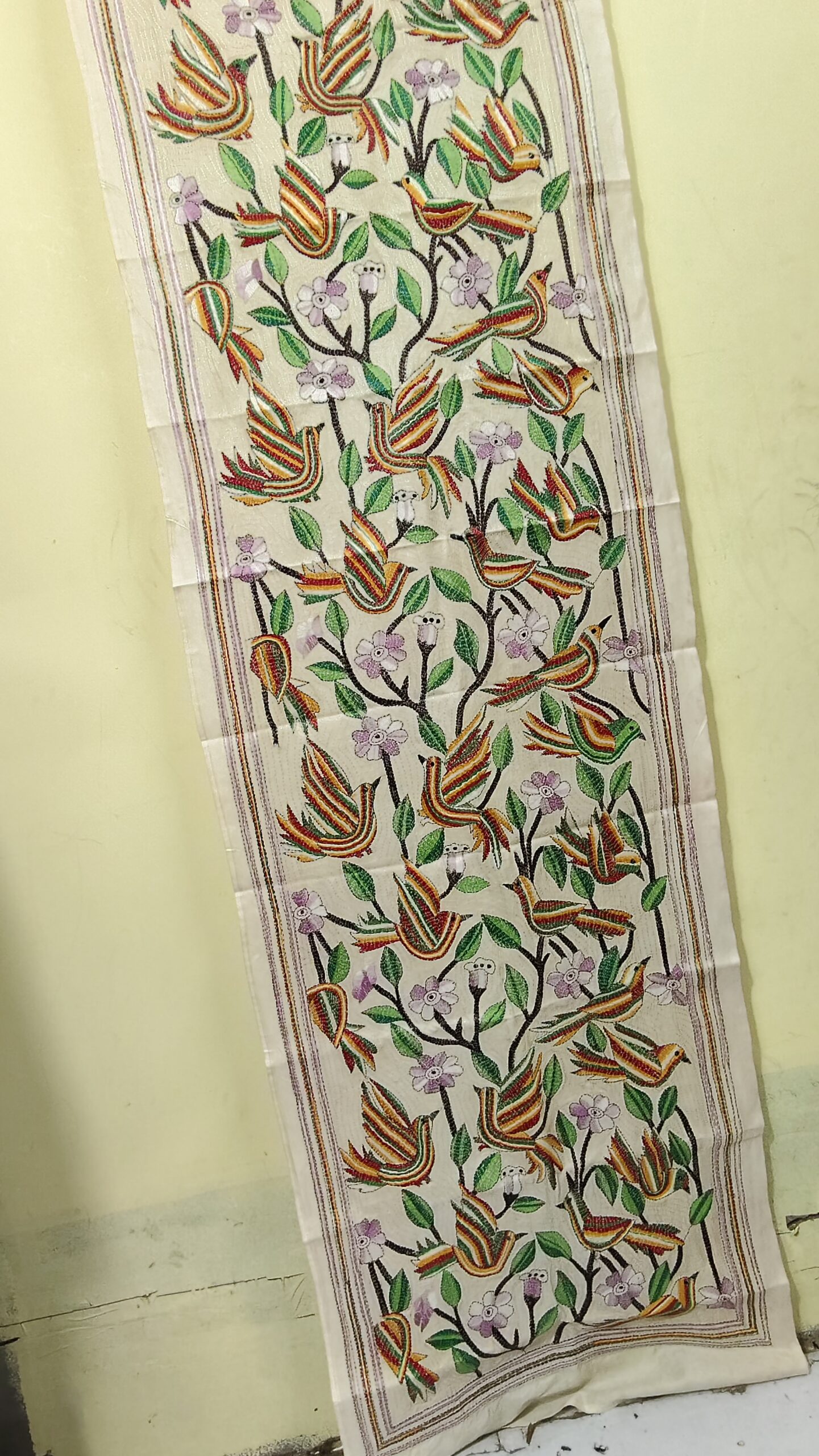 This graceful stole is crafted from fine Tussar silk and enhanced with intricate hand-done Kantha stitching, reflecting timeless artisanal beauty. The design features vibrant multicolor bird motifs perched among delicate floral vines, highlighted in shades of red, yellow, green, and soft lavender on an elegant off-white base. Finished with subtle woven borders, it adds a refined and lively charm to the piece. Lightweight and breathable, this stole is perfect for both everyday elegance and festive wear. Each piece is uniquely handcrafted, making it truly one-of-a-kind. Gentle hand-wash recommended; dry in shade and iron on reverse to preserve its intricate detailing.