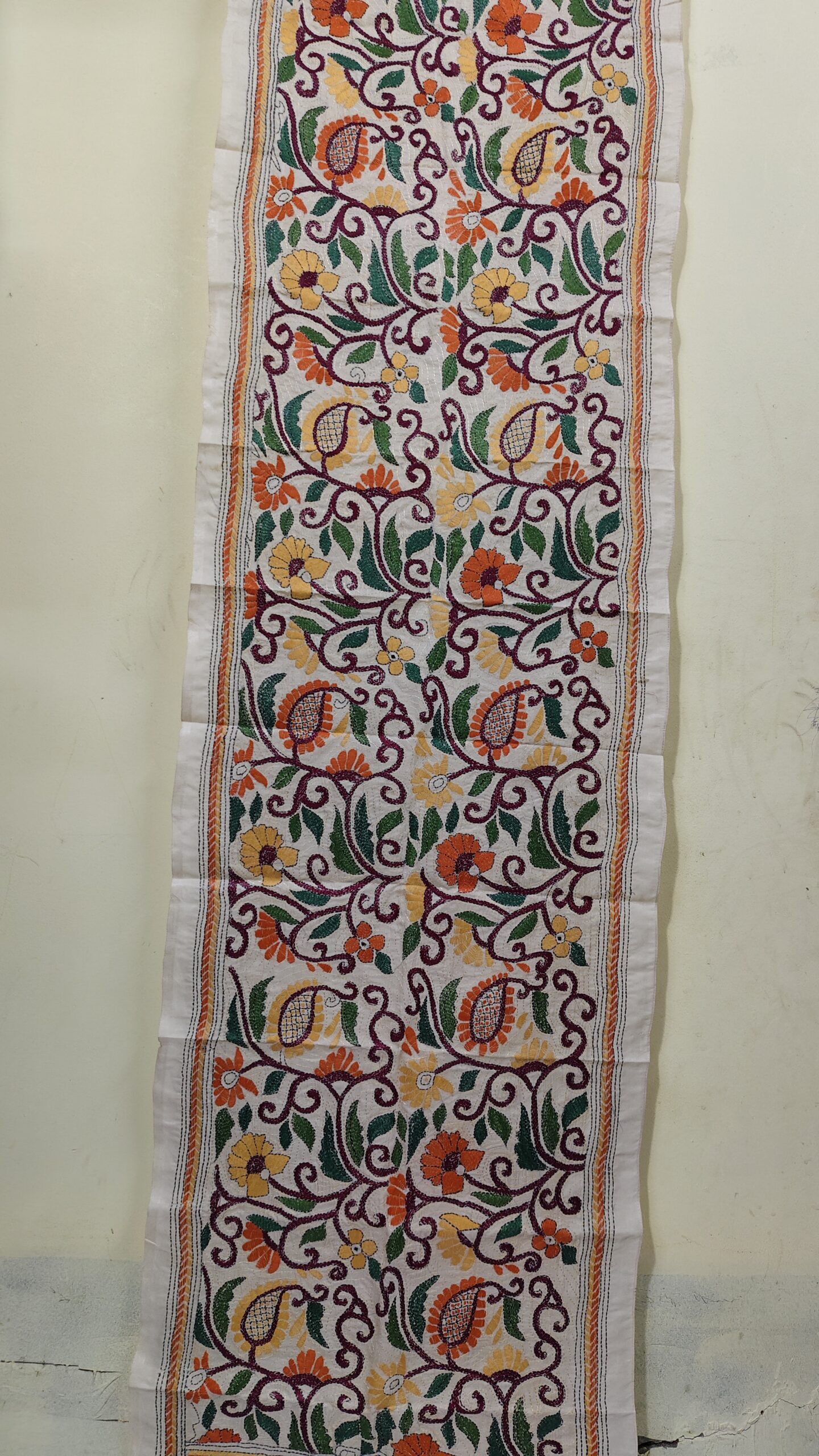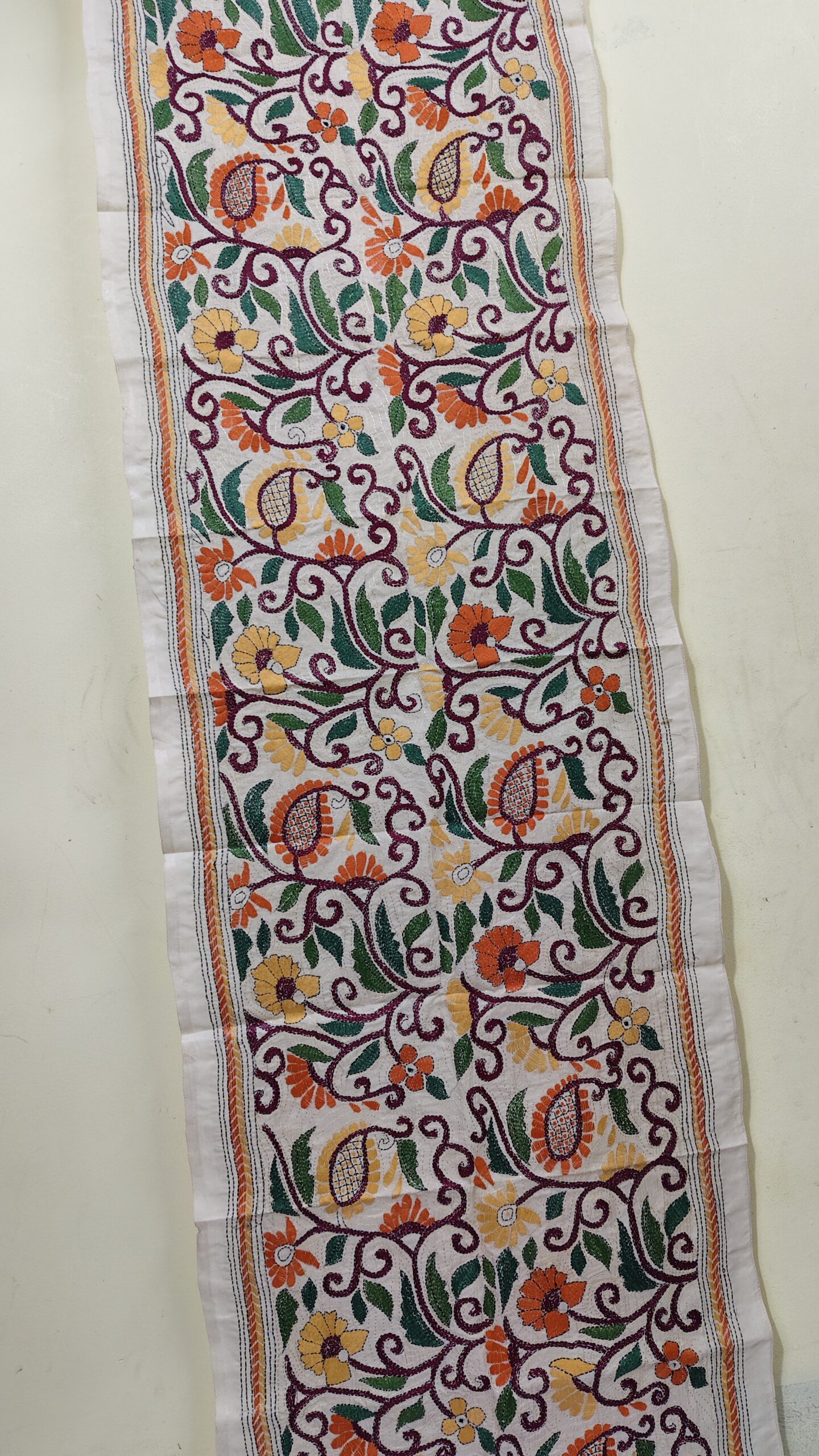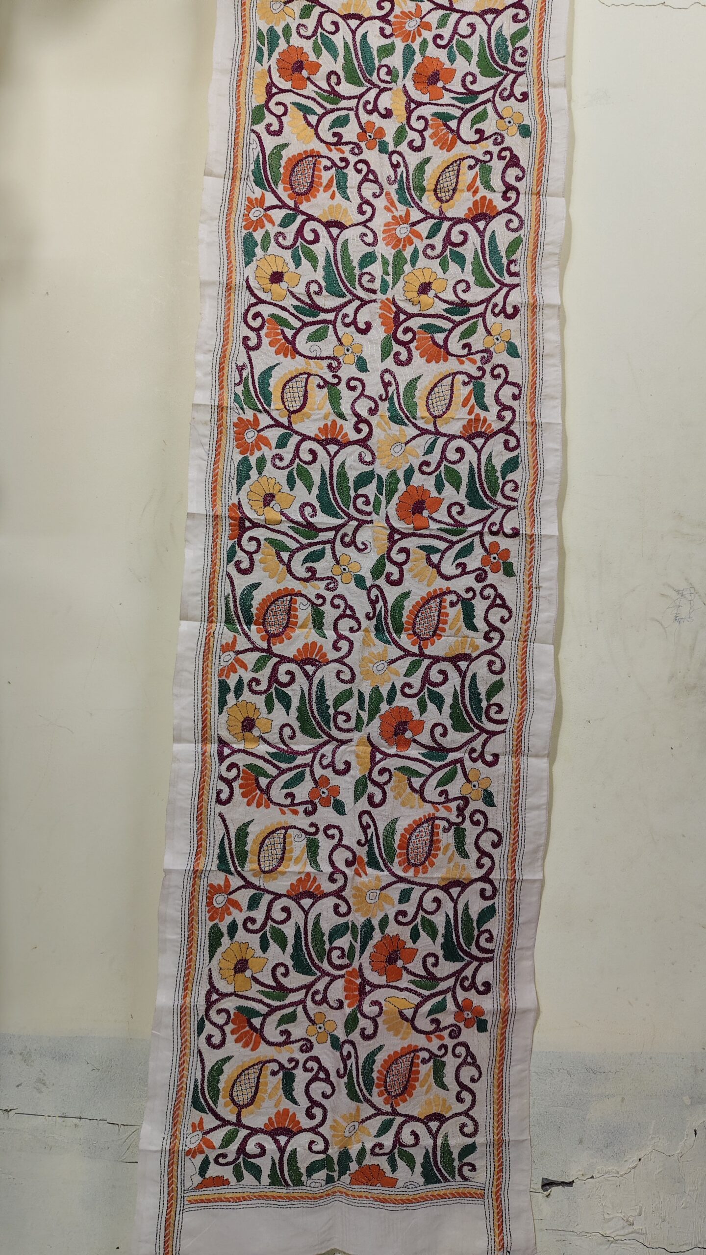 Elegant Tussar Silk Kantha Stitch Stole with Floral Vine Embroidery