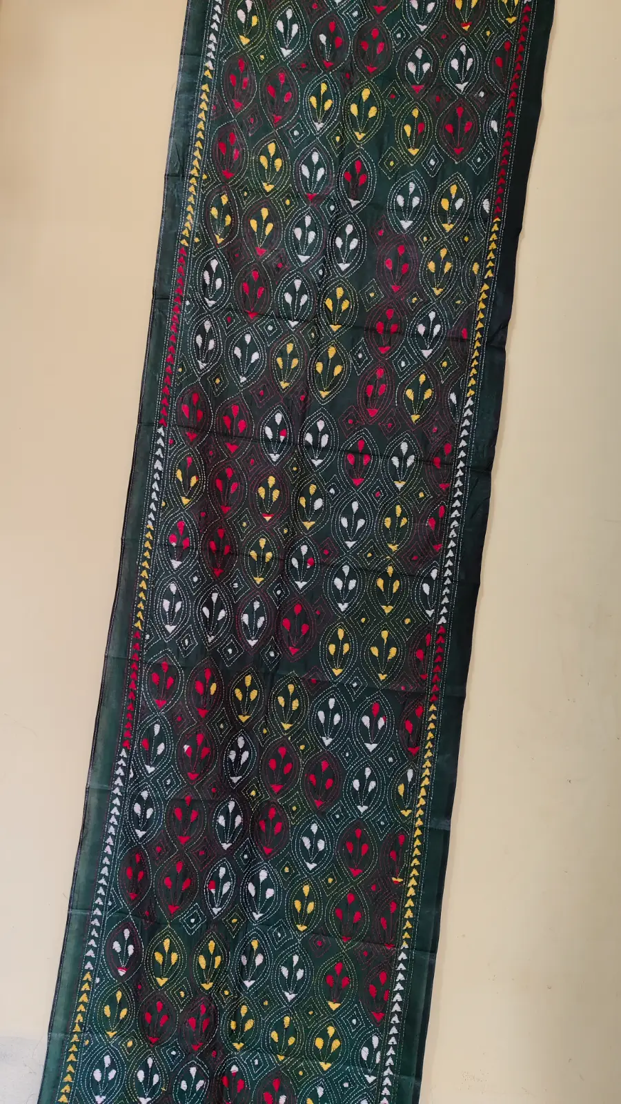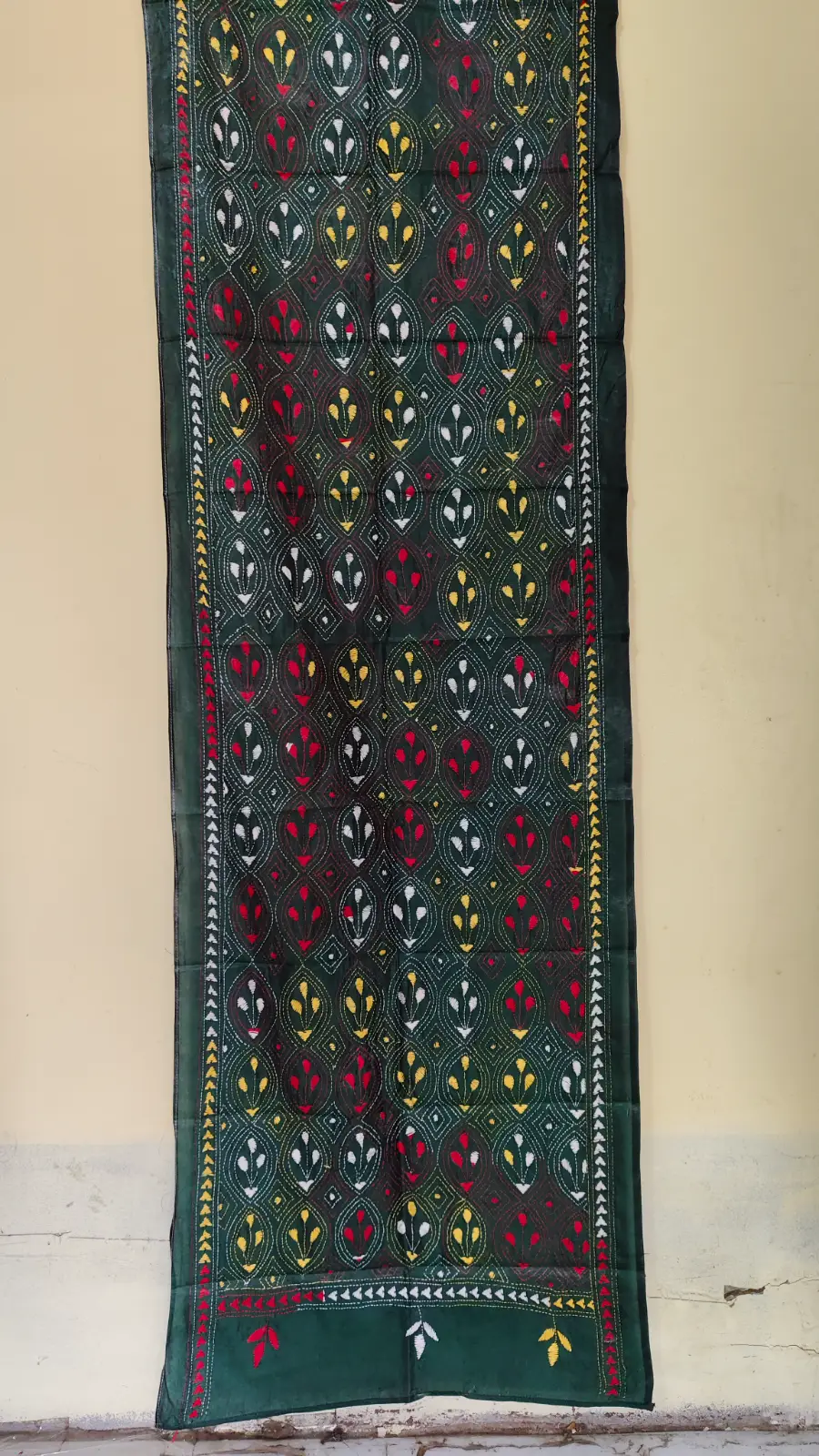 Emerald Green Silk Kantha Stitch Stole – Geometric Tribal Embroidery