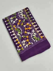 Make a bold statement with this emerald green silk Kantha stitch stole, beautifully hand embroidered with intricate geometric and tribal motifs. Alternating rows of white floral designs create a rhythmic design that effortlessly stands out. A hint of tribal beauty wrapped in soft silk – ideal for ethnic and casual occasions.