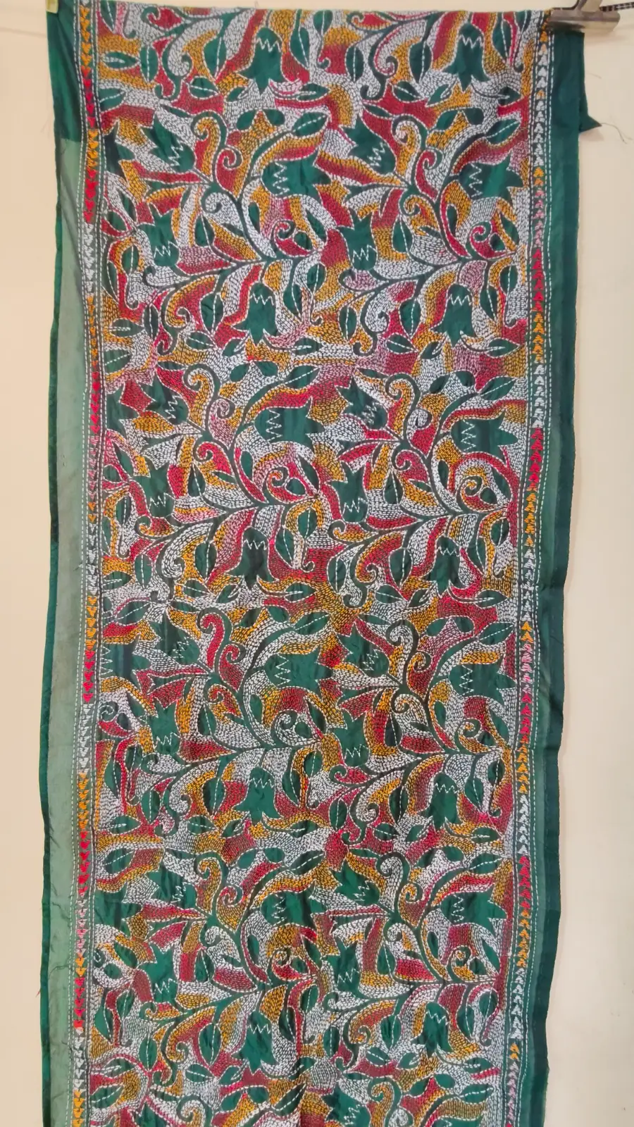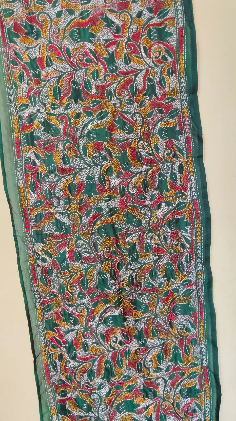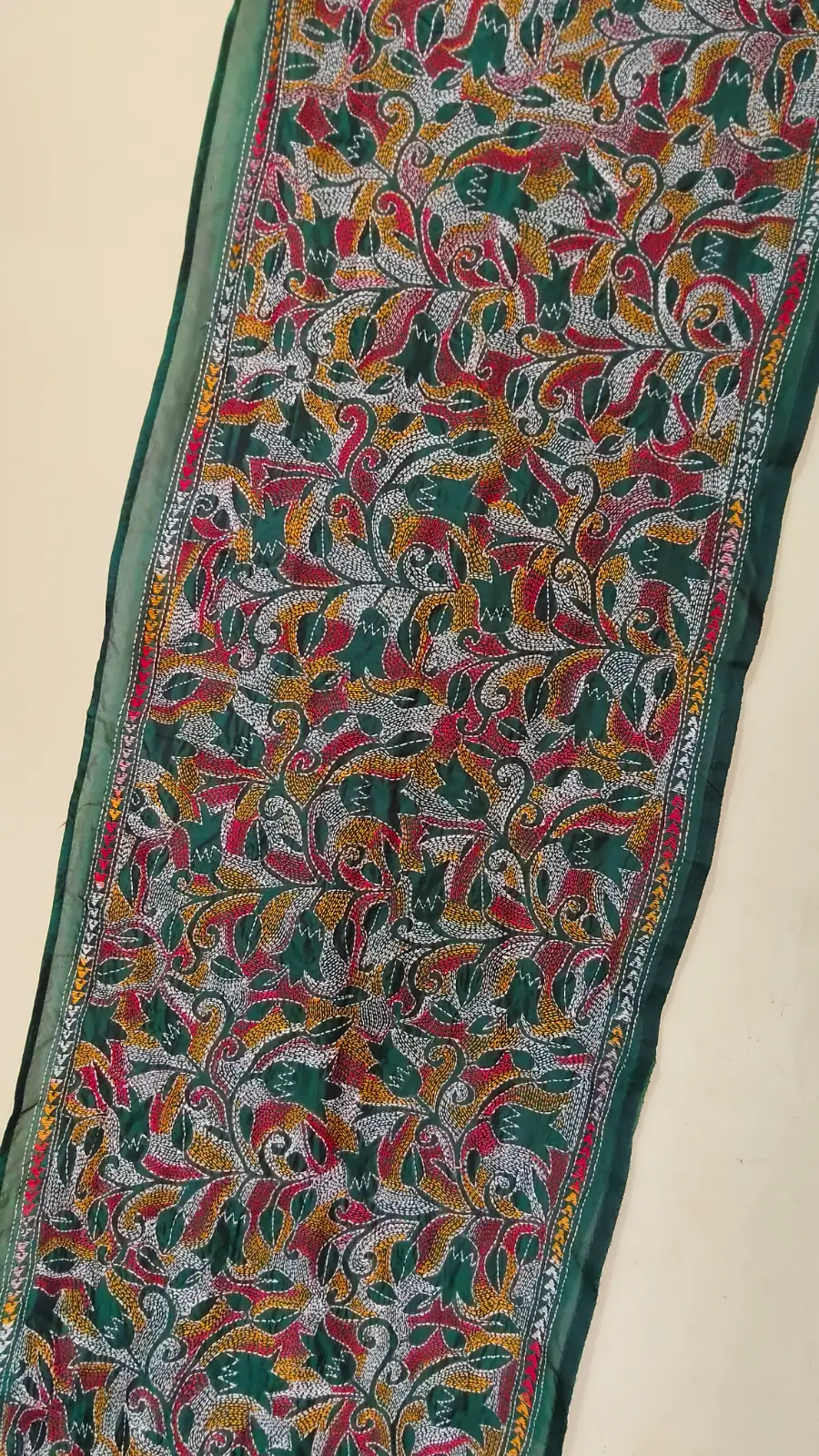 Forest Green Silk Kantha Stitch Stole – Floral Embroidery