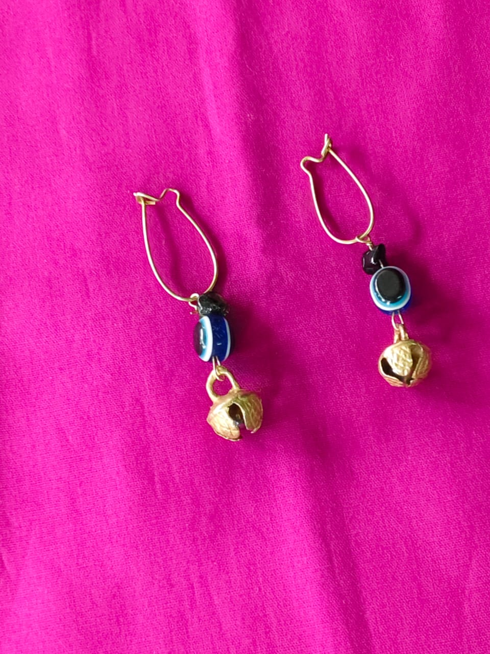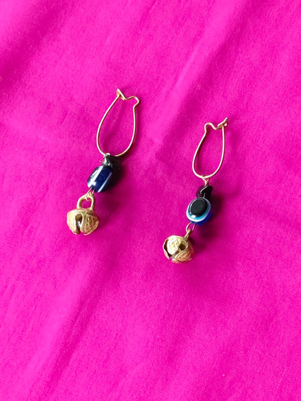 Handmade brass teardrop hoops accented with sunny Black and white mix Stone and tiny dokra/ghungroo bell charms. Light, antique-gold finish with a gentle jingle—easy everyday statement for ethnic or boho looks