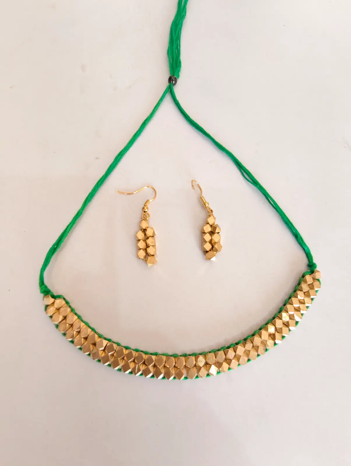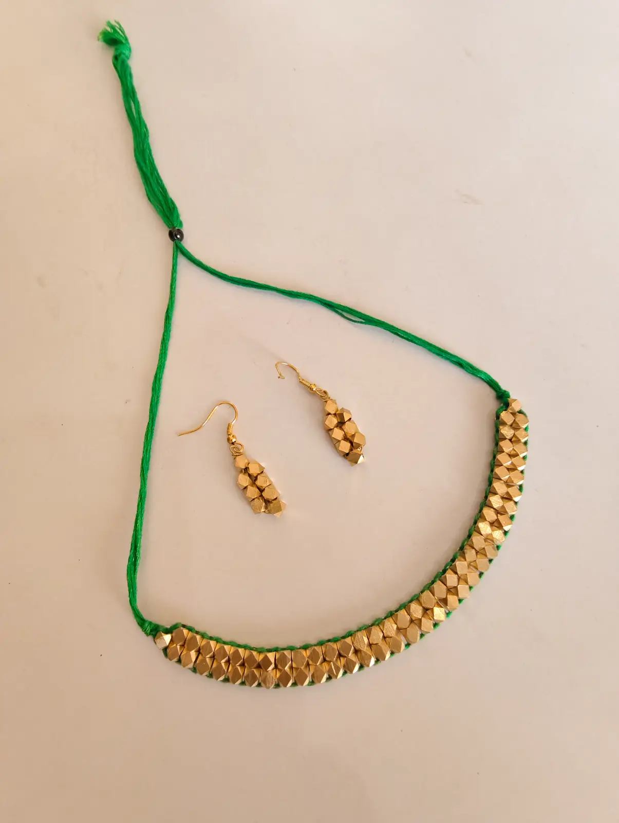 Golden Beads Choker Necklace Set with Matching Earrings – Green Thread Design